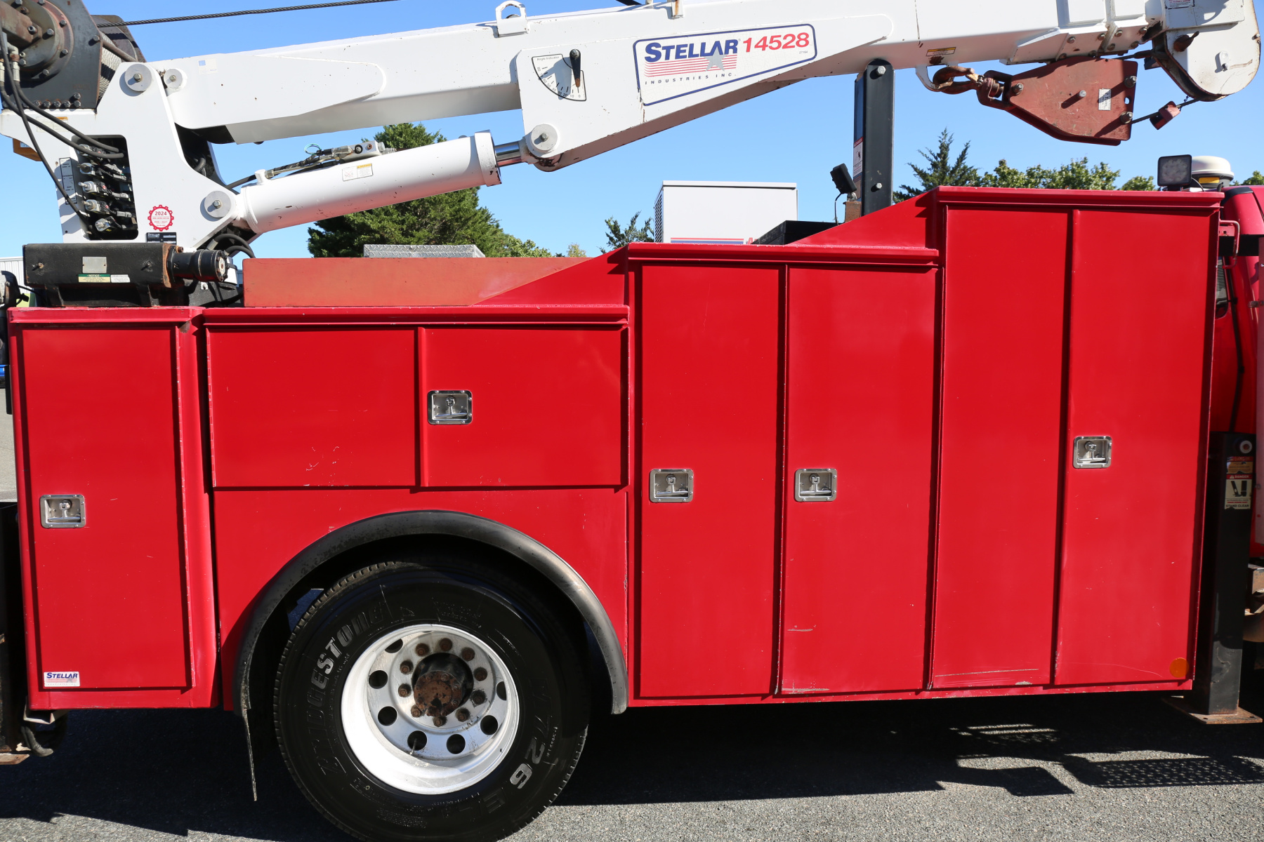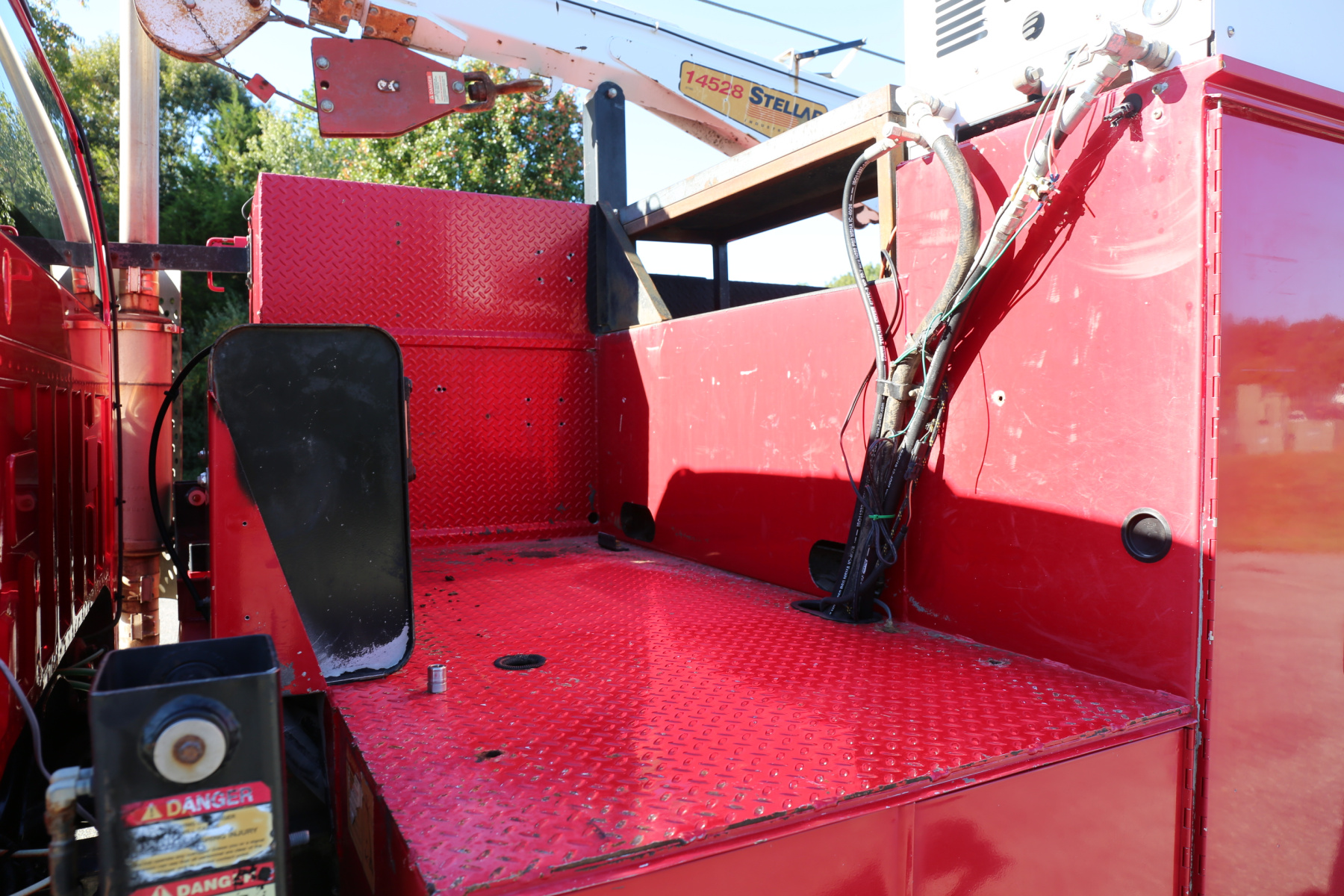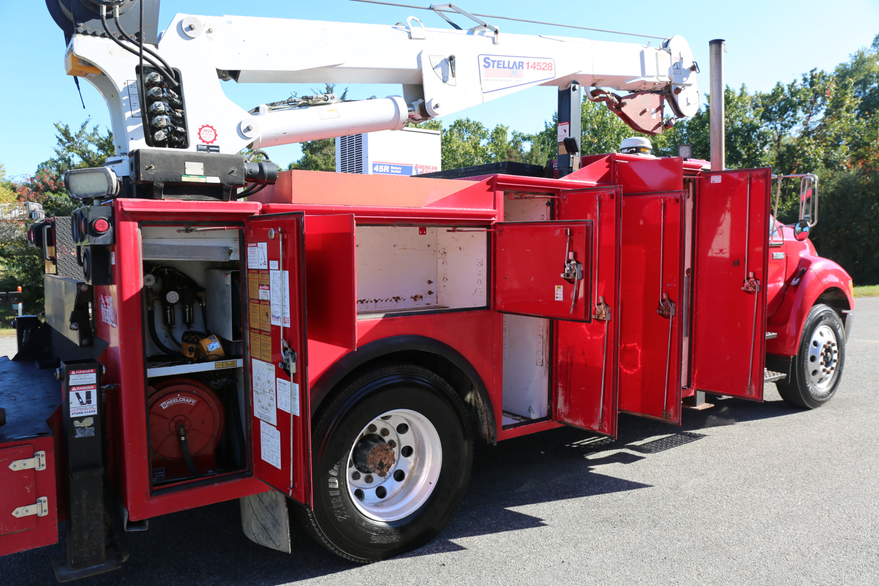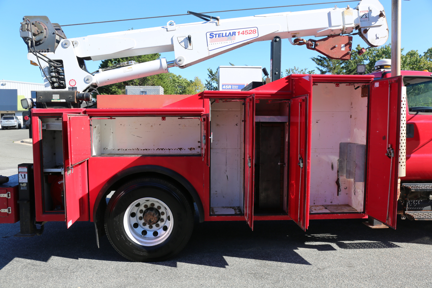 Showing 206,006 miles at the time of this writing. Equipped with a hard to find 14528 Stellar 14,000# capacity crane, mounted on a 14′ Stellar service body. 45R hydraulic compressor showing 124 total hours.