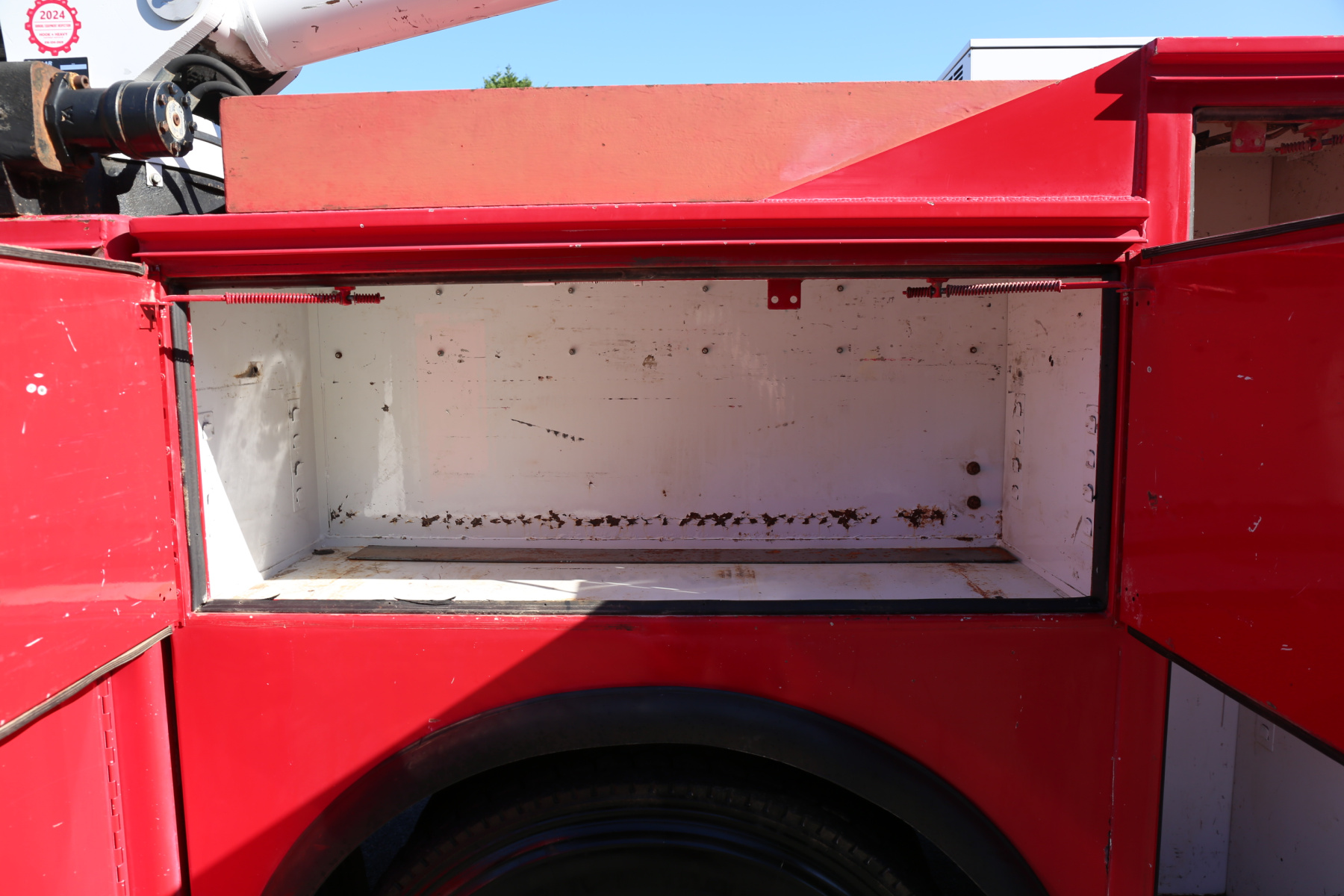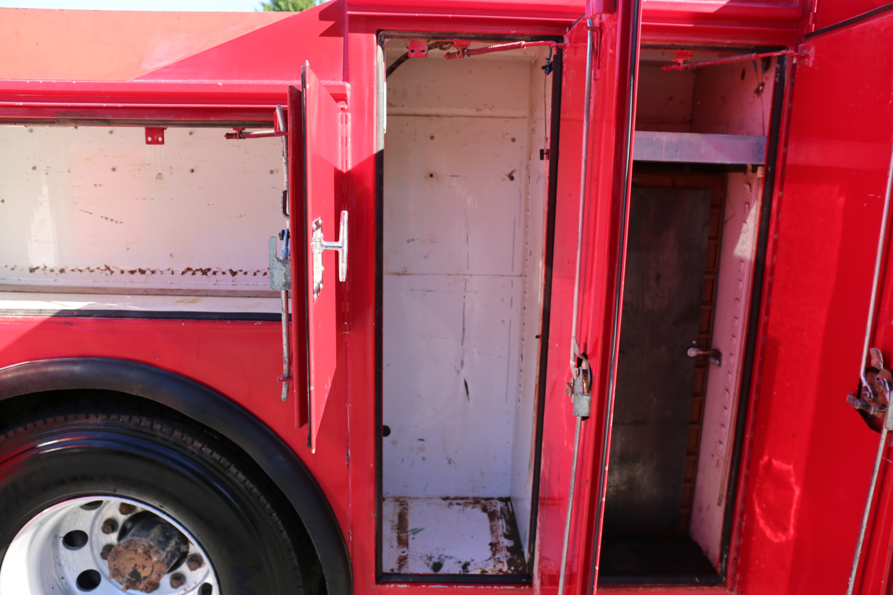 The crane compartment houses a Reelcraft hose reel and one shelf. The passenger wheel well compartment is open with no shelving. No shelves in the P3 compartment. The P2 compartment has a full set of bolt drawers. Torch bottle racks in the P1 compartment.