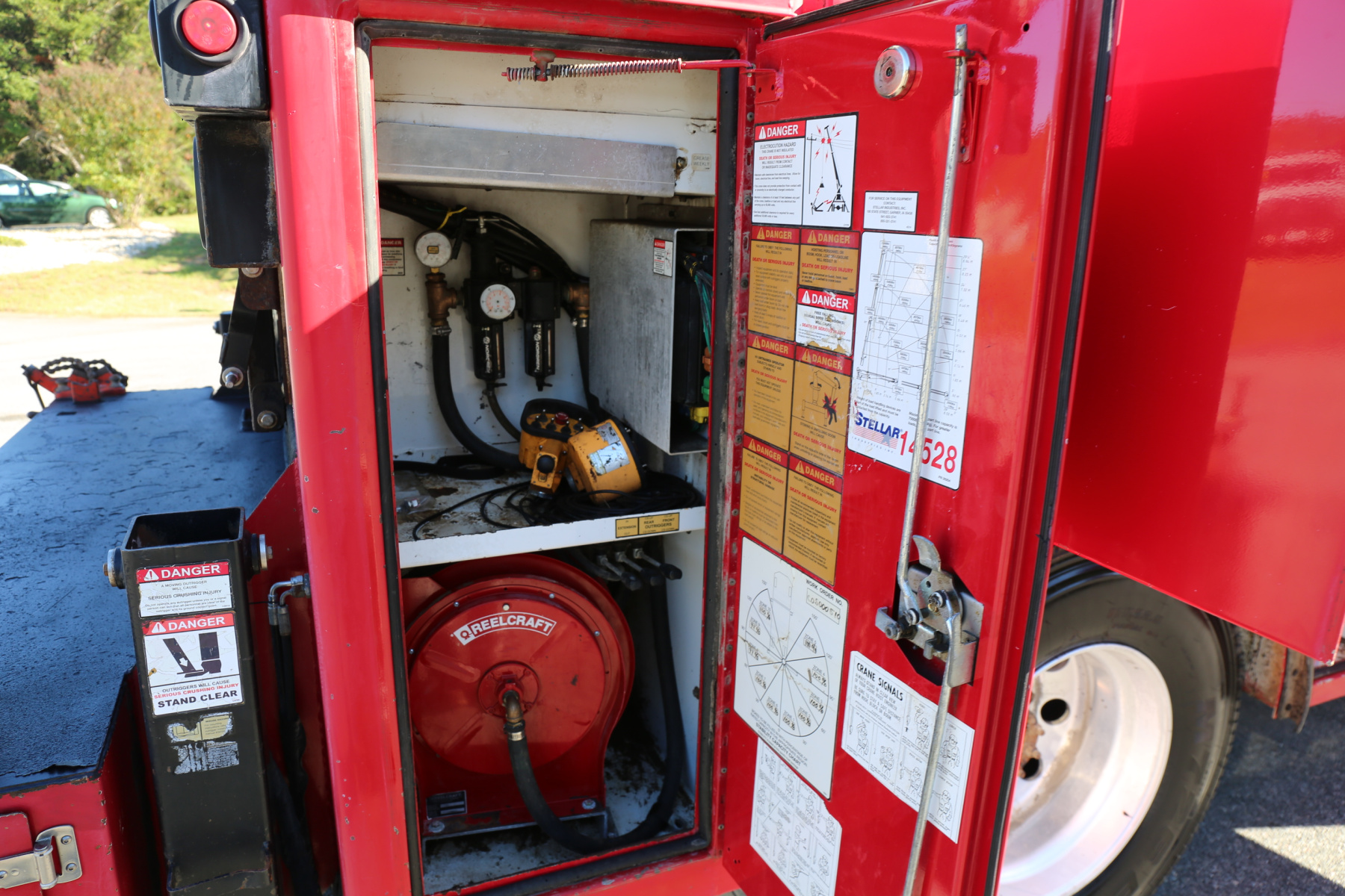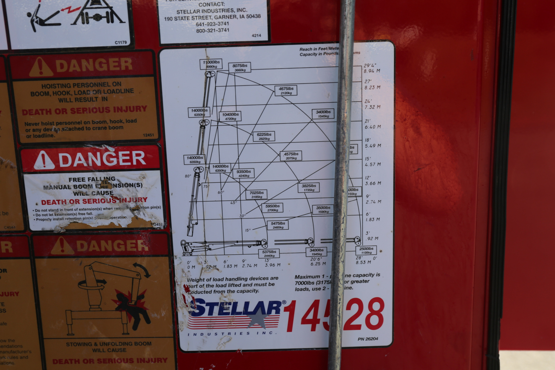 The crane is a Stellar 14528, with a 14,000# maximum lifting capacity and a two stage hydraulic extension out to 28′ of total reach. Run off a factory wireless remote, crane works as it should.