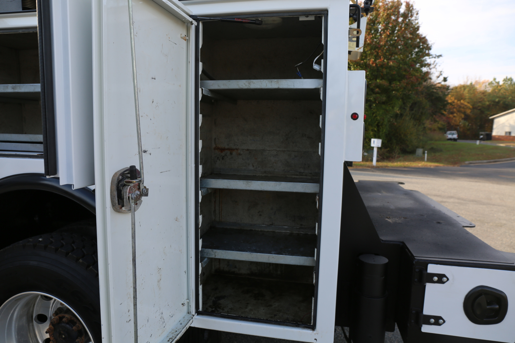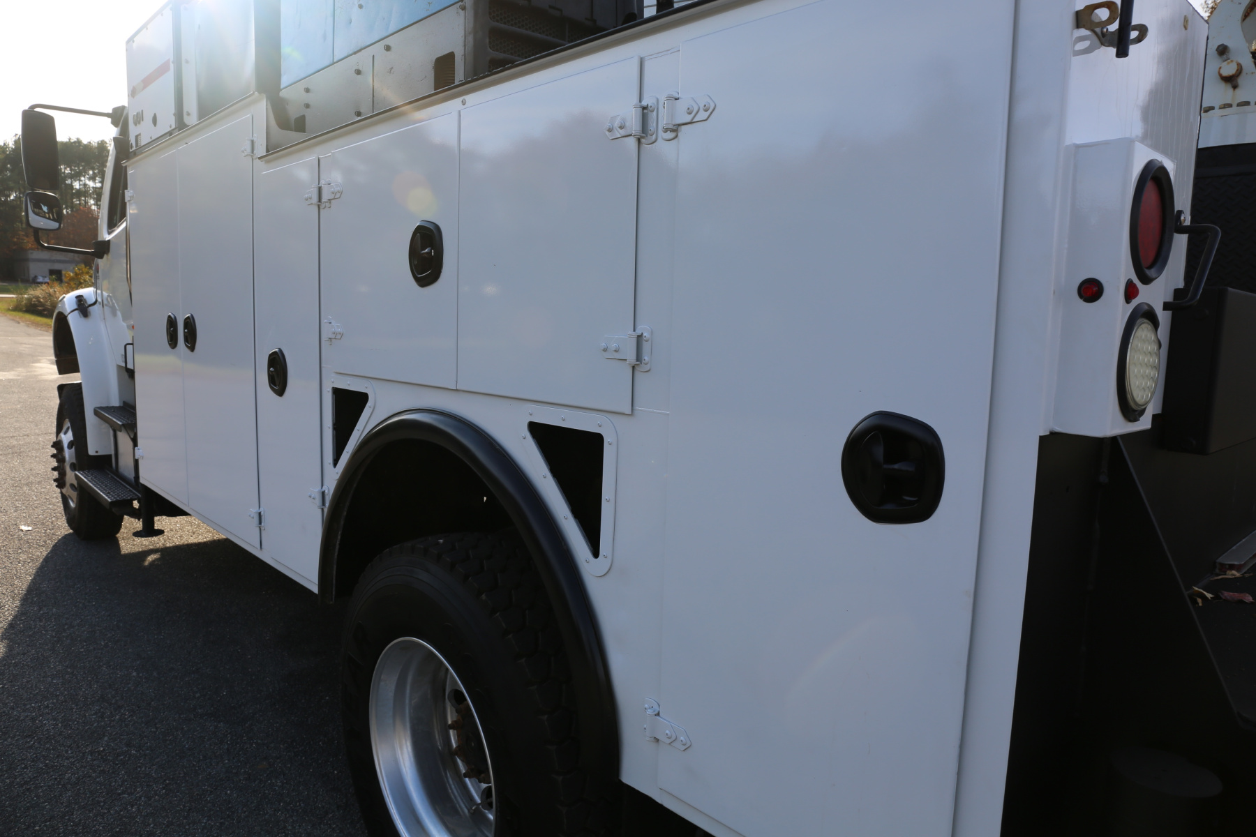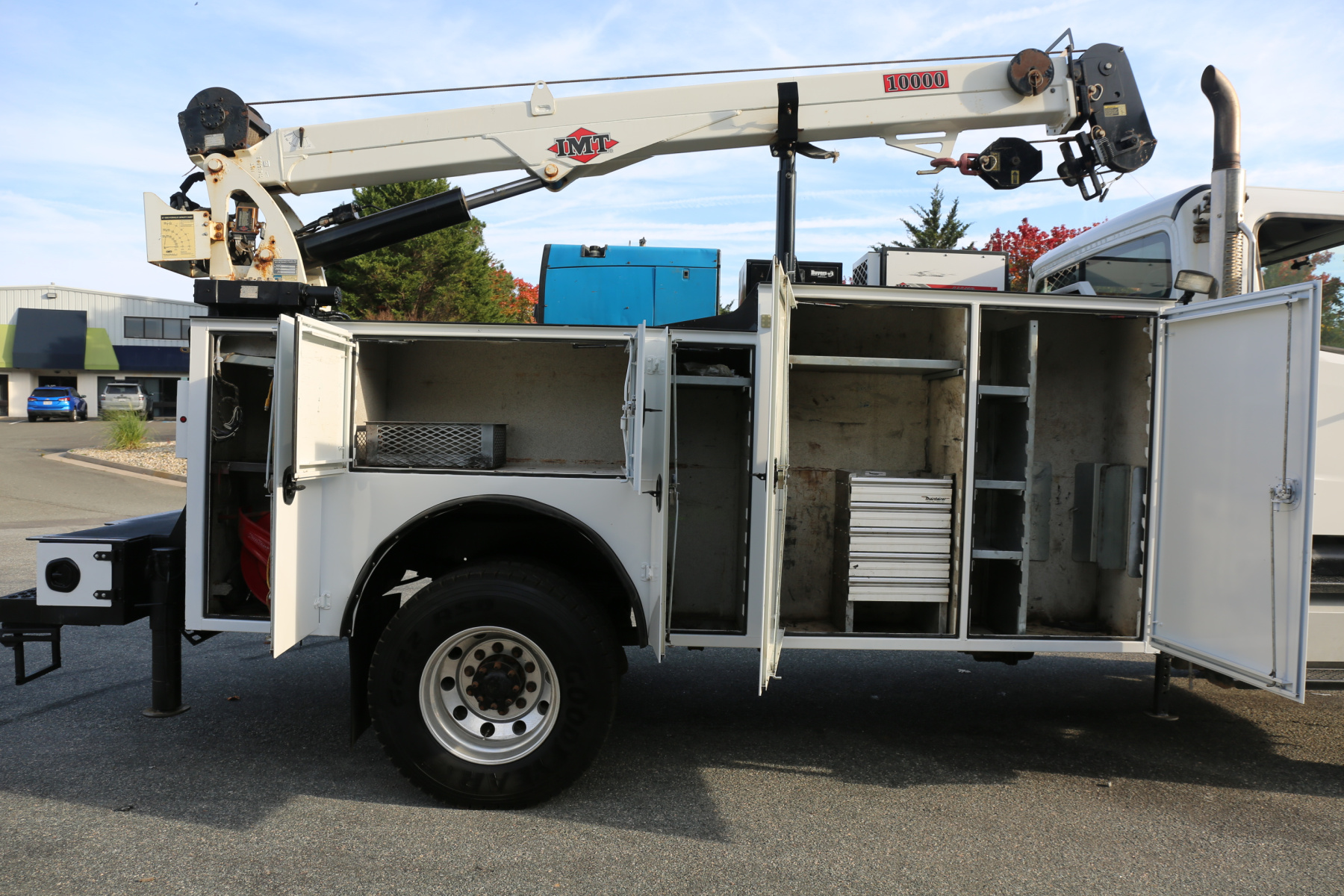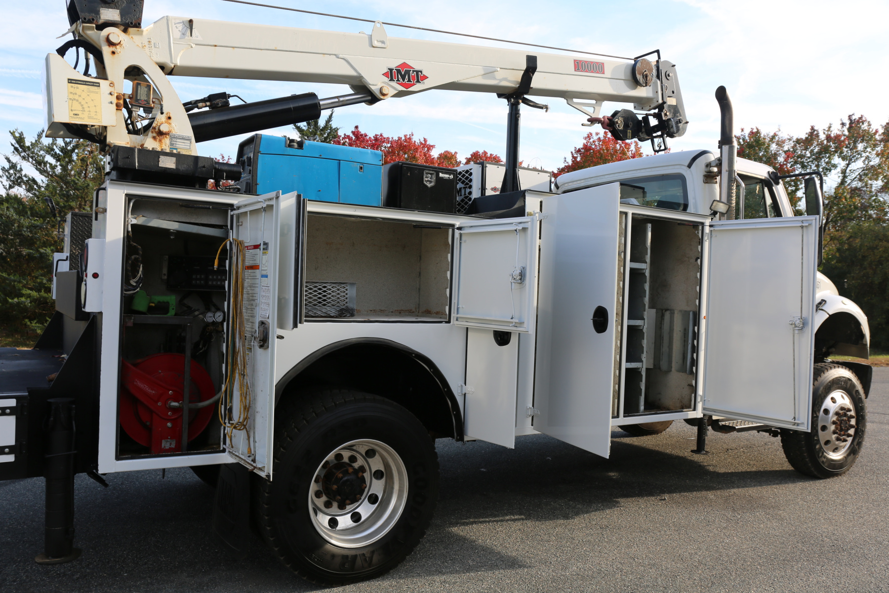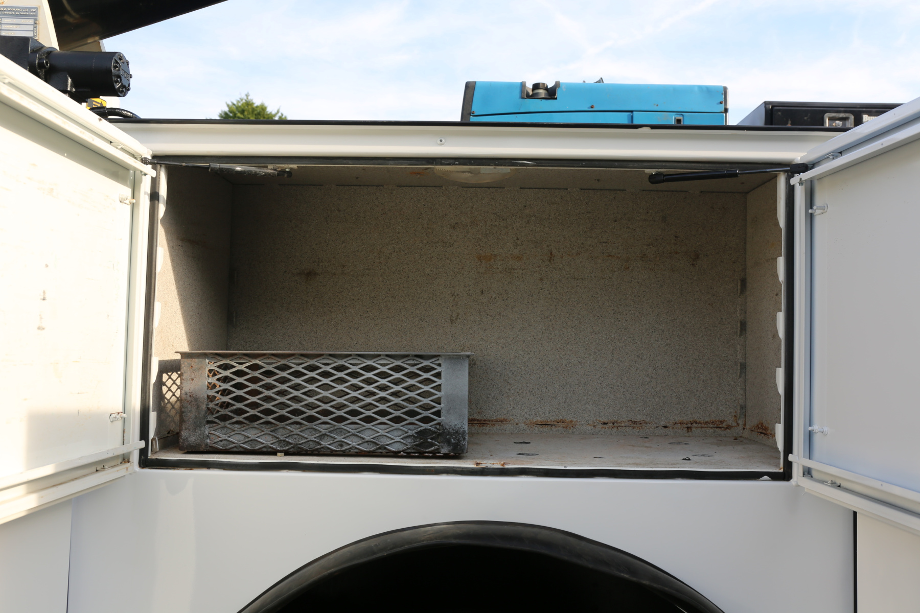 The bed is a 14′ IMT service body – the exterior of the bed was just sandblasted and repainted, and shows like new. New bedliner applied to the work bench rear bumper. Interior compartment lighting throughout, as well as exterior LED work lights and boom lighting. All of the doors close, latch, and lock as they should. All lighting is operational.