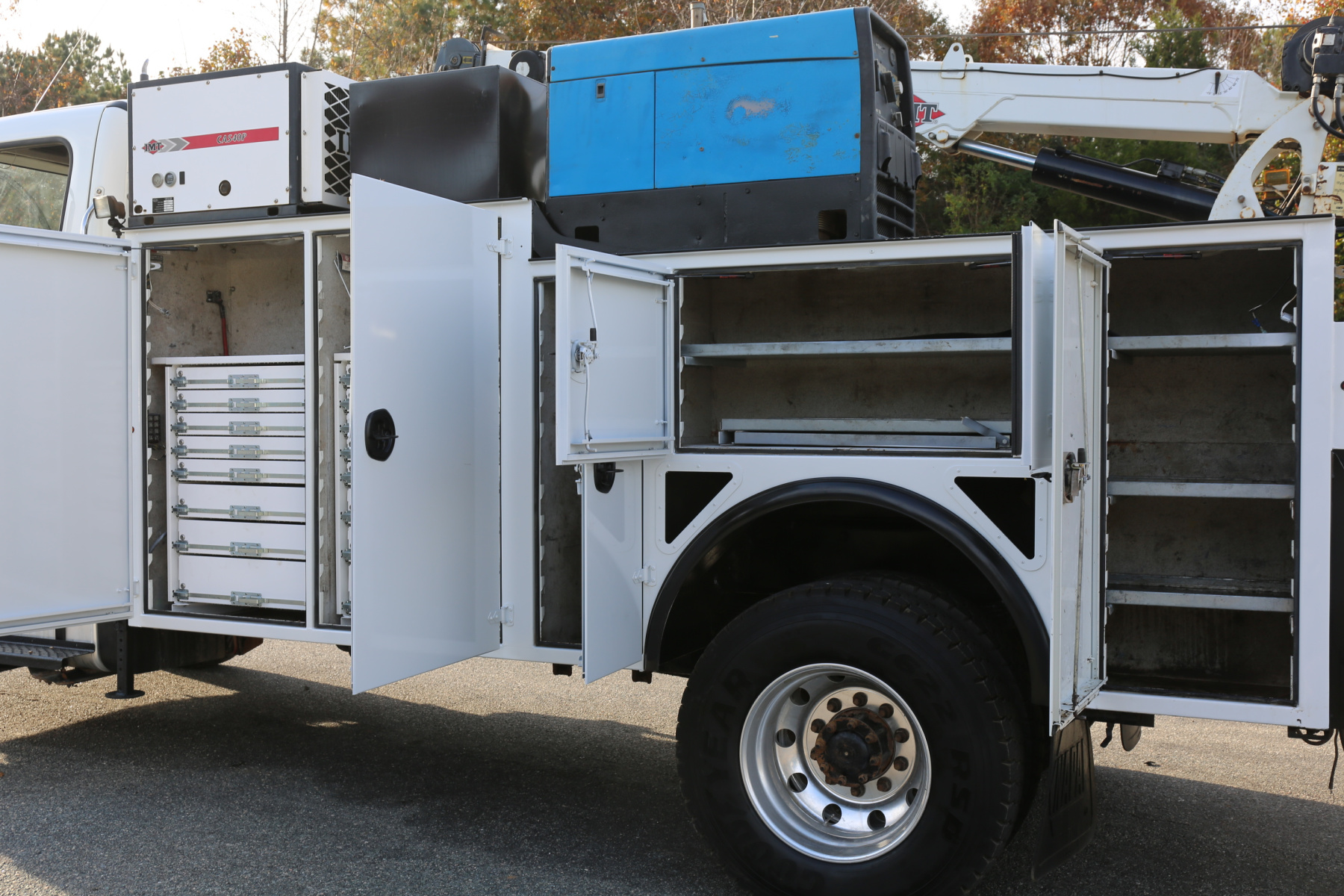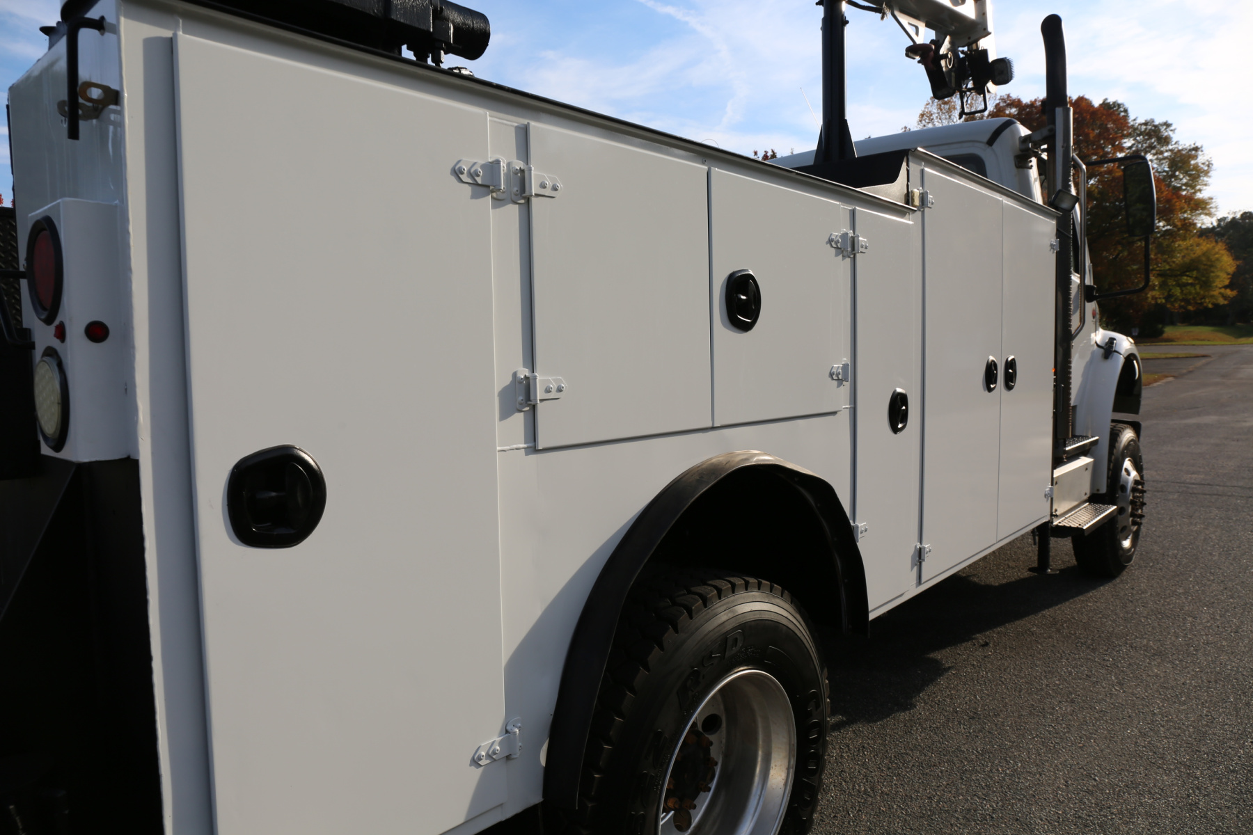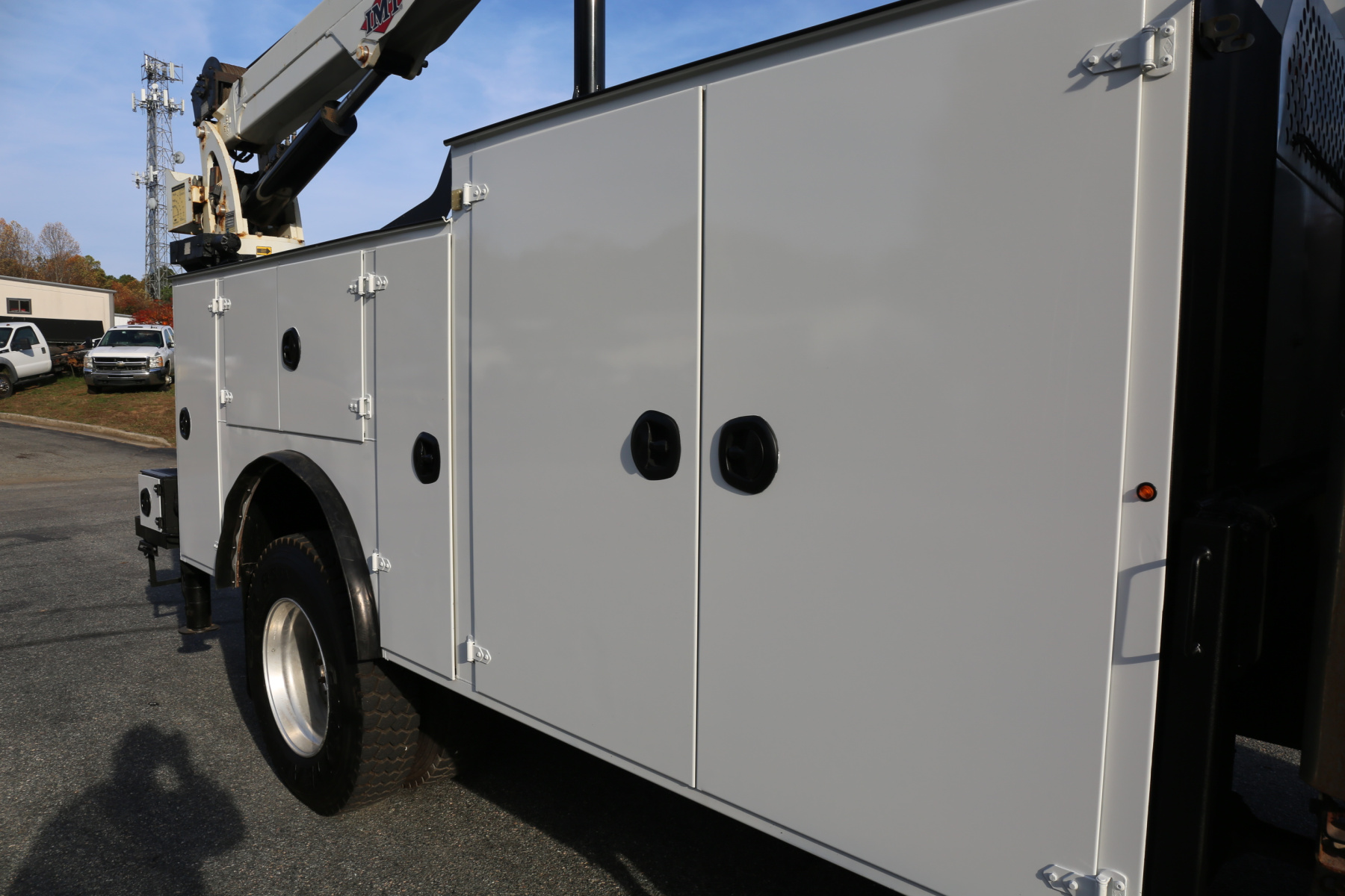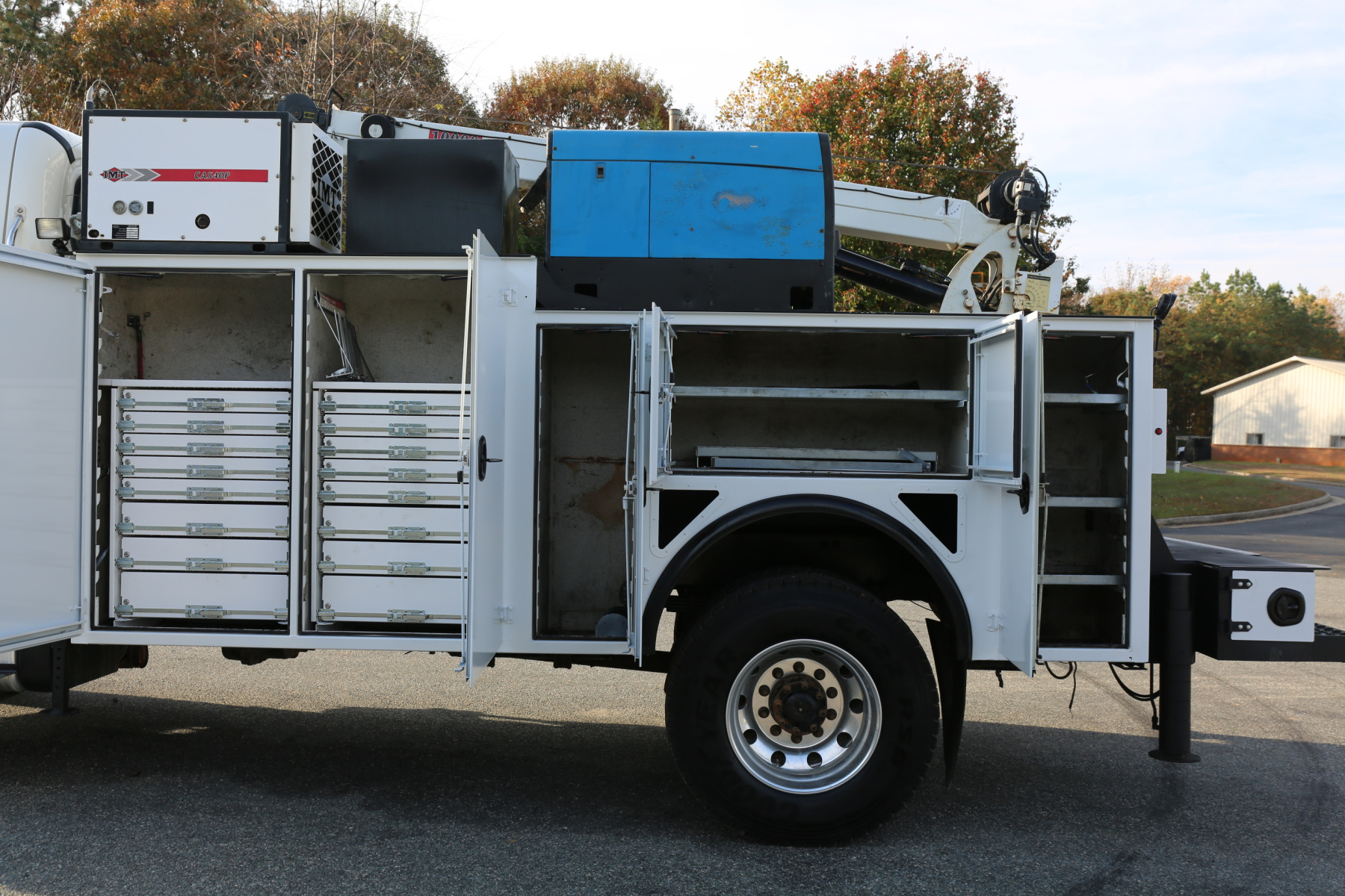 The bed is a 14′ IMT service body – the exterior of the bed was just sandblasted and repainted, and shows like new. New bedliner applied to the work bench rear bumper. Interior compartment lighting throughout, as well as exterior LED work lights and boom lighting. All of the doors close, latch, and lock as they should. All lighting is operational.