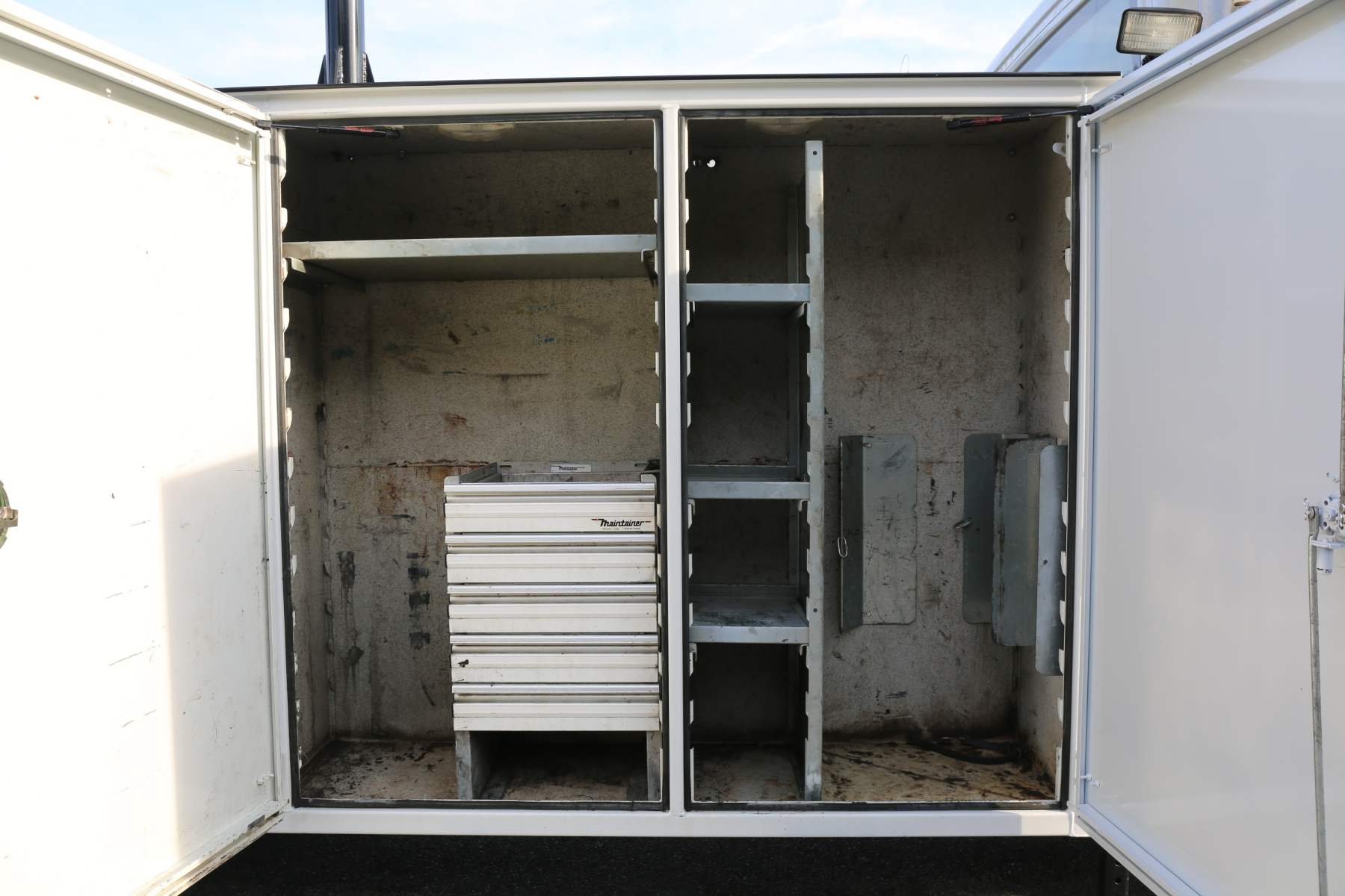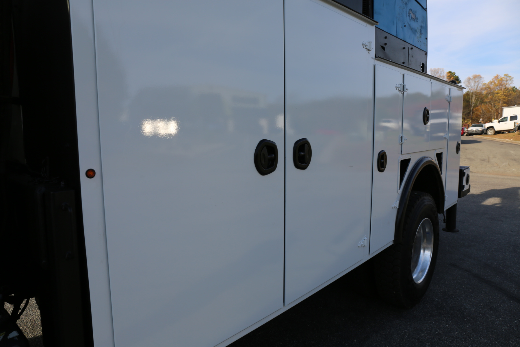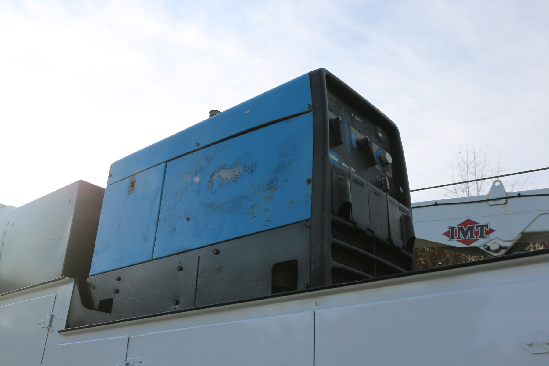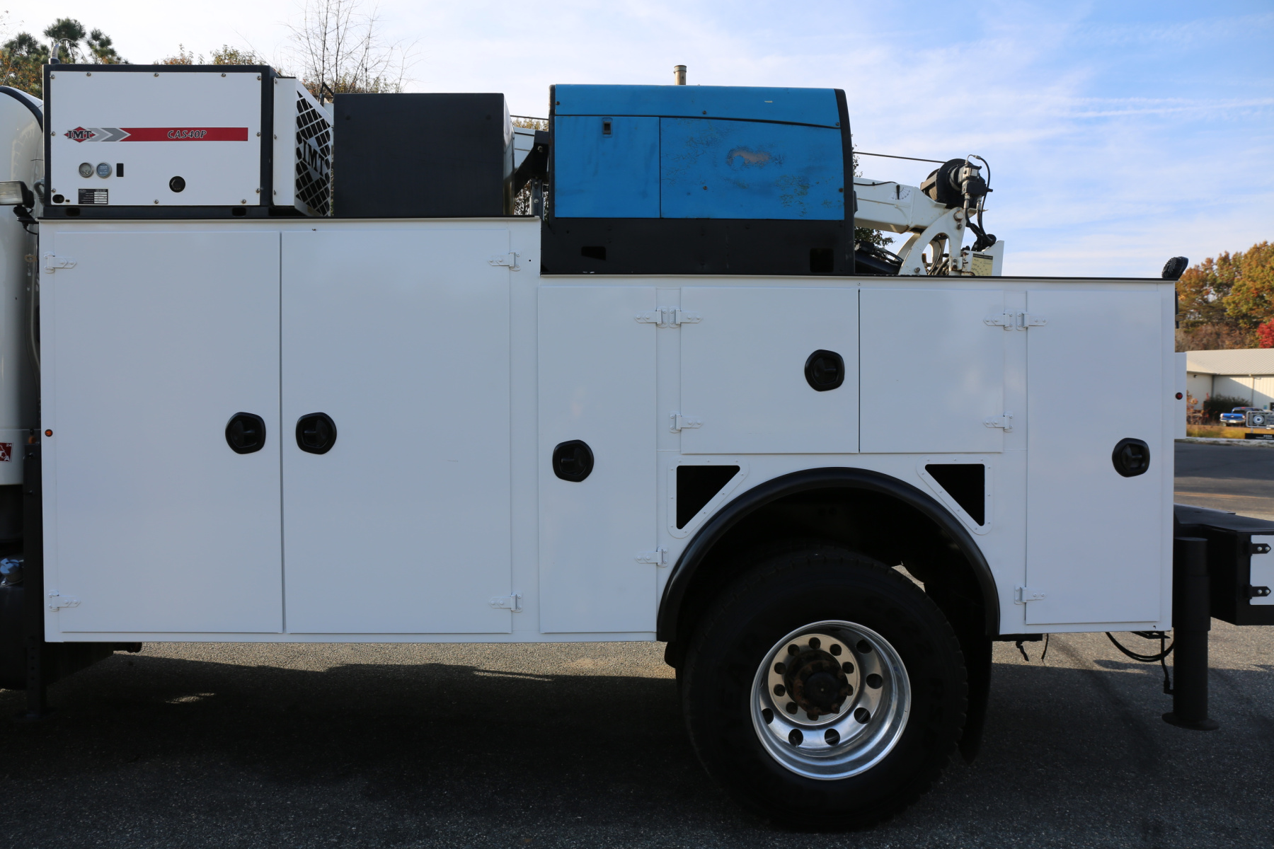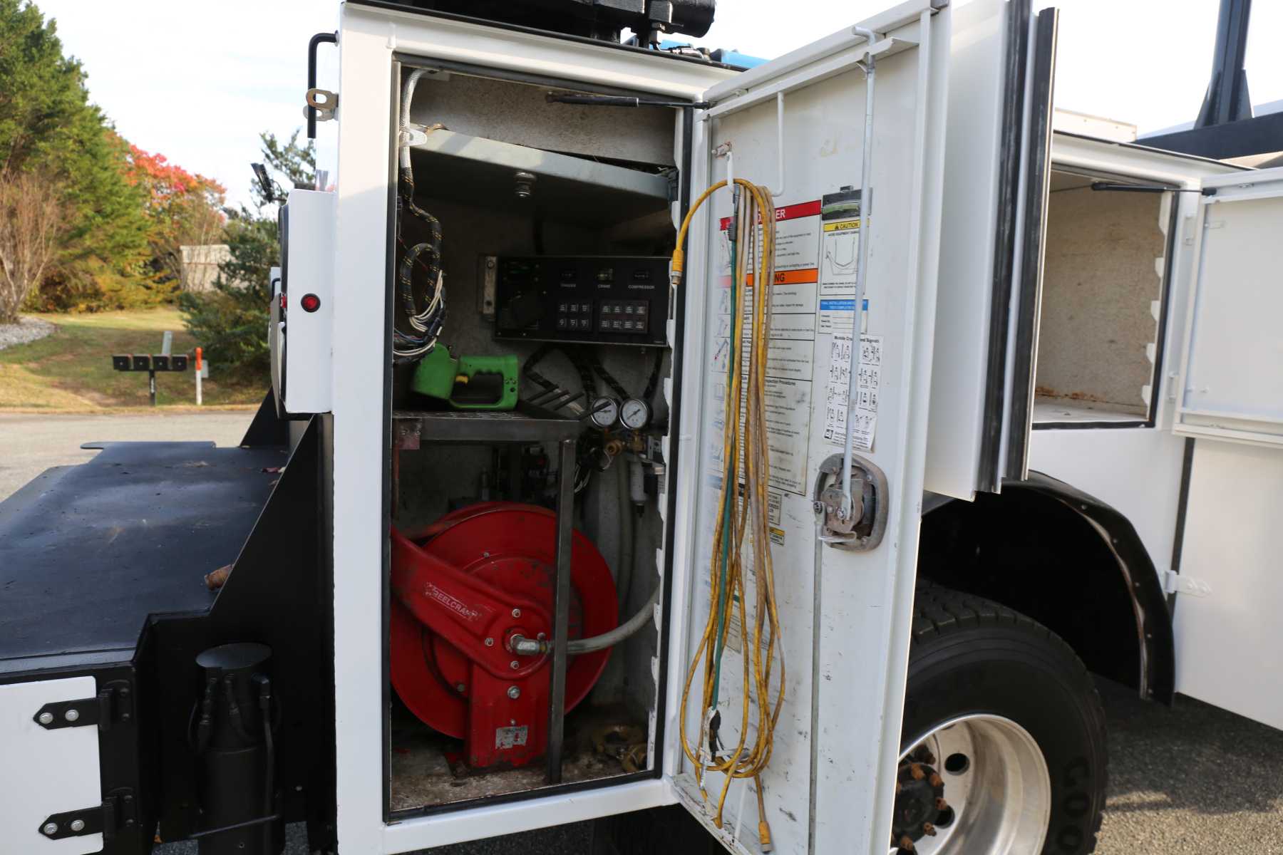 The bed is a 14′ IMT service body – the exterior of the bed was just sandblasted and repainted, and shows like new. New bedliner applied to the work bench rear bumper. Interior compartment lighting throughout, as well as exterior LED work lights and boom lighting. All of the doors close, latch, and lock as they should. All lighting is operational.