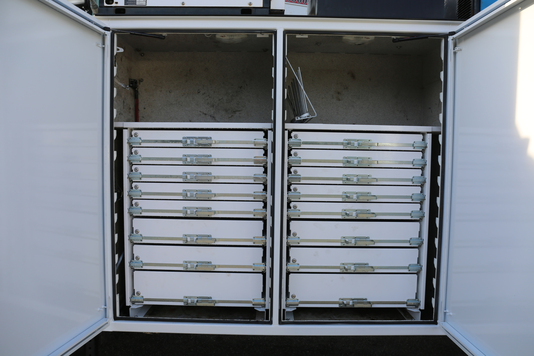 The D1 and D2 compartment each have a new set of IMT drawers, eight drawers total. The D3 compartment is open with no shelving. One shelf over the driver wheel well, and three shelves in the driver rear compartment.