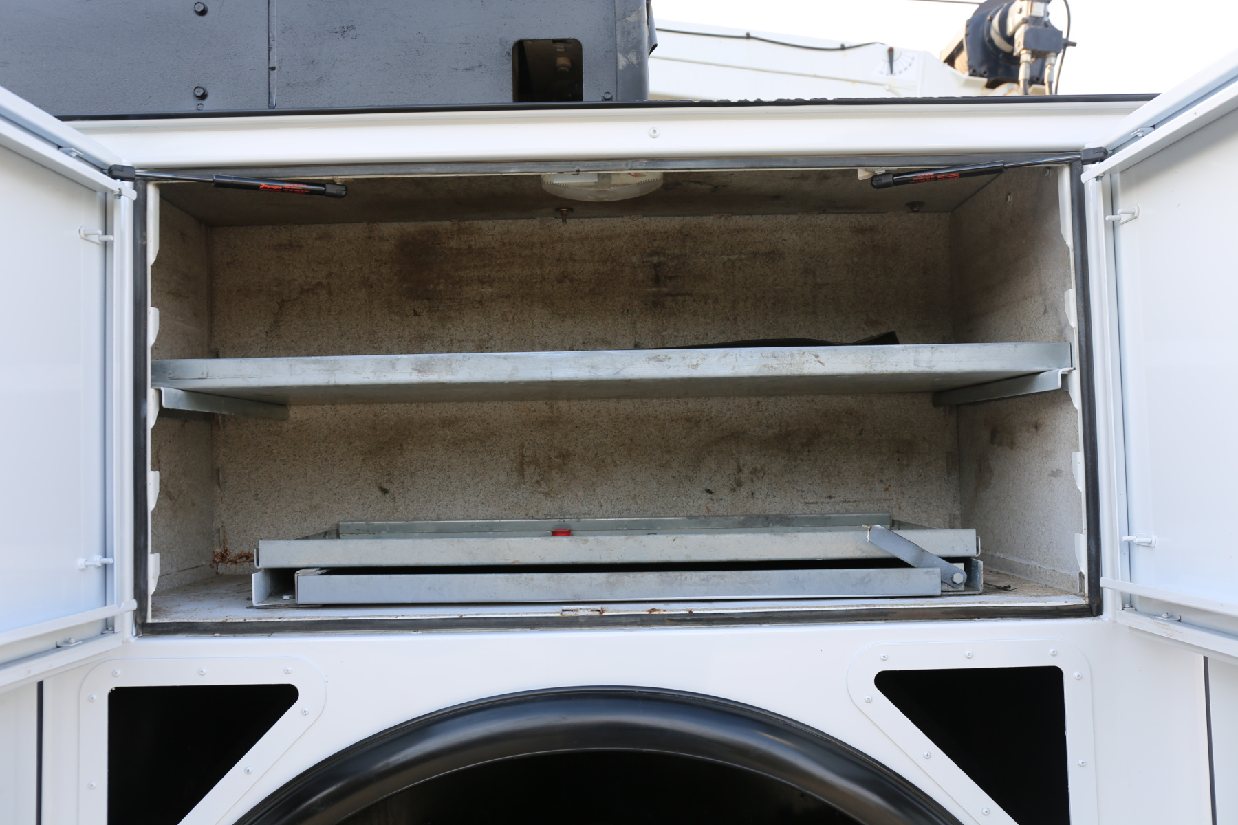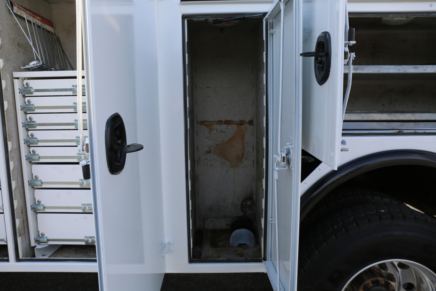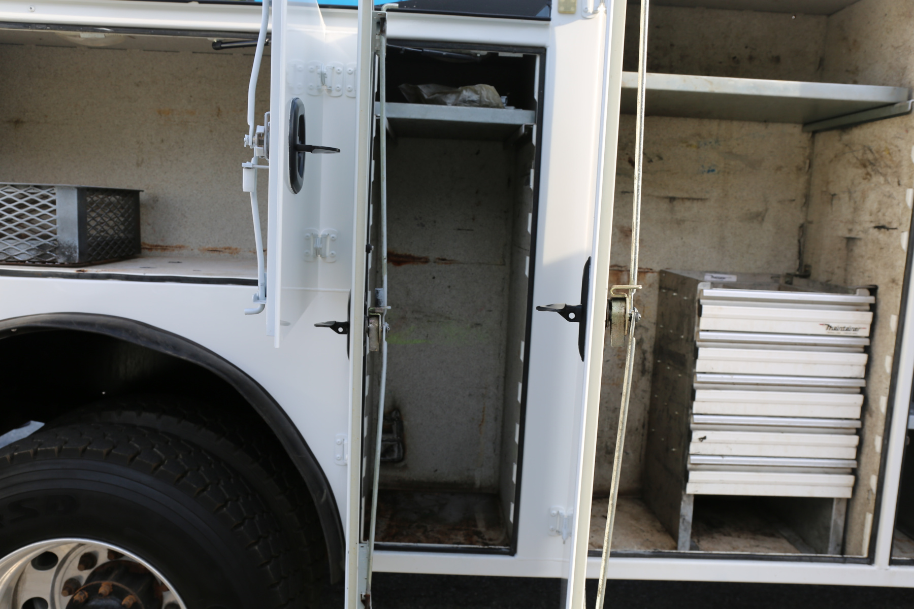 Work bench rear bumper with pass through bin storage and hydraulic outriggers. The crane compartment has one shelf, a Reelcraft hose reel, and the body control panel for the lighting and outriggers.