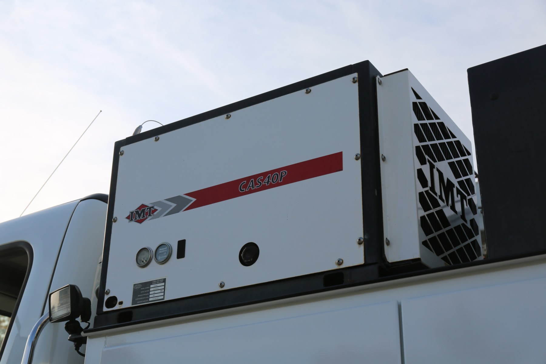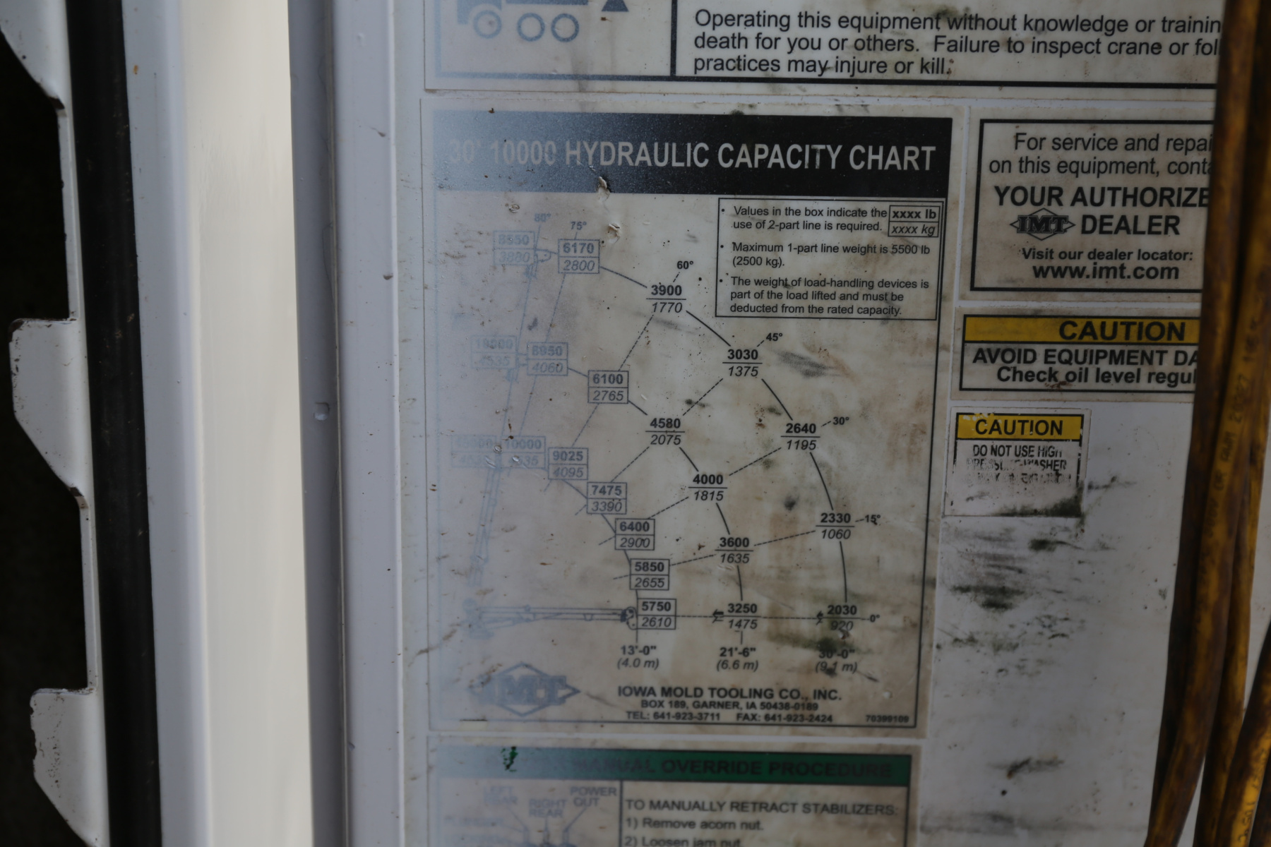 The crane is an IMT 10,000-30 series, run off a factory wireless remote. The remote controls the compressor, and can turn the truck on and off. 10,000# maximum lifting capacity, with a two stage extension out to 30′ of reach.