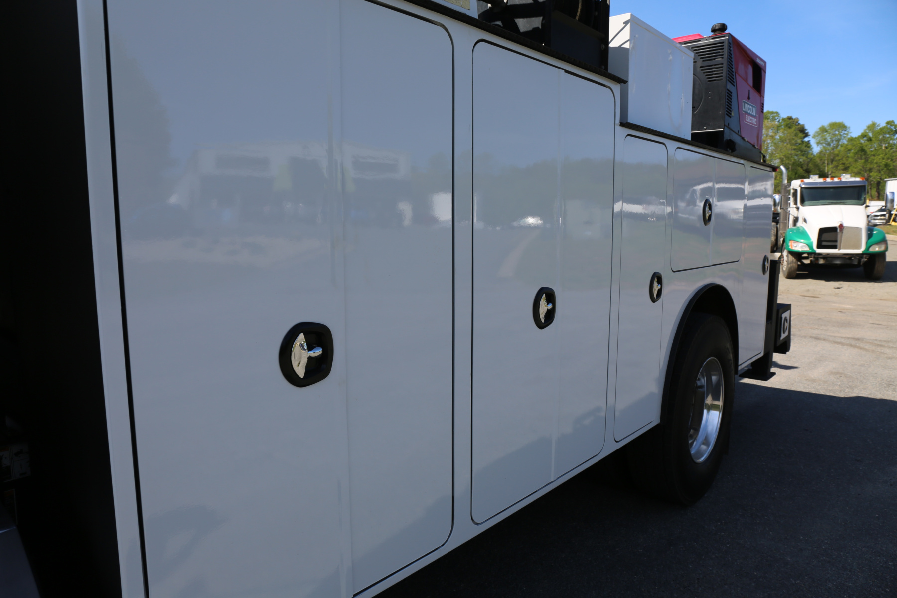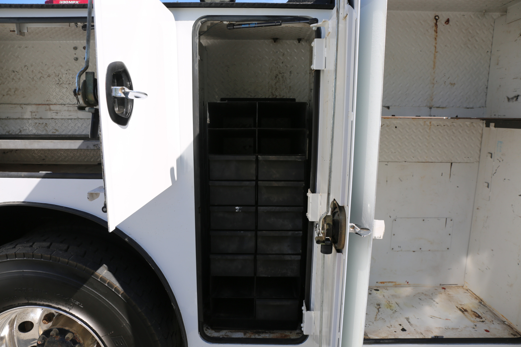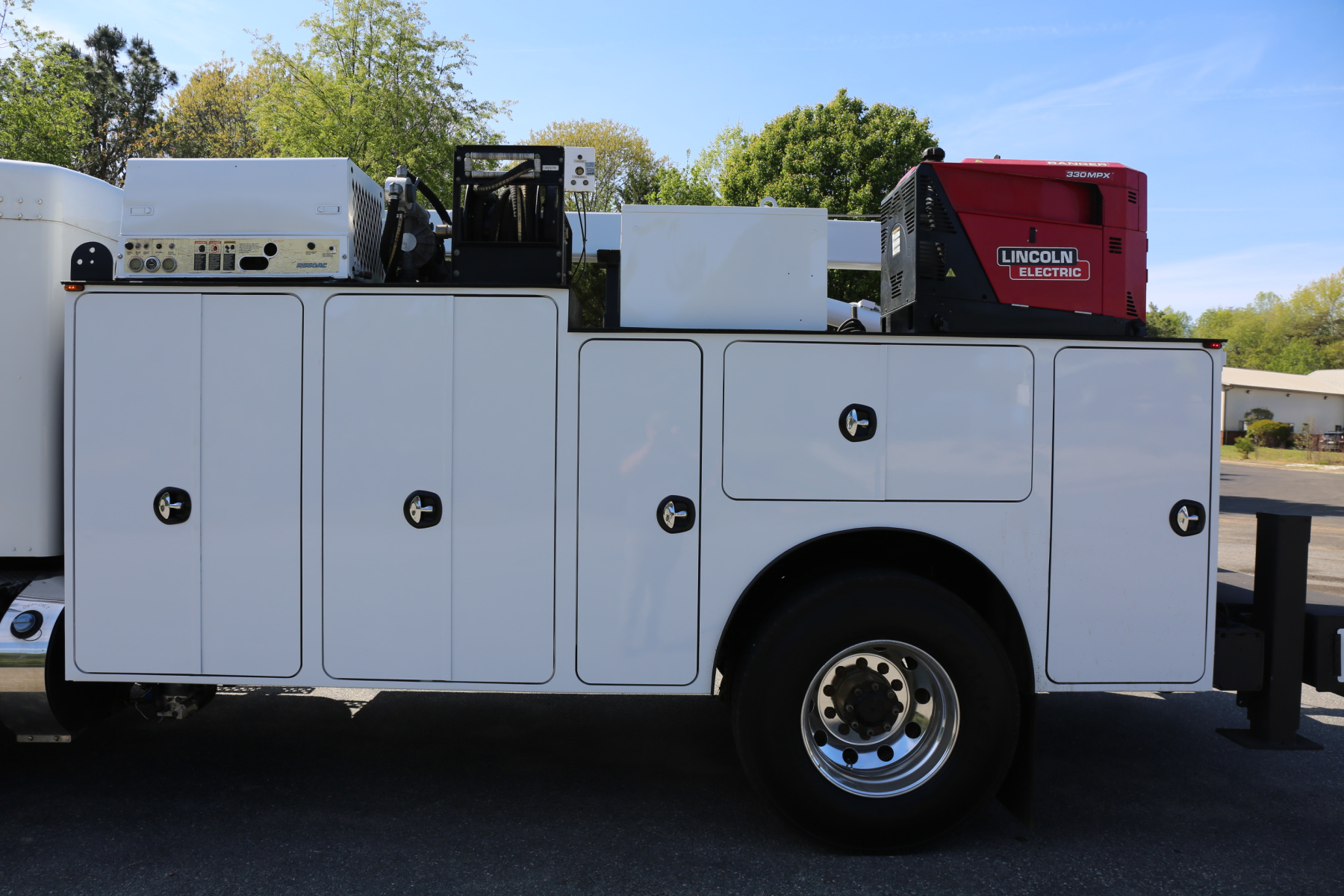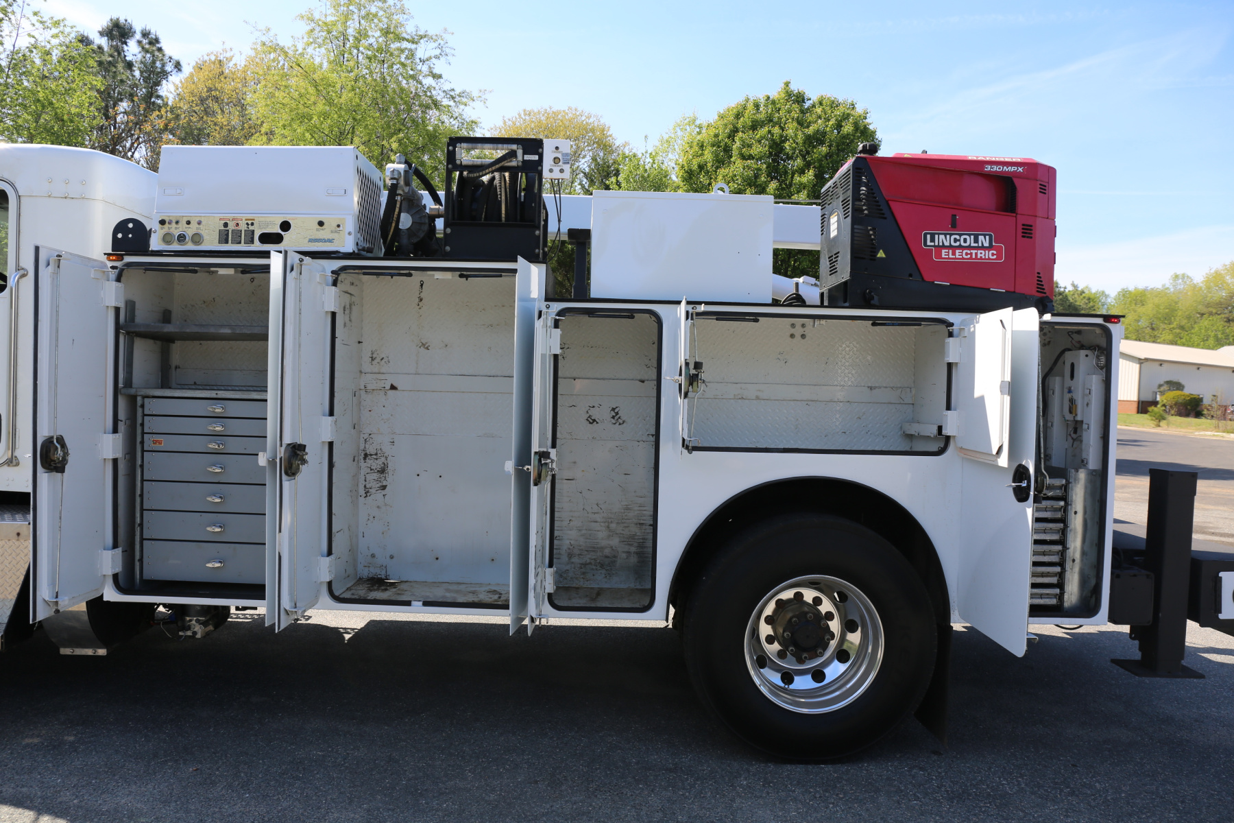 Well equipped with a 14′ Autocrane Titan Mechanics Body, one set of drawers, 14005H Crane, RS60AC hydraulic compressor, hydraulic outriggers, a Lincoln 330 MPX welder, and one waste oil tank in the bed.