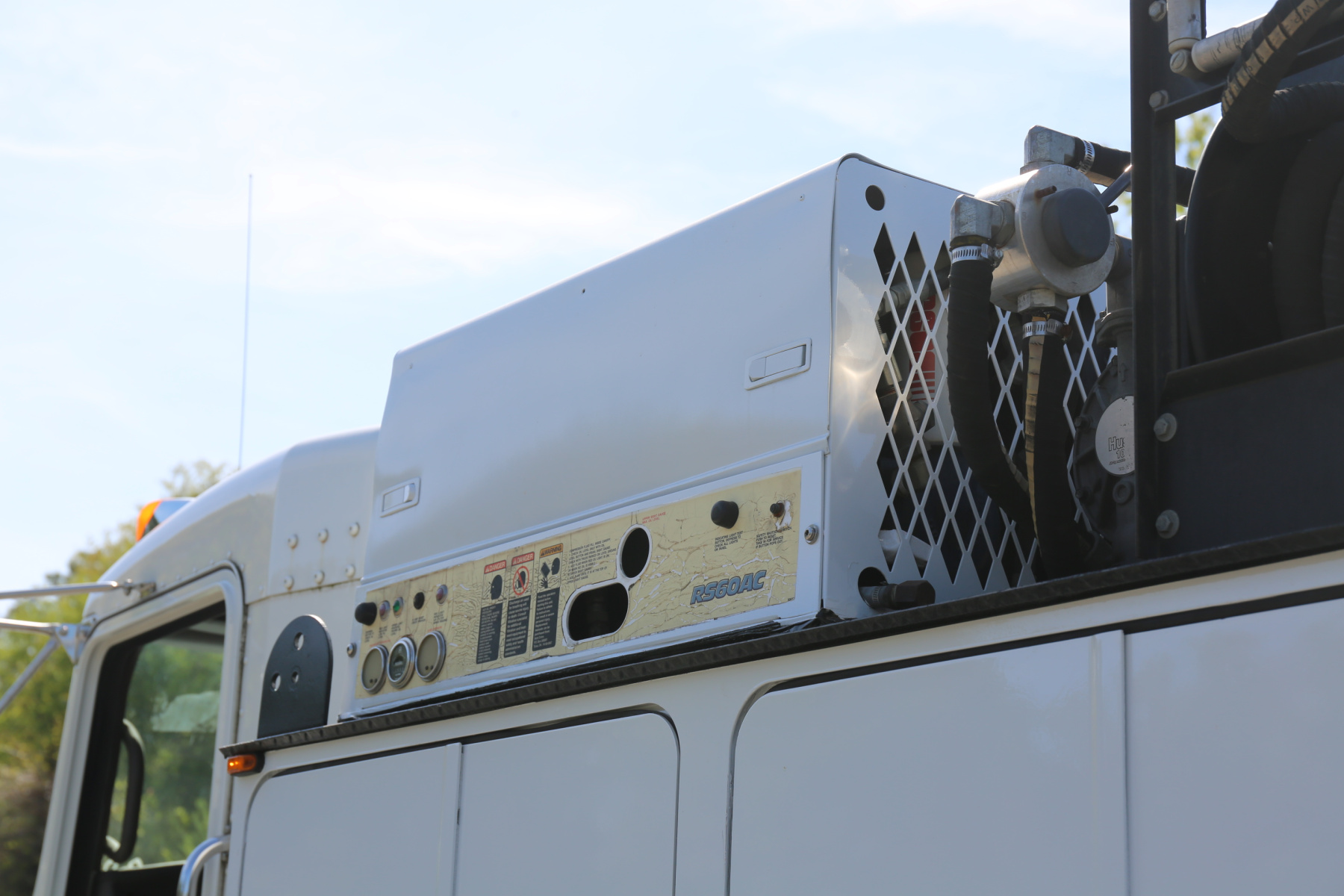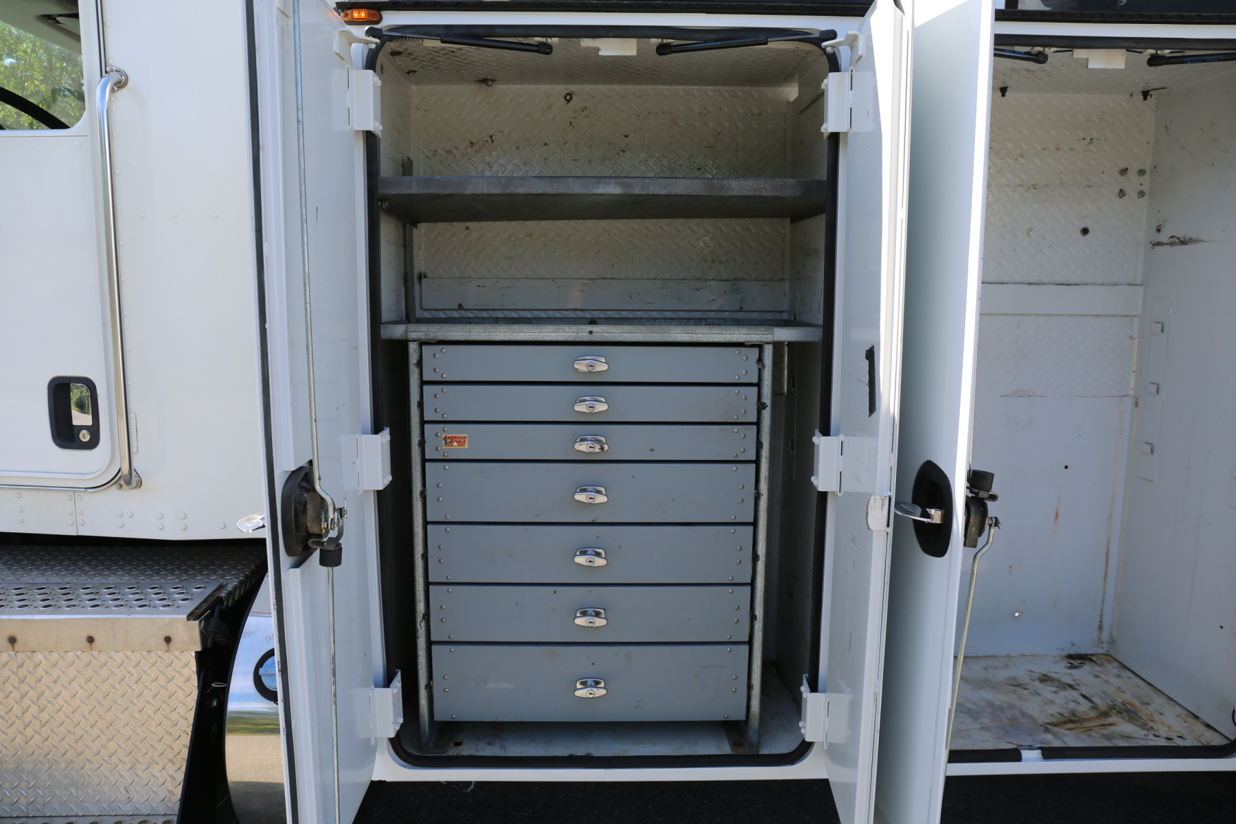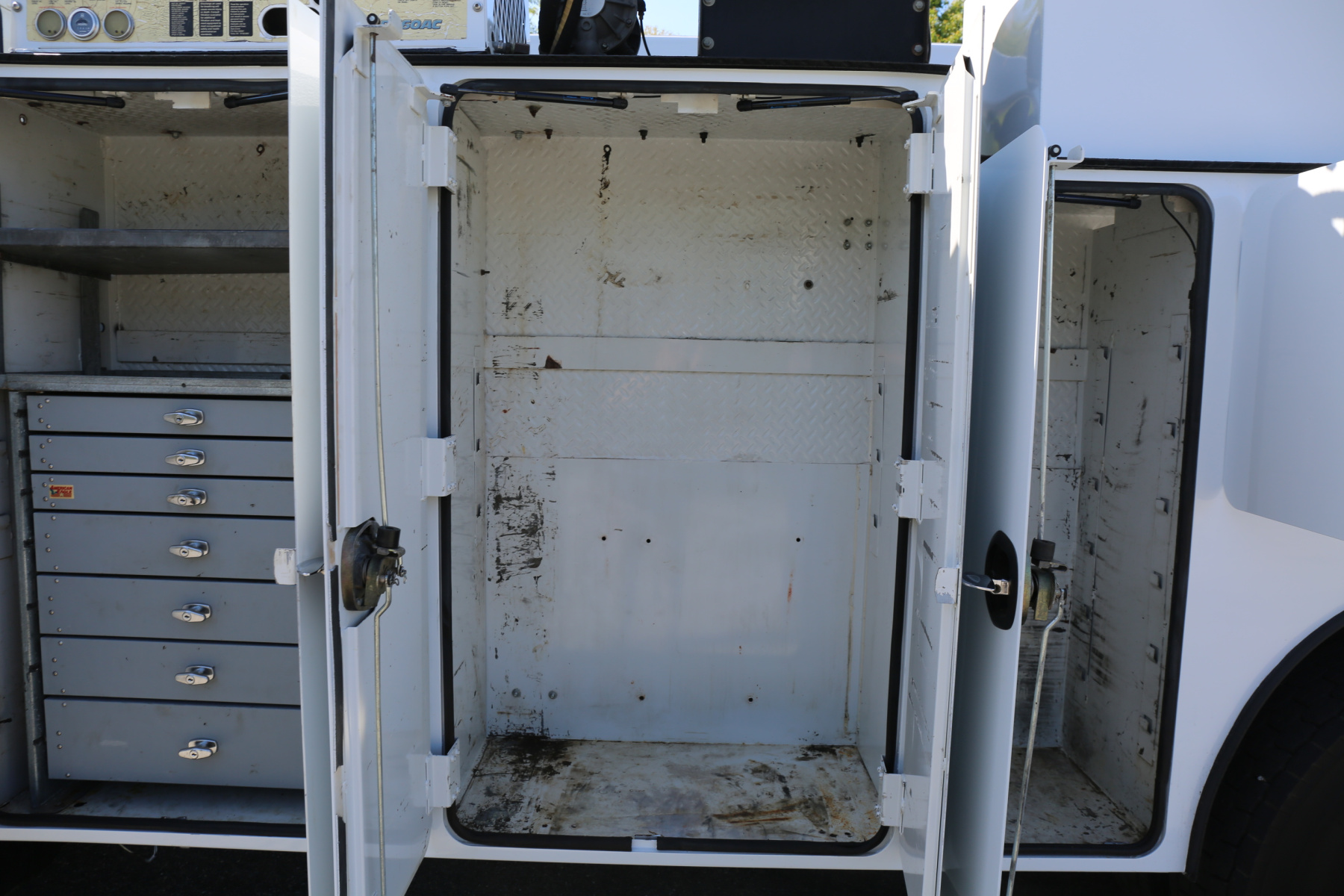 The crane compartment houses an air hose reel, and air regulator/drier. One shelf over the passenger wheel well compartment. A set of bolt drawers in the D3 compartment, one shelf in the D2 compartment, and four shelves in the D1 compartment as well as torch bottle racks.