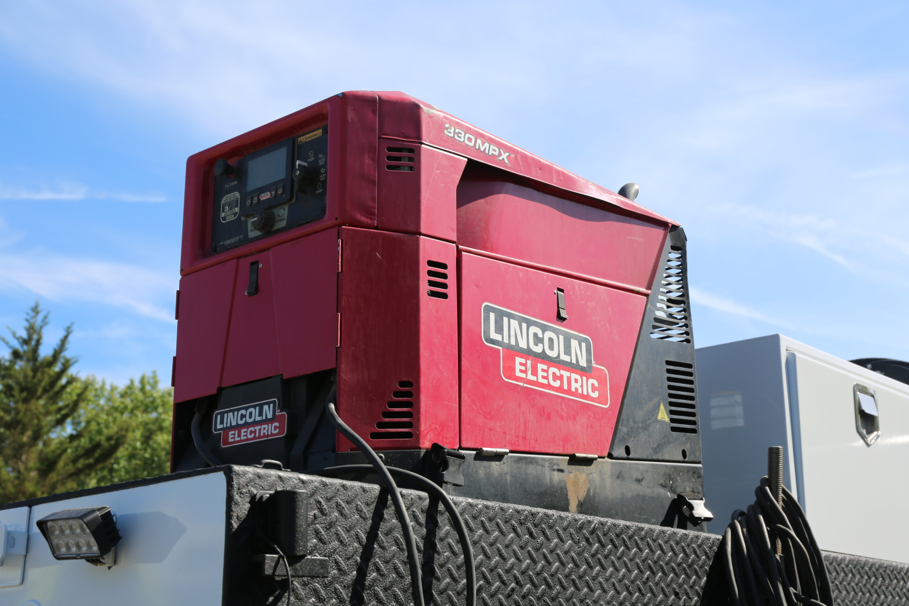 Inside the bed there is a large waste oil tank with evac reel mounted behind the compressor, and a Lincoln 330MPX welder showing 244 hours with leads included.
