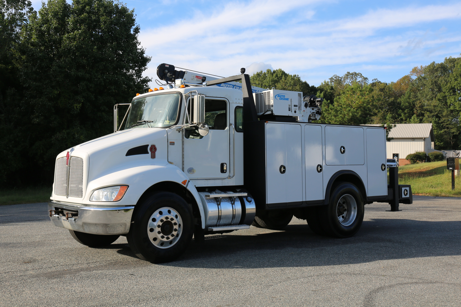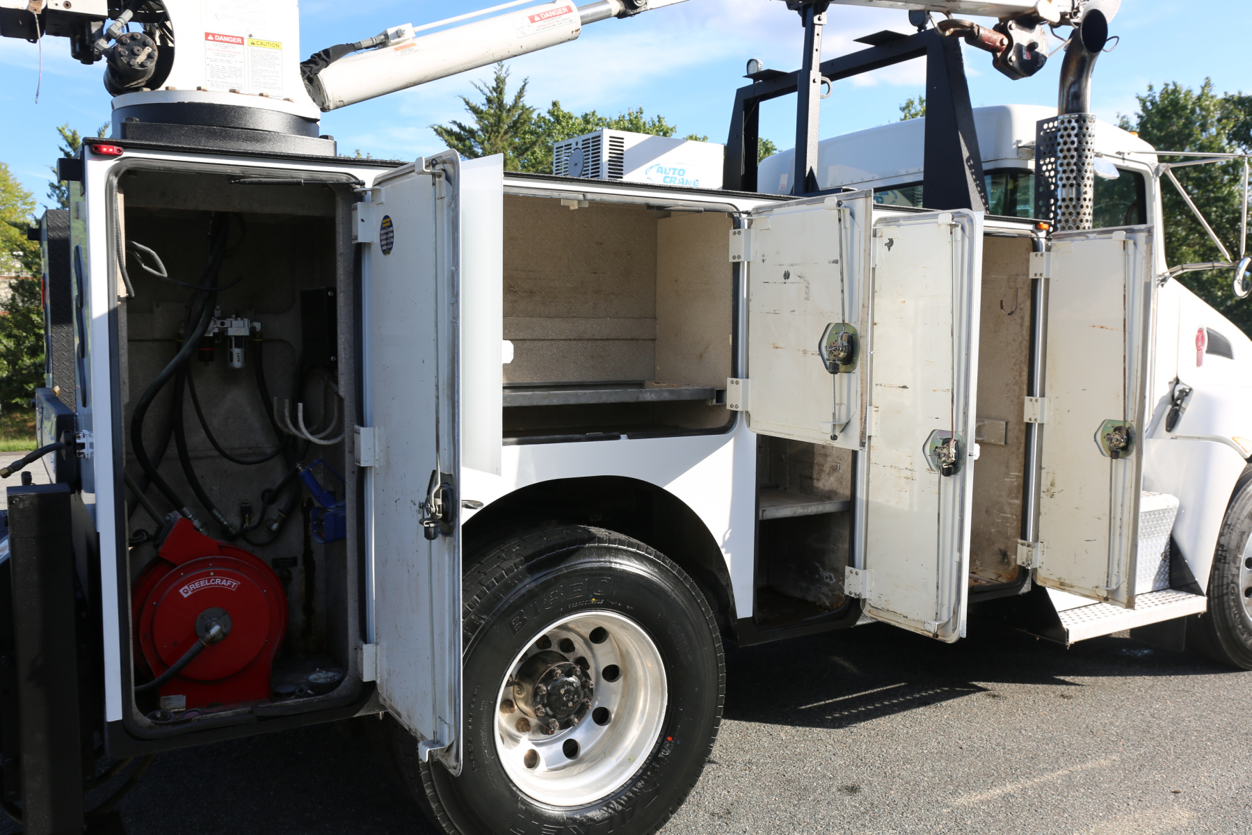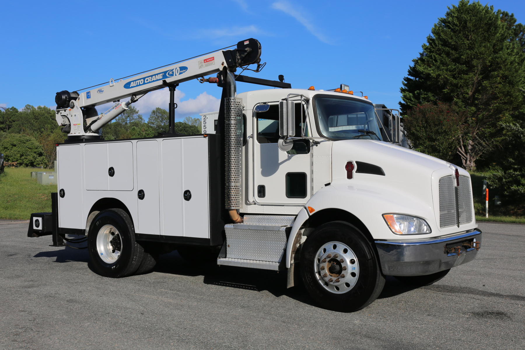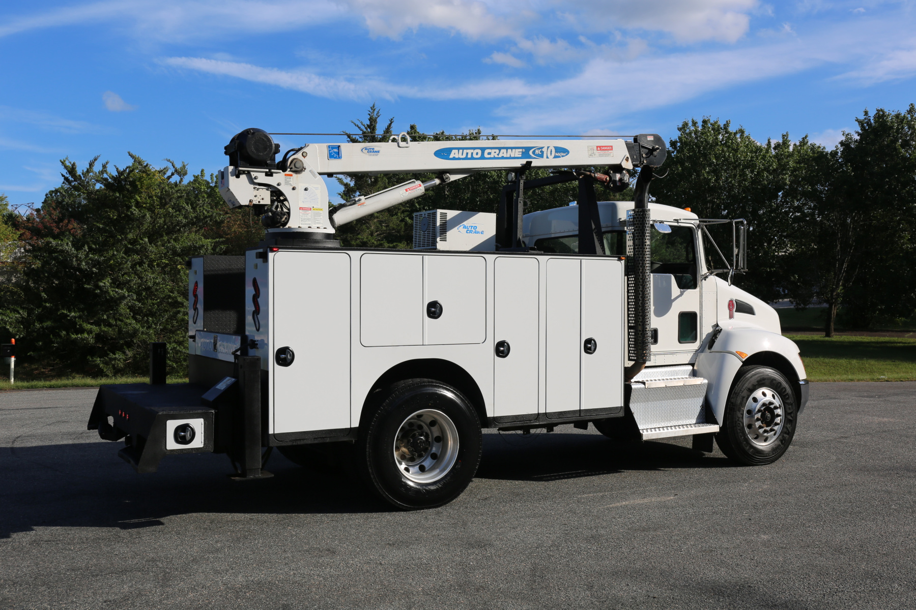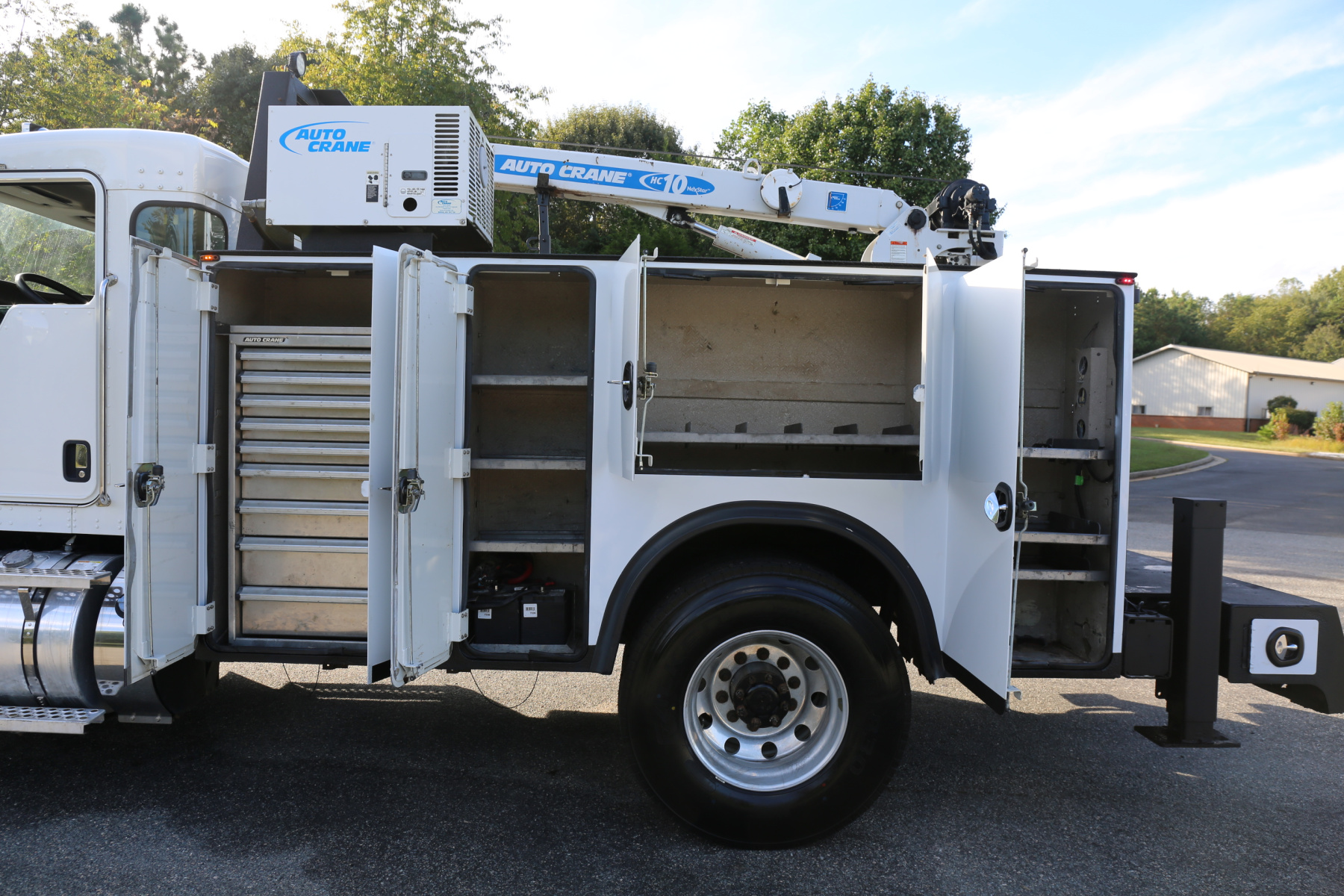 Equipped with an 11′ Autocrane Titan 60 service body, an HC10 crane, hydraulic compressor and hydraulic outriggers, and one set of drawers. Air brakes, 26,000 GVWR – right under CDL weight.