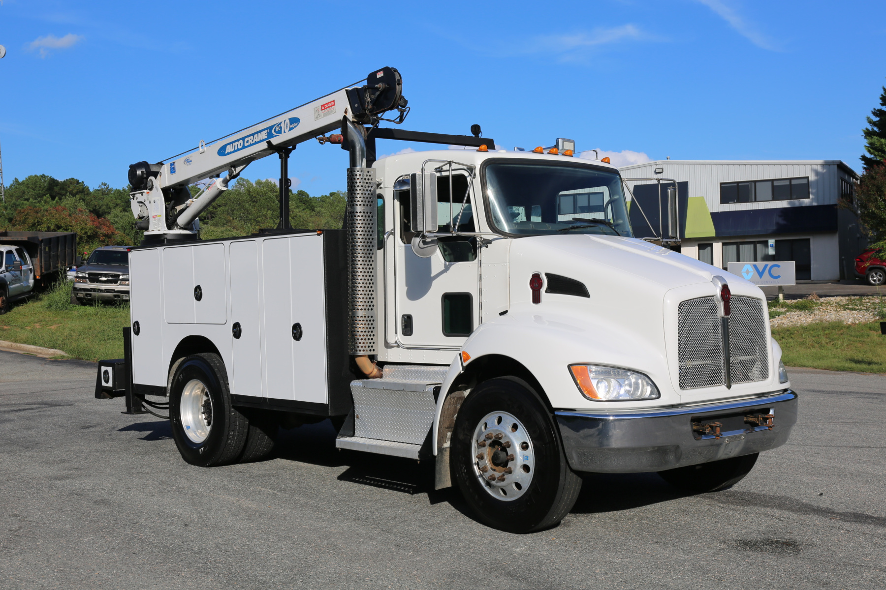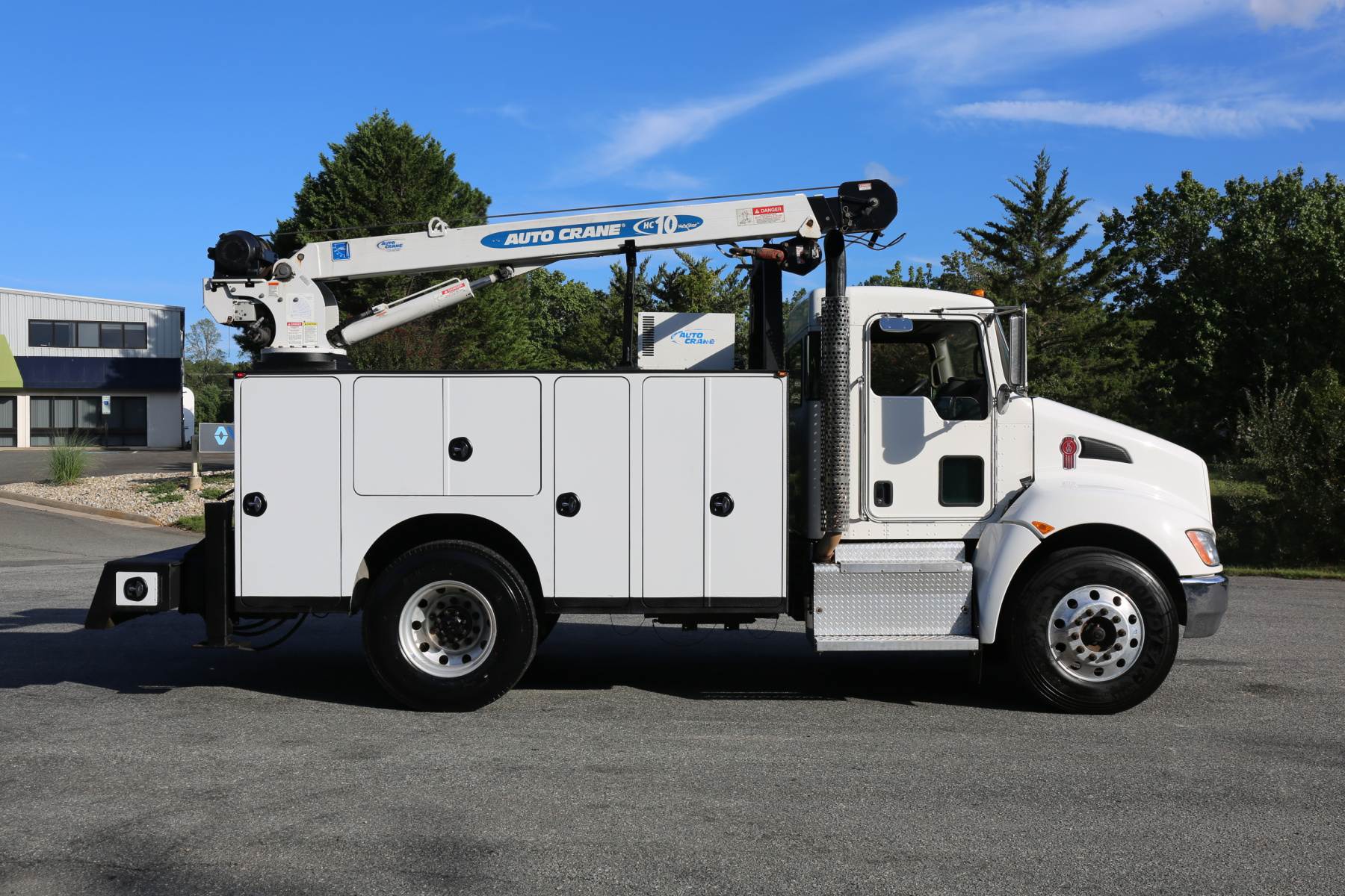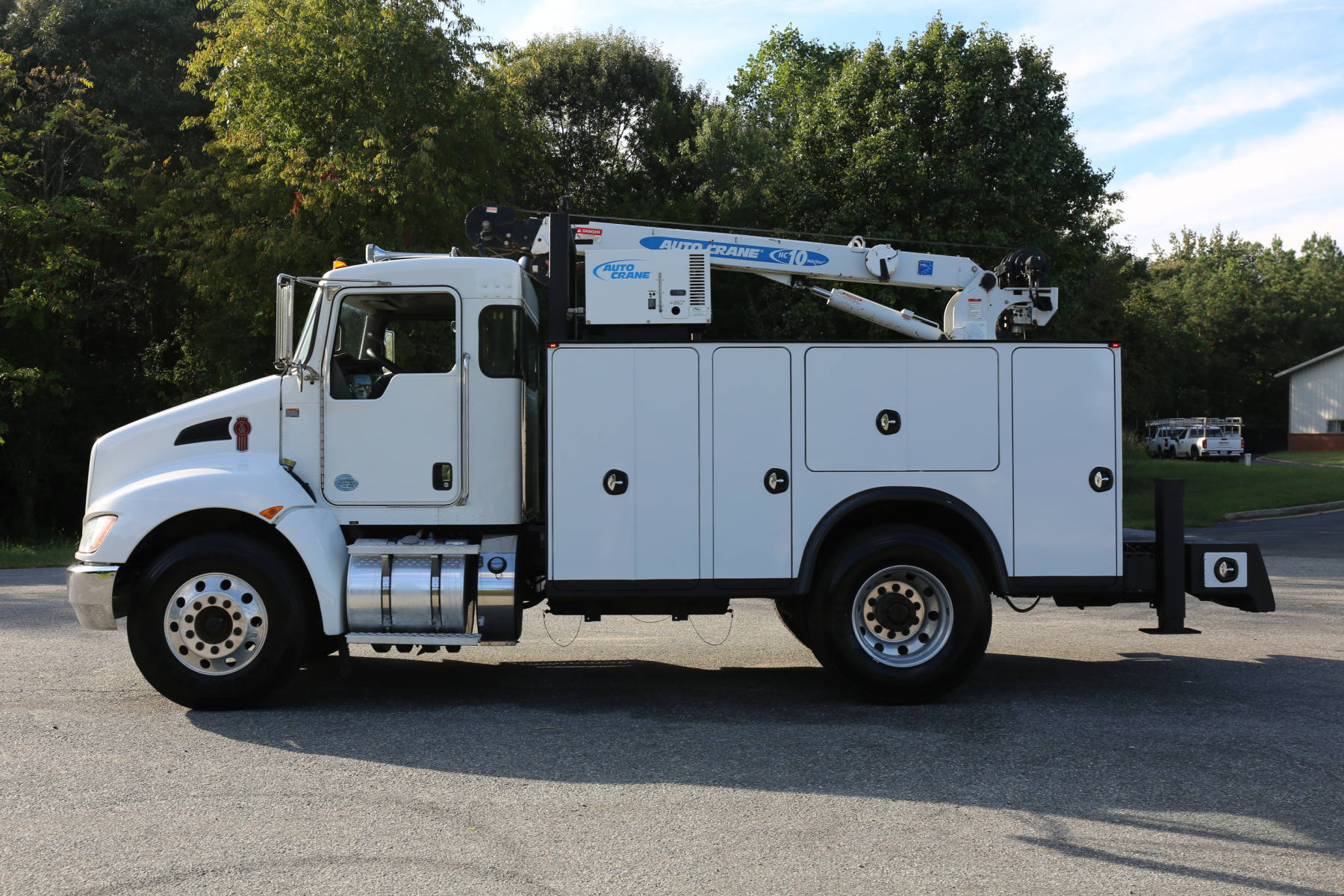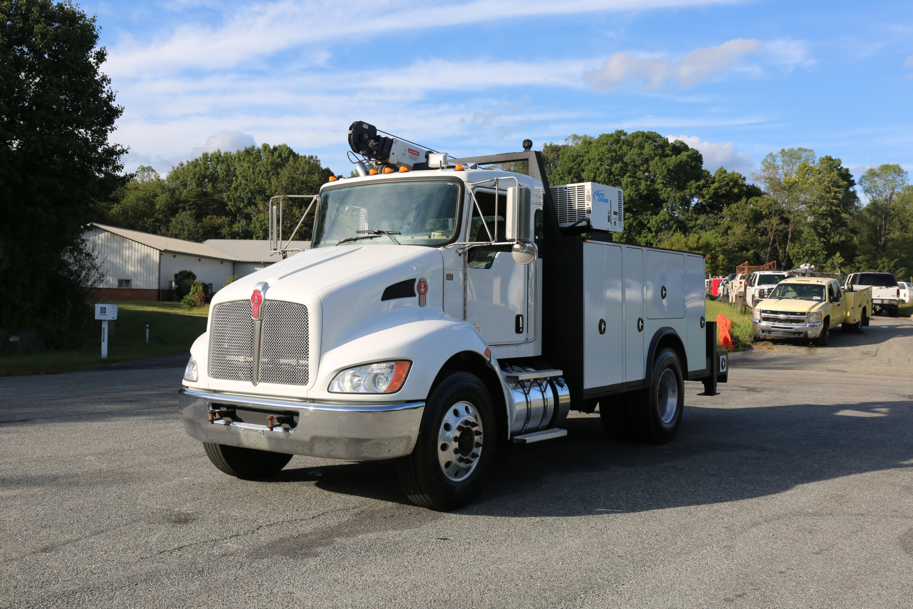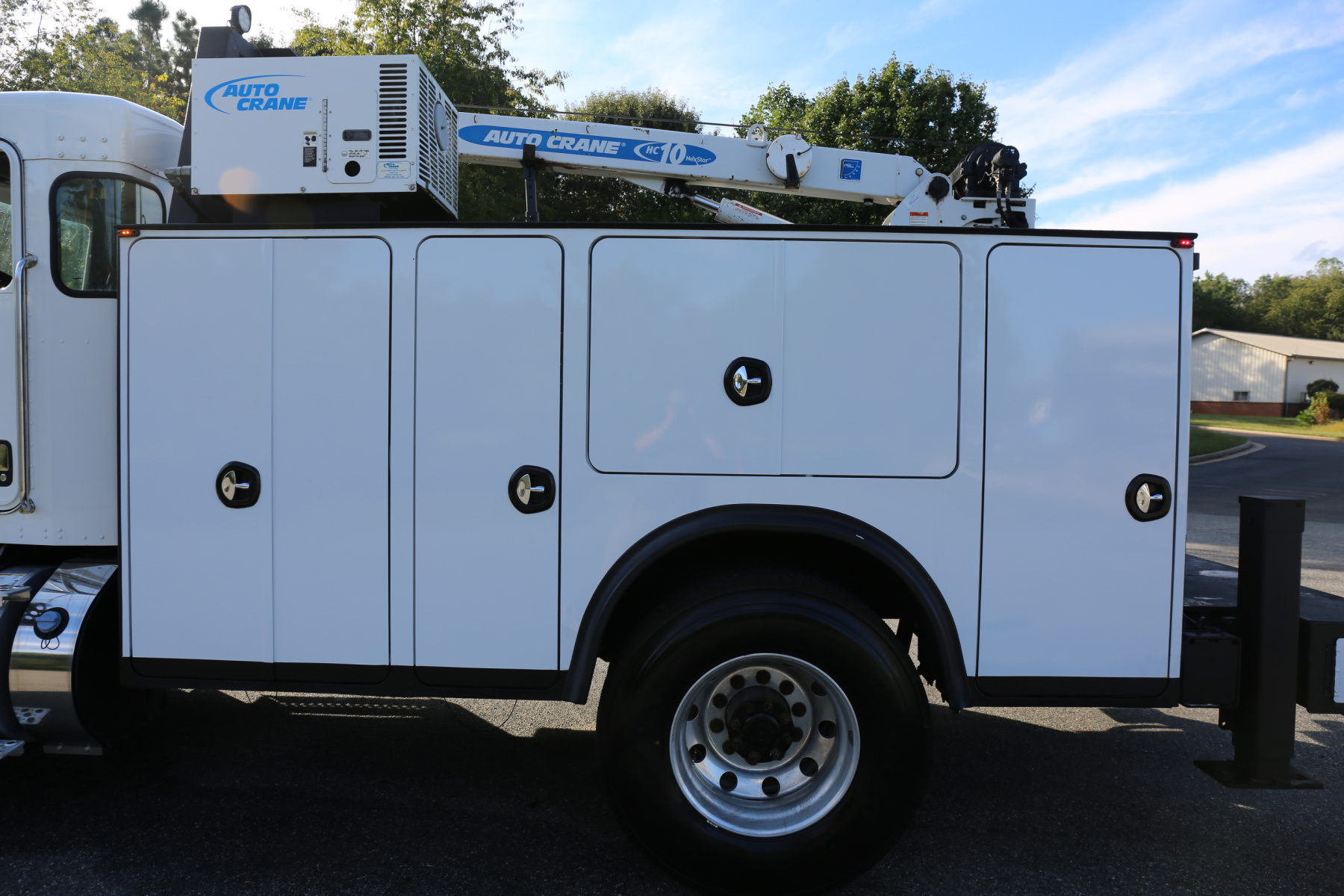 Equipped with an 11′ Autocrane Titan 60 service body, an HC10 crane, hydraulic compressor and hydraulic outriggers, and one set of drawers. Air brakes, 26,000 GVWR – right under CDL weight.