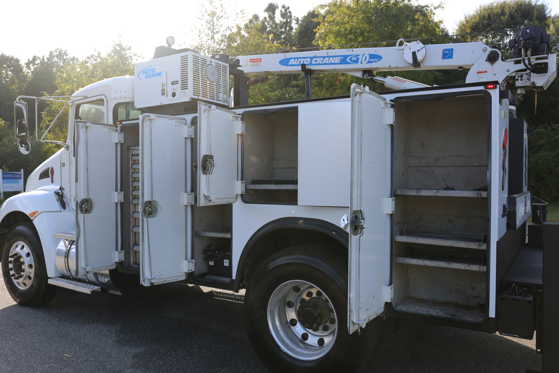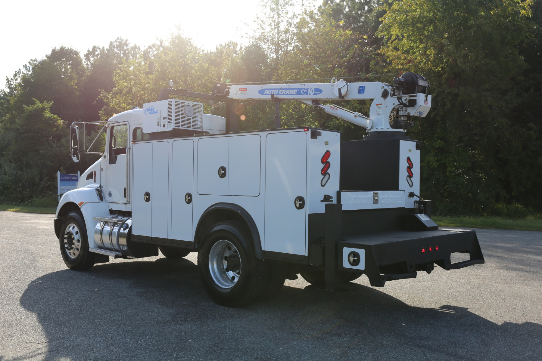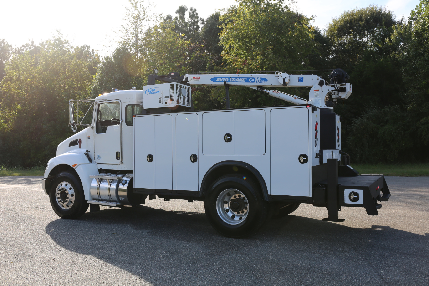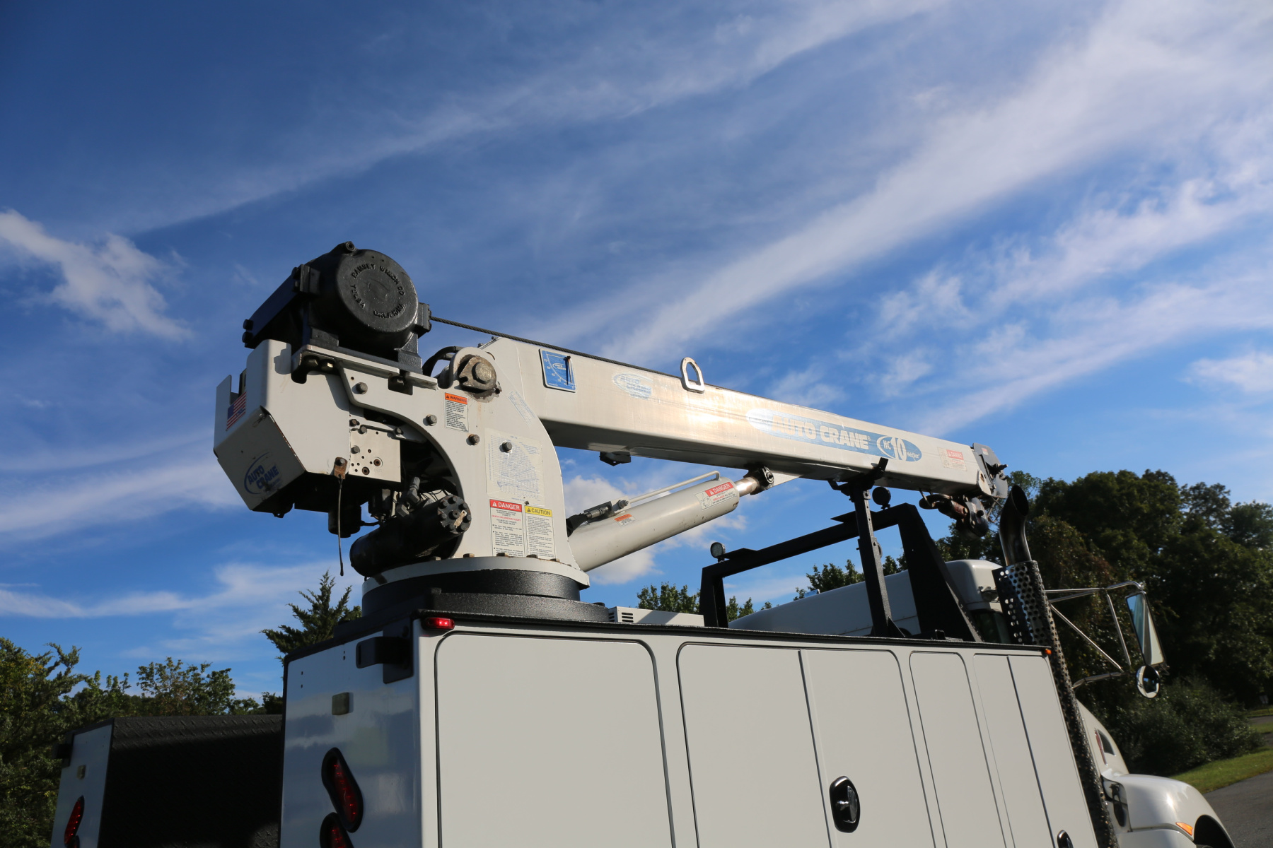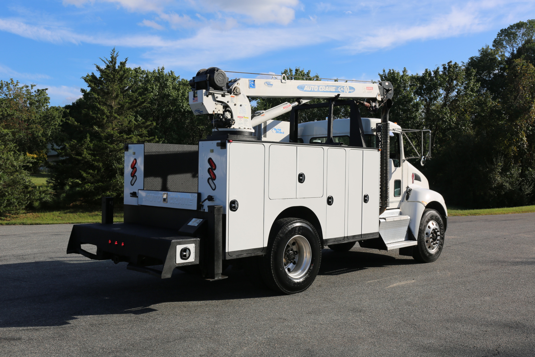 Equipped with an 11′ Autocrane Titan 60 service body, an HC10 crane, hydraulic compressor and hydraulic outriggers, and one set of drawers. Air brakes, 26,000 GVWR – right under CDL weight.
