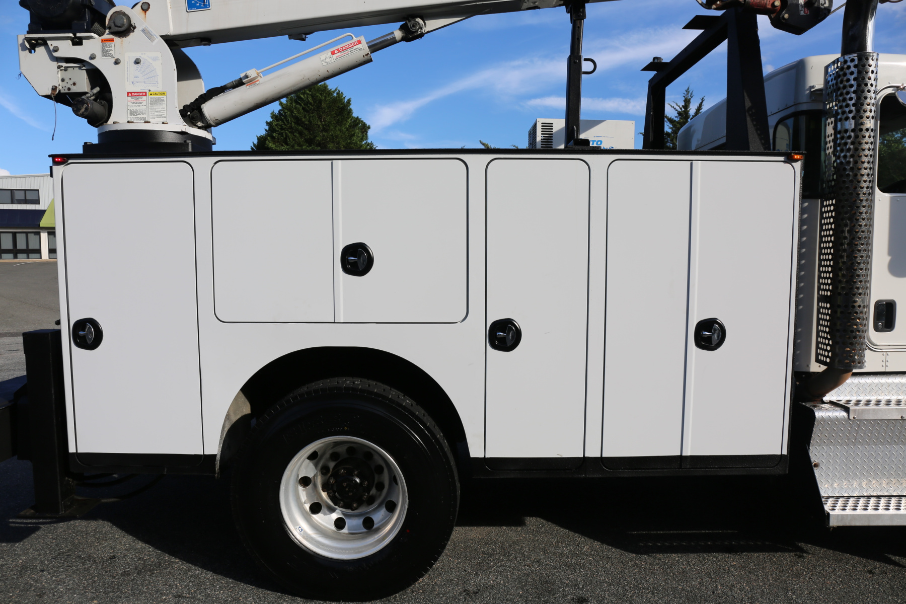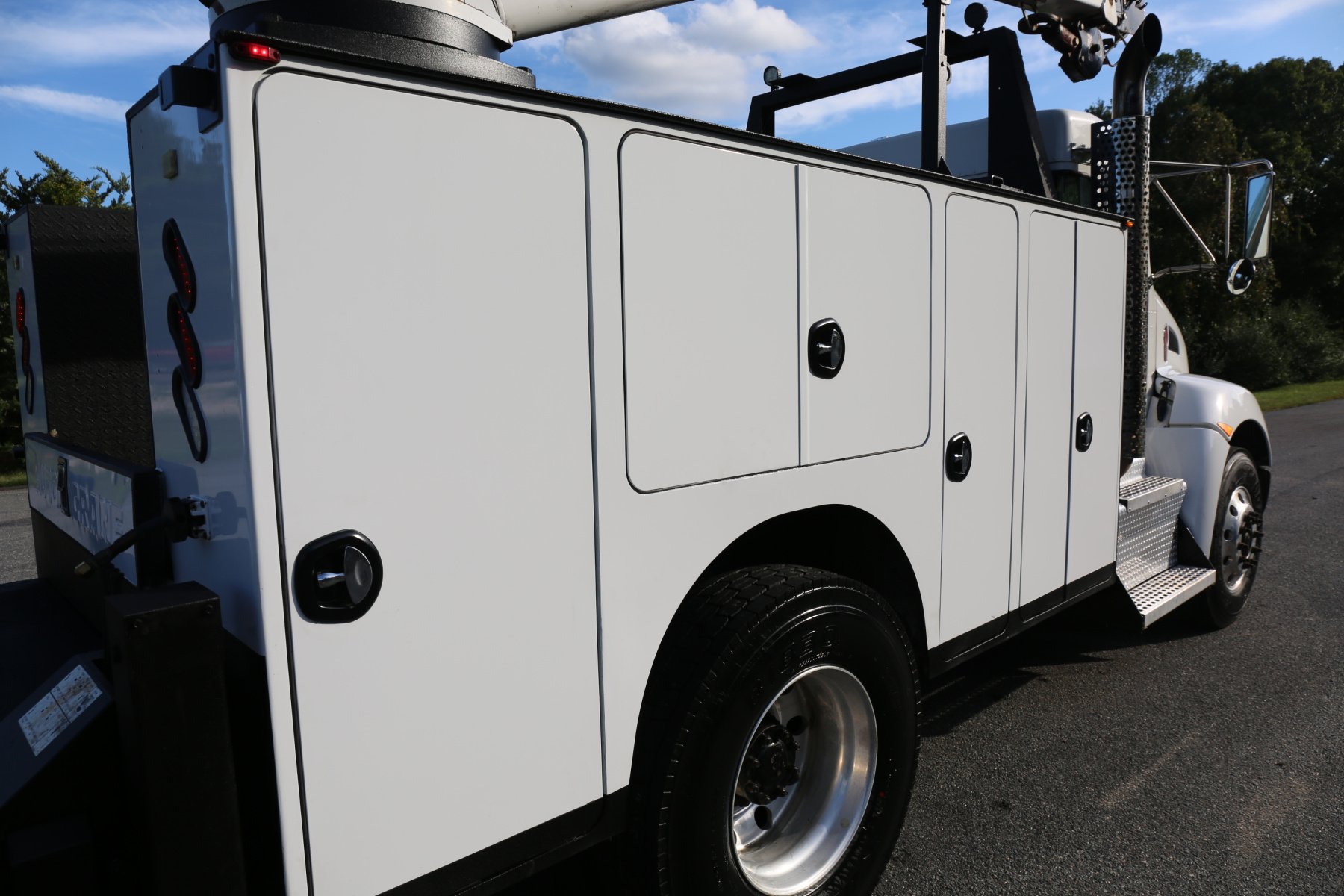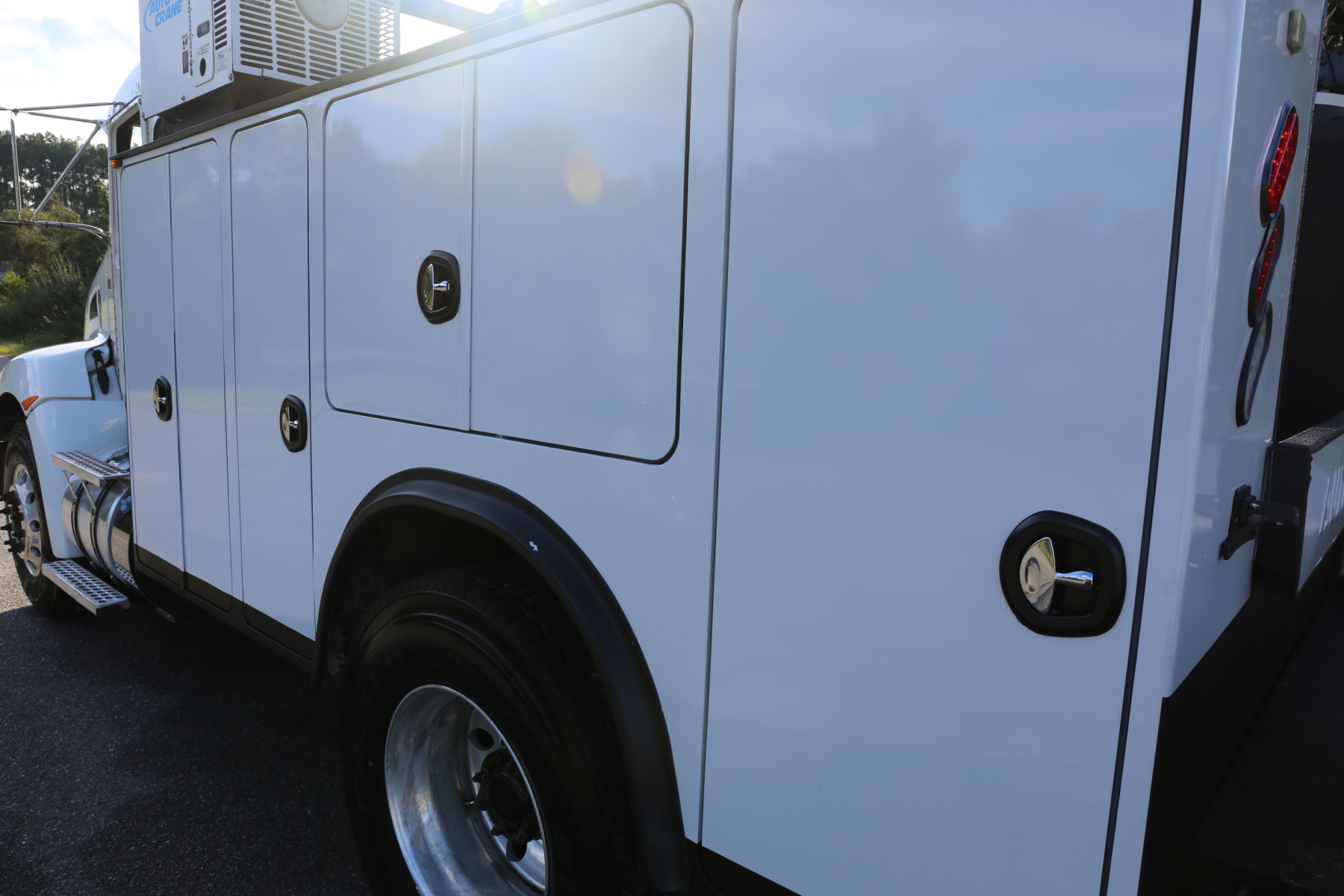 The bed is an 11′ Autocrane Titan 60, which has just been sandblasted and repainted and shows like new. New bedliner applied to the work bench bumper and inside of the bed. We paint the exterior only – no paintwork done to inside of the compartments.