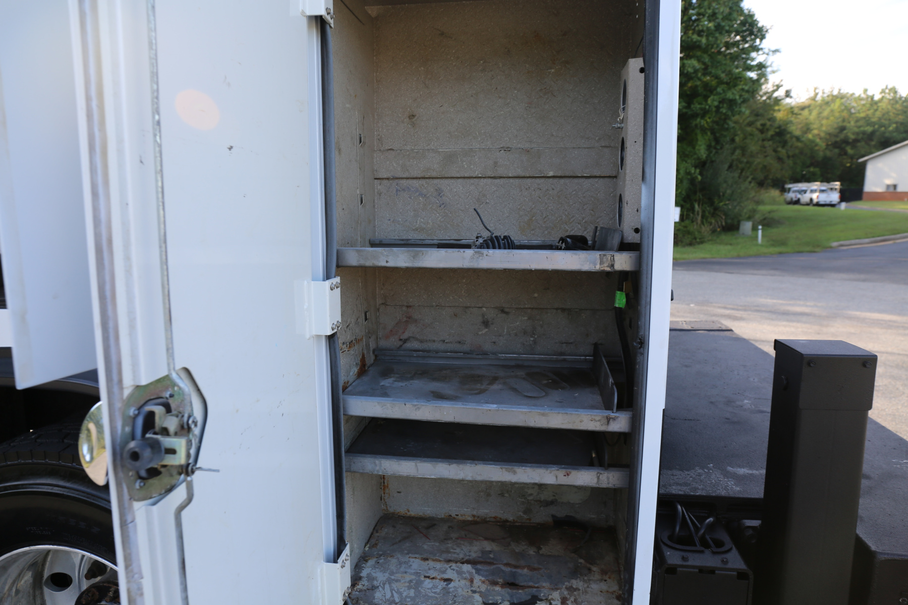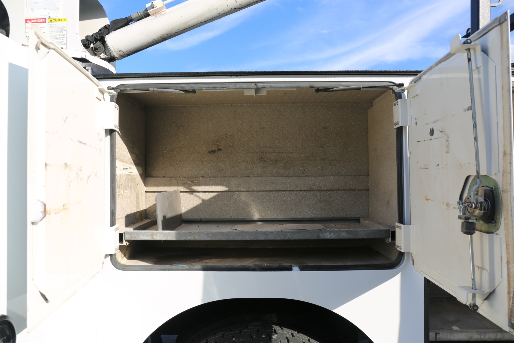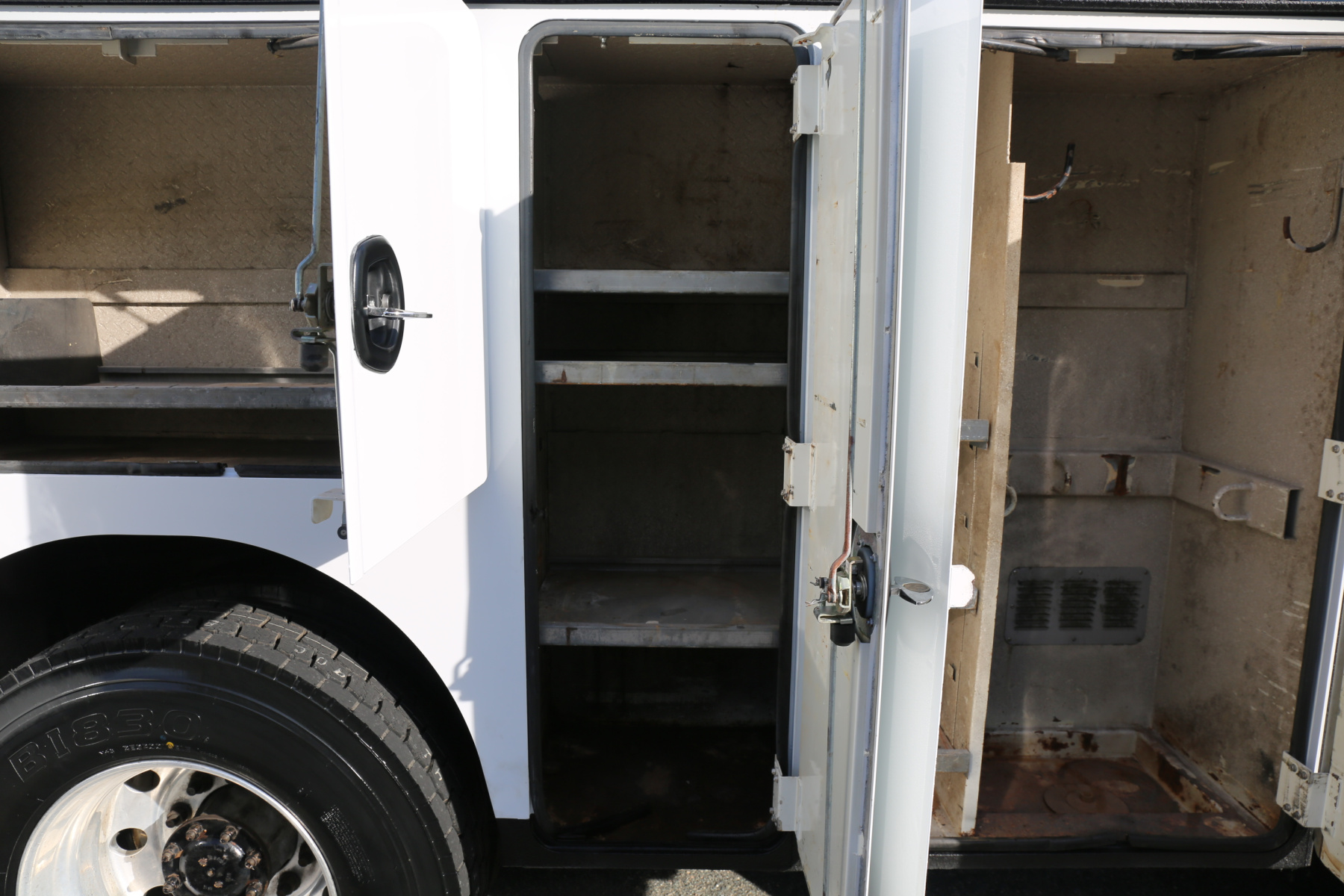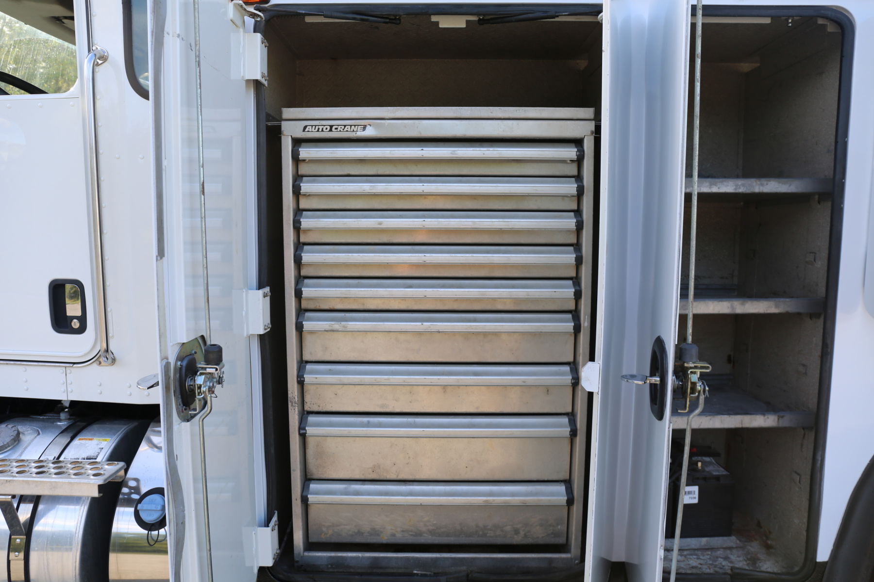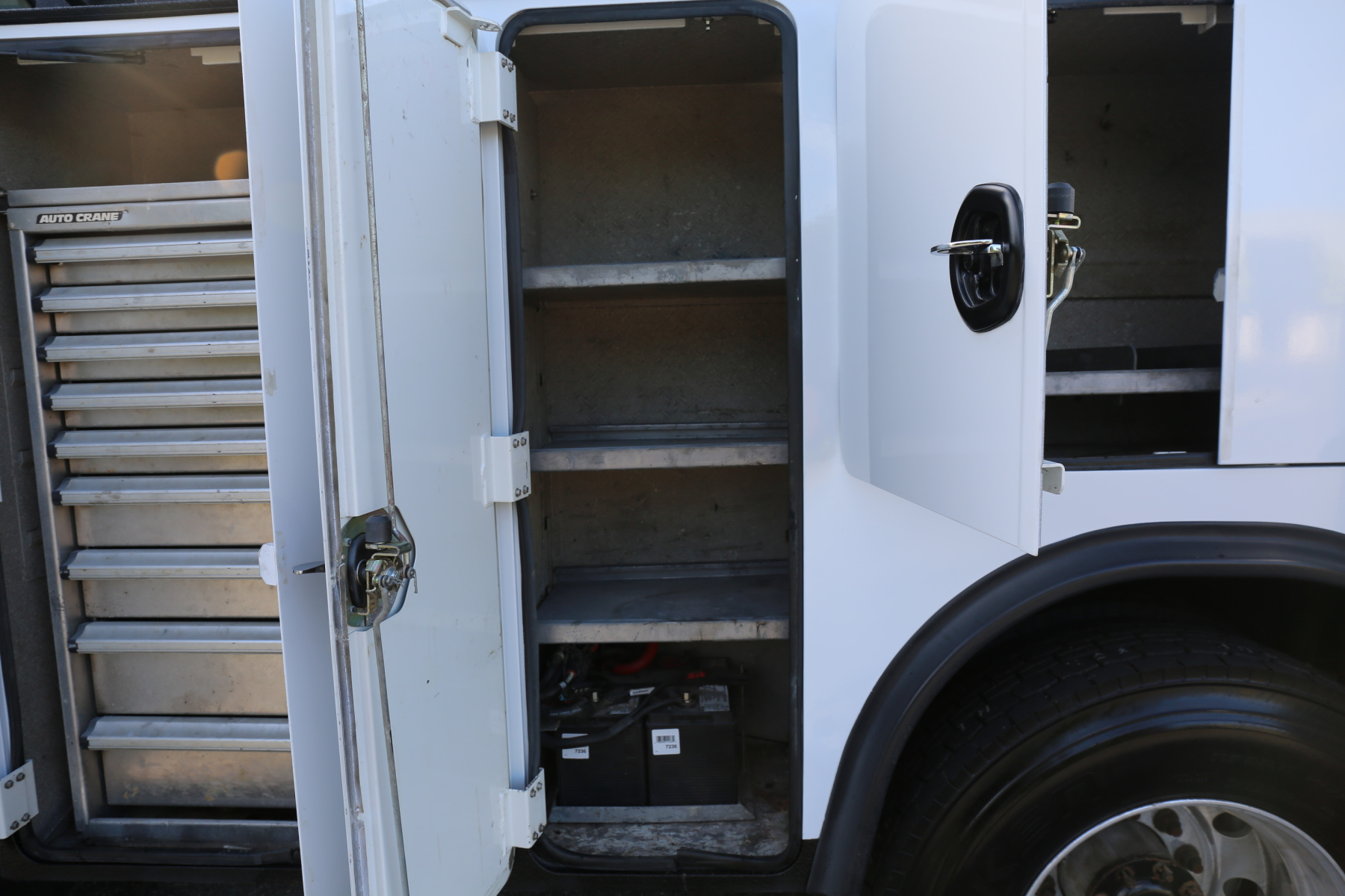 The D1 compartment has a full set of Autocrane drawers, nine total. Three shelves in the D2 compartment, as well as the truck batteries. The driver wheel well has one shelf. Three shelves in the driver rear compartment.