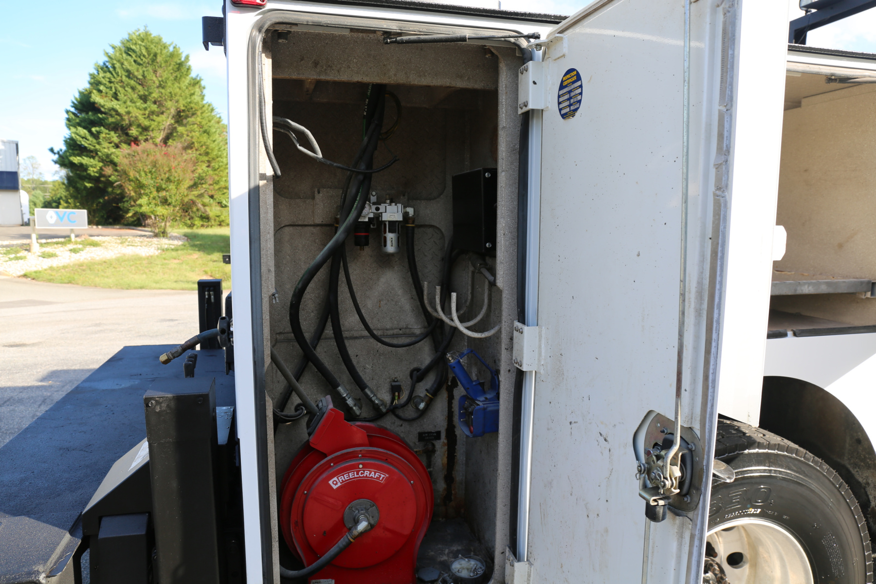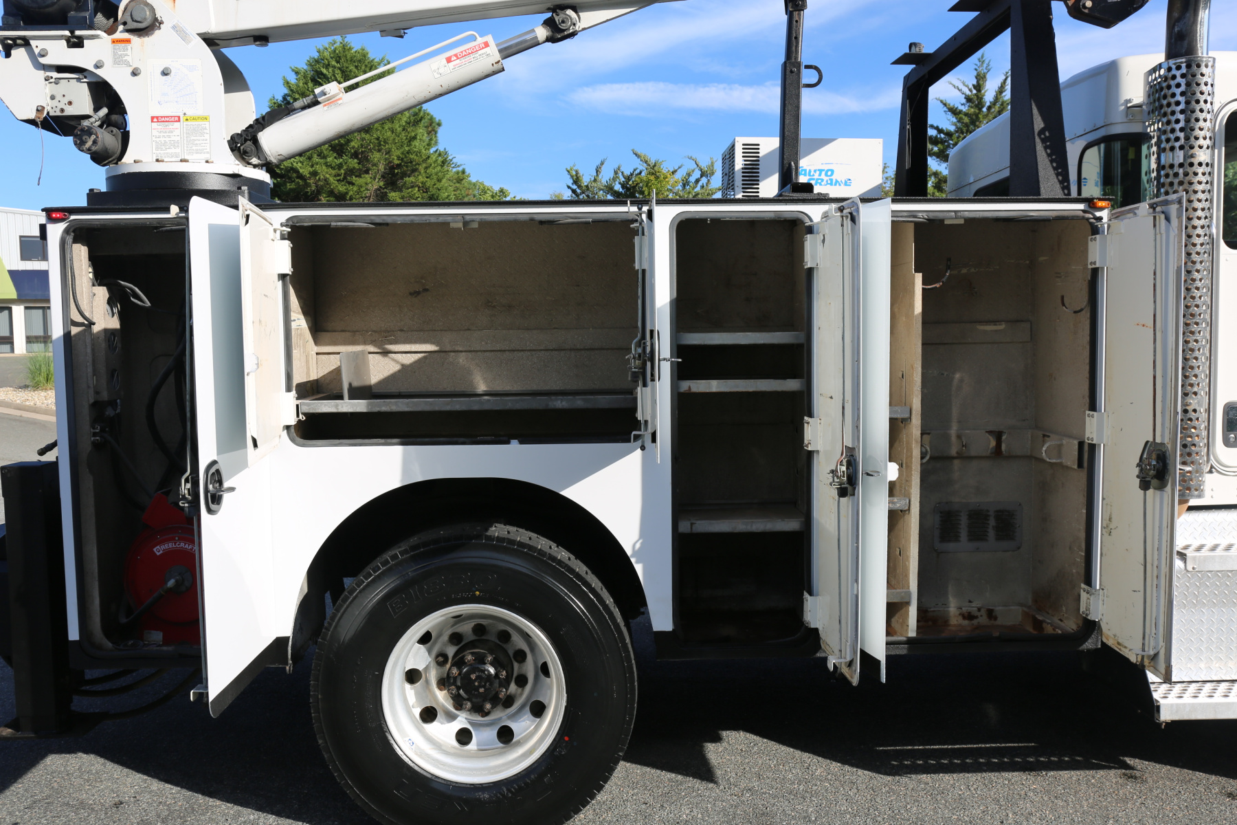 The crane compartment houses a Reelcraft hose reel, air regulator and drier, and the factory wireless remote. One shelf over the passenger wheel well. Three shelves in the P3 compartment. Three more shelves in the P1 compartment as well as torch bottle racks.