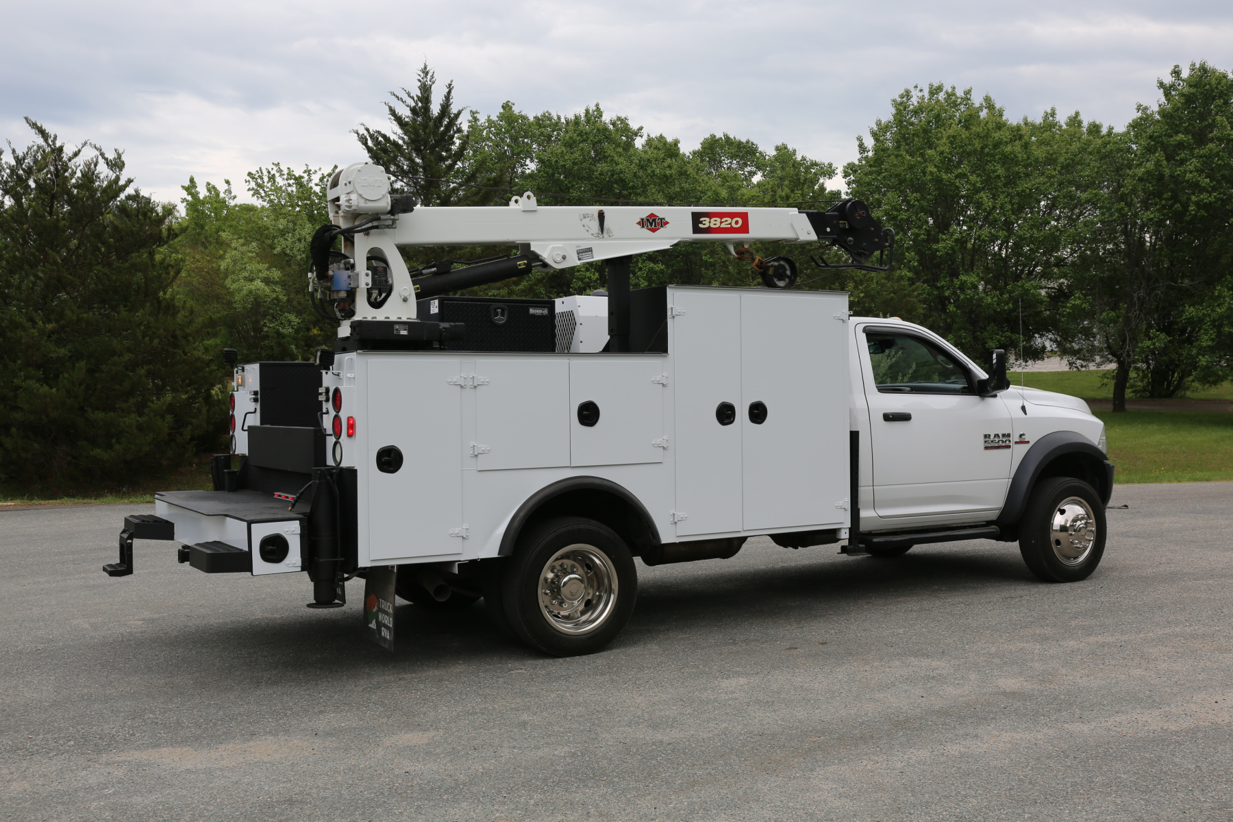 Workbench rear bumper with hydraulic outriggers, pass through bin storage, master bed locks, and rear work lighting.