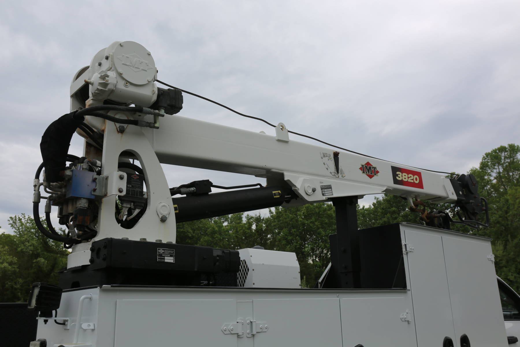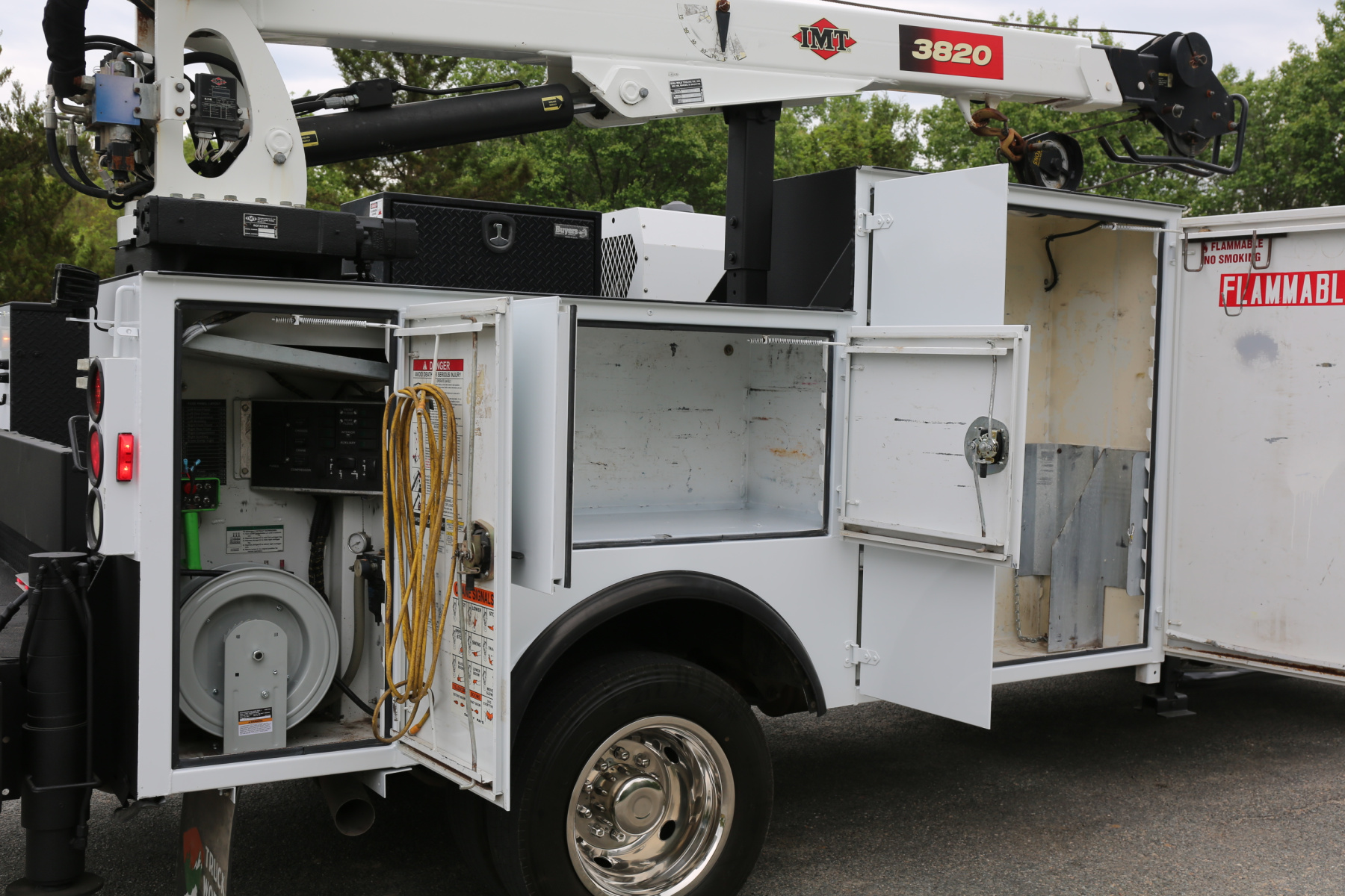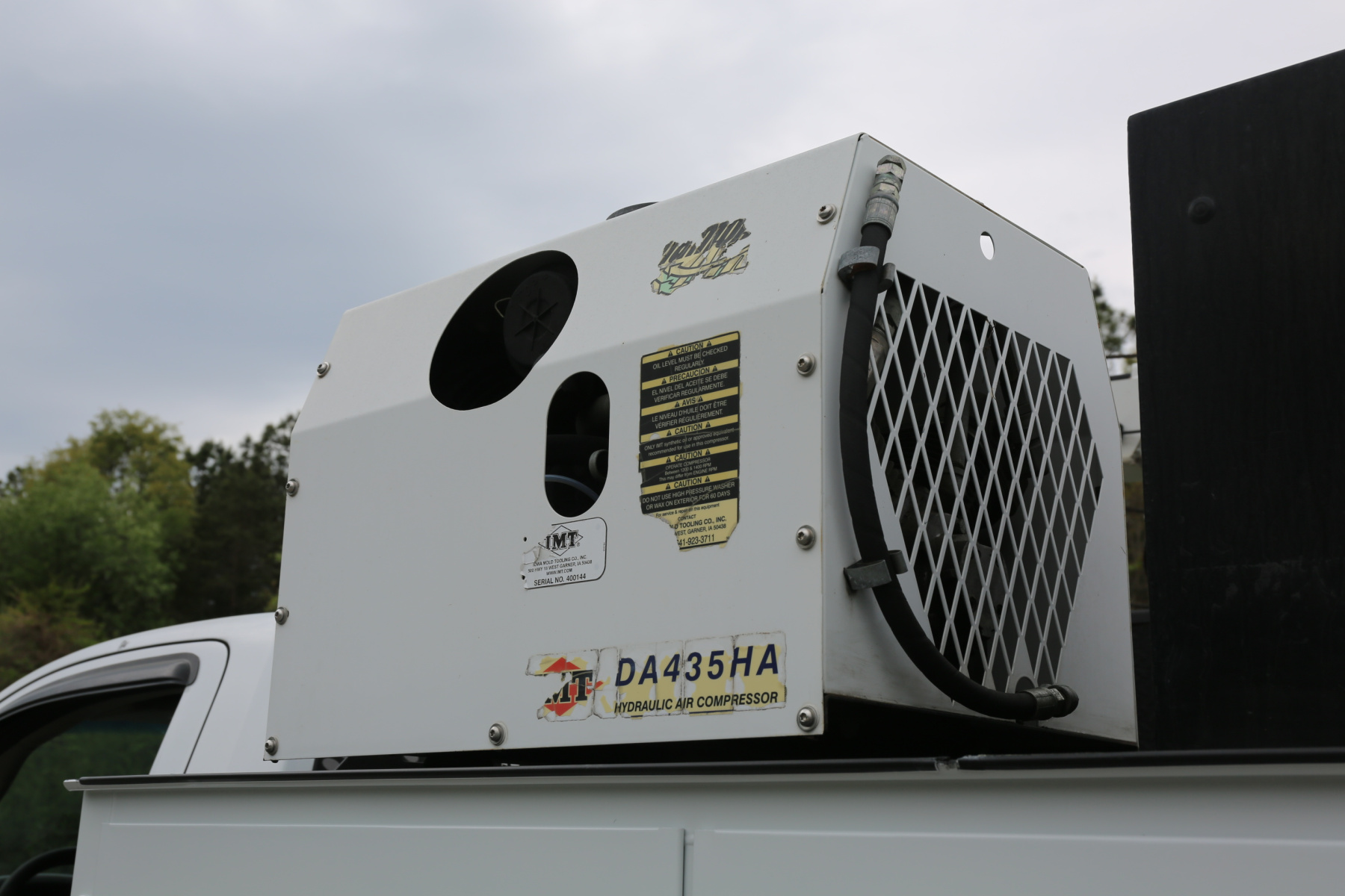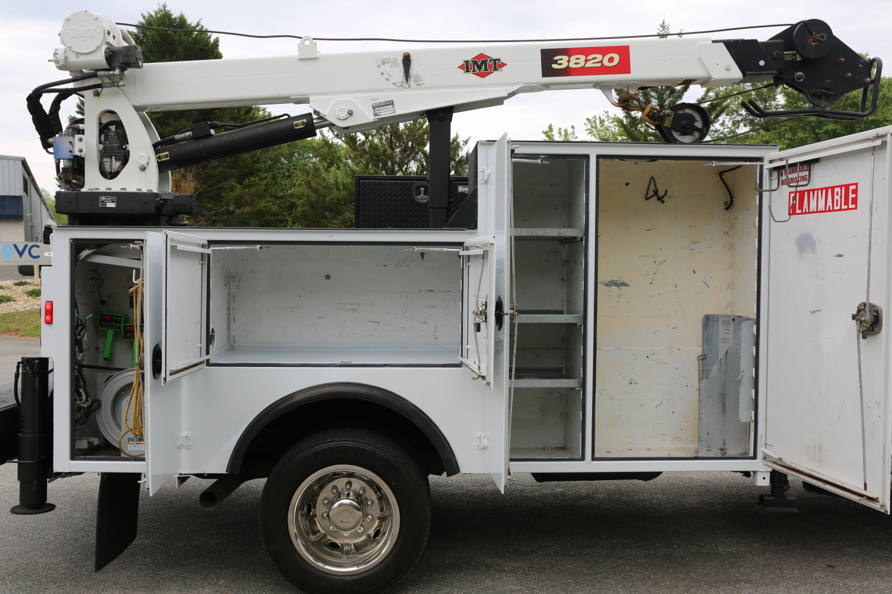 Equipped with an 11′ IMT service body, two sets of drawers, hydraulic outriggers, a 7500# PTO driven crane, and hydraulic compressor.