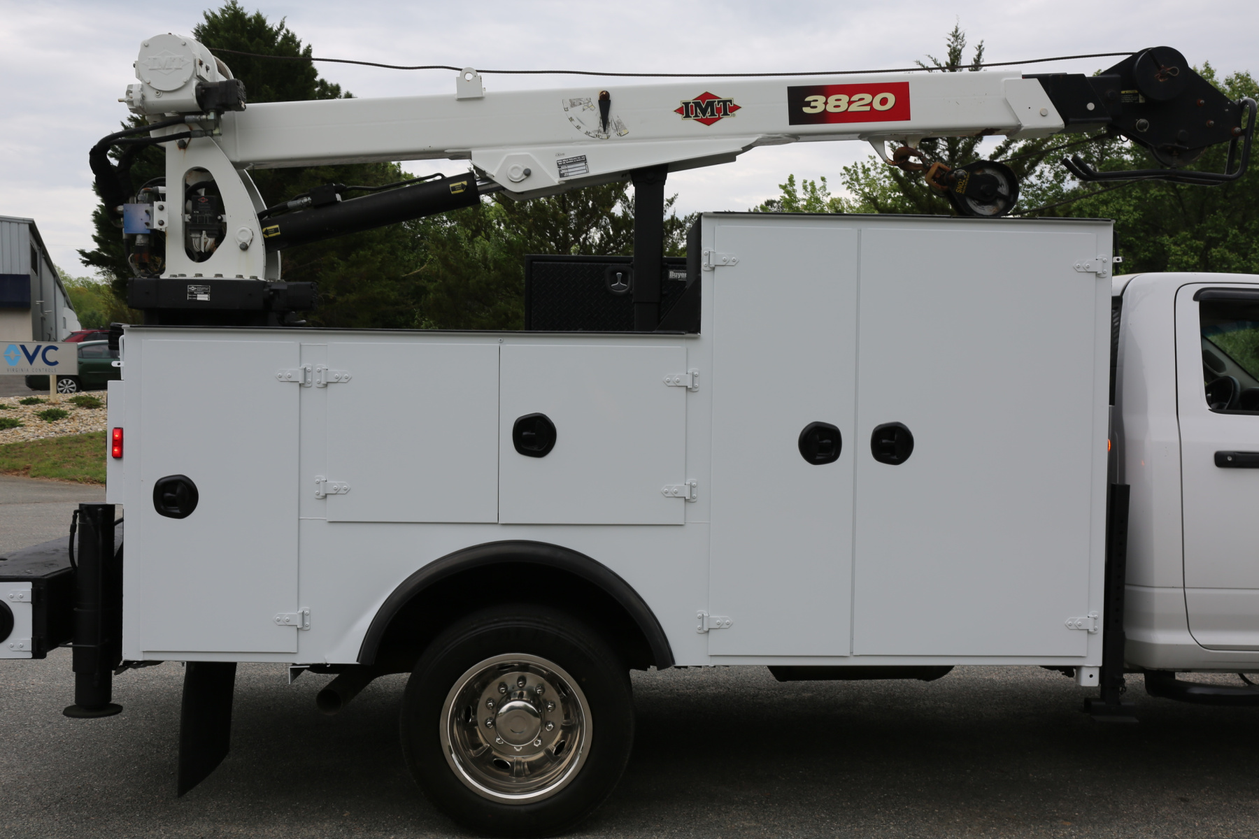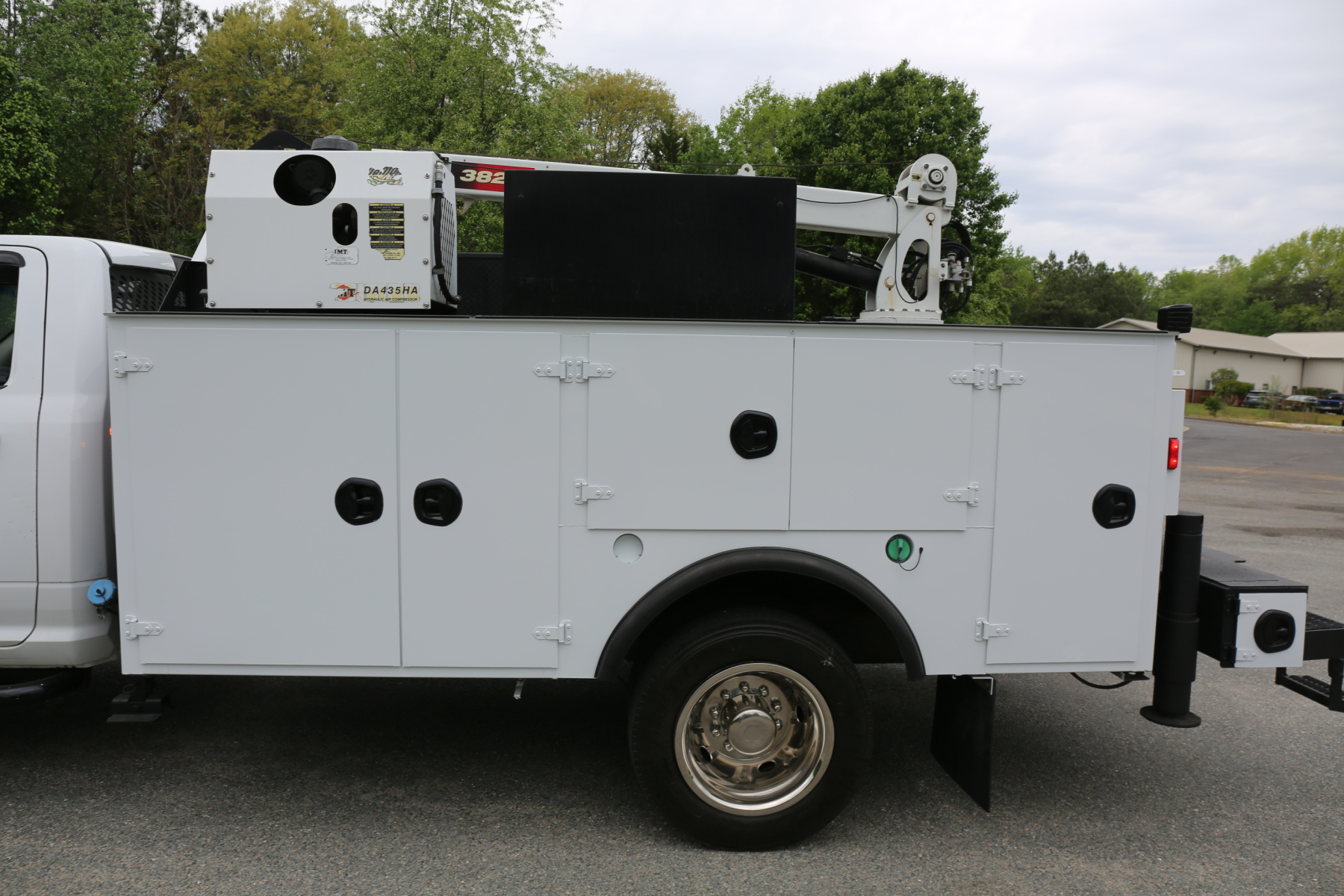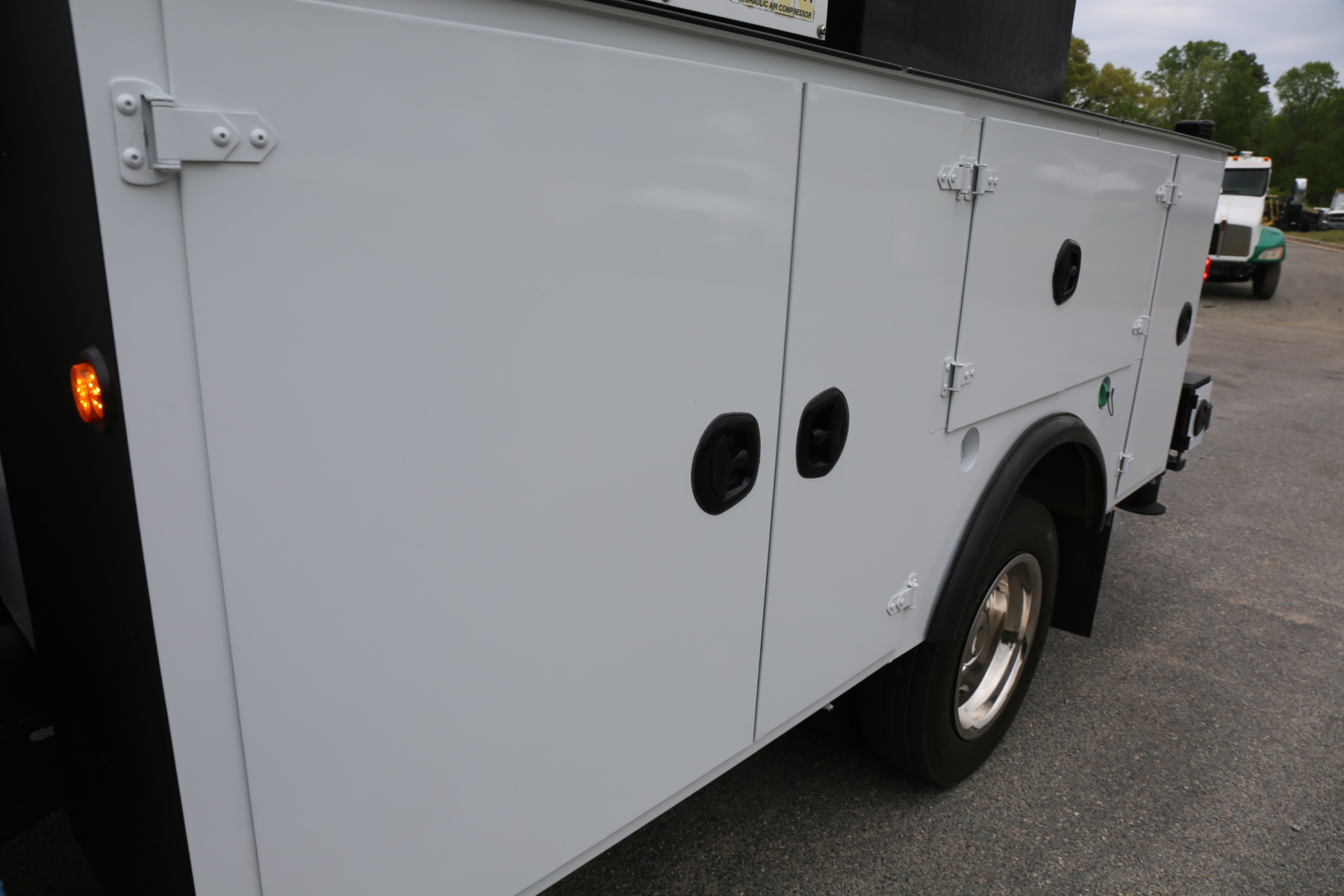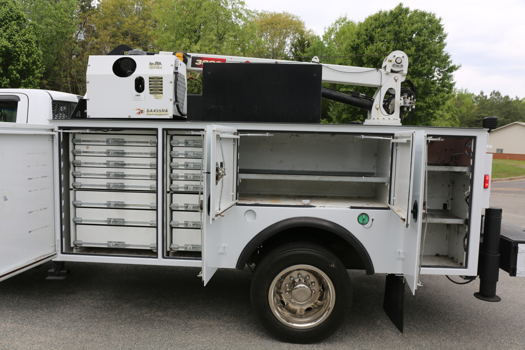 Equipped with an 11′ IMT service body, two sets of drawers, hydraulic outriggers, a 7500# PTO driven crane, and hydraulic compressor.