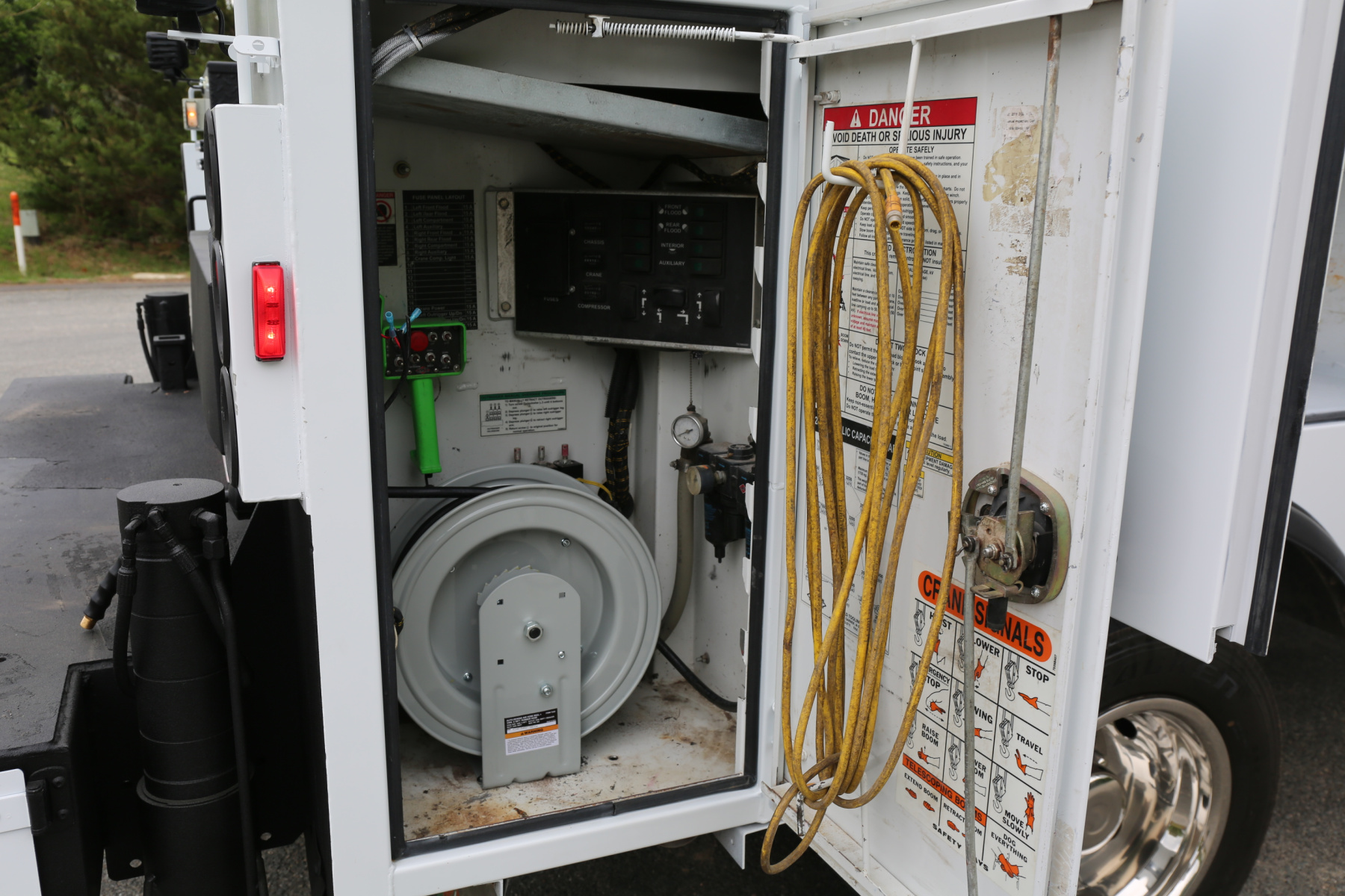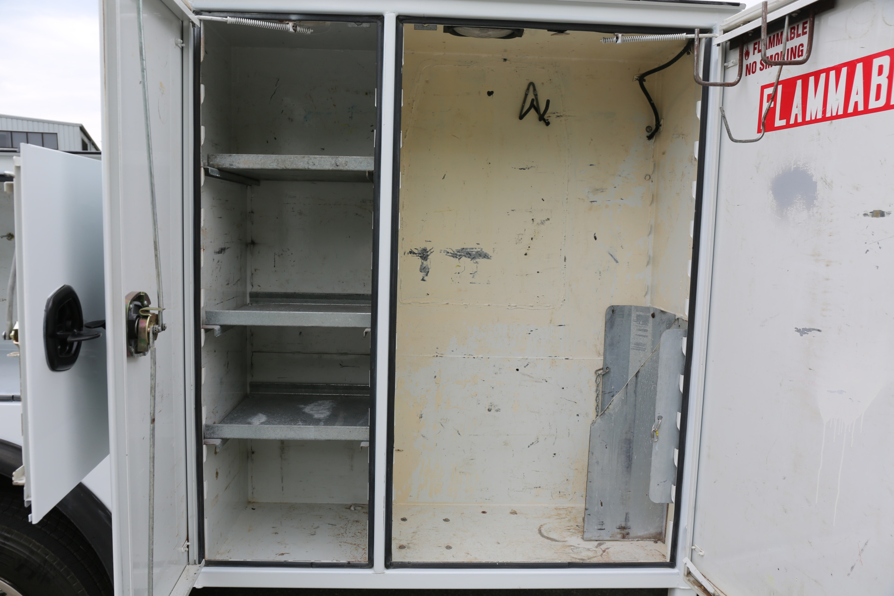 The crane compartment houses the body control panel for the lights and the outriggers, as well as an air regulator/drier and air hose cordreel. The passenger wheel well compartment is open with no shelving. The P2 compartment has three sets of shelves, and the P1 compartment has torch bottle racks and straps. Both compartments are taller.