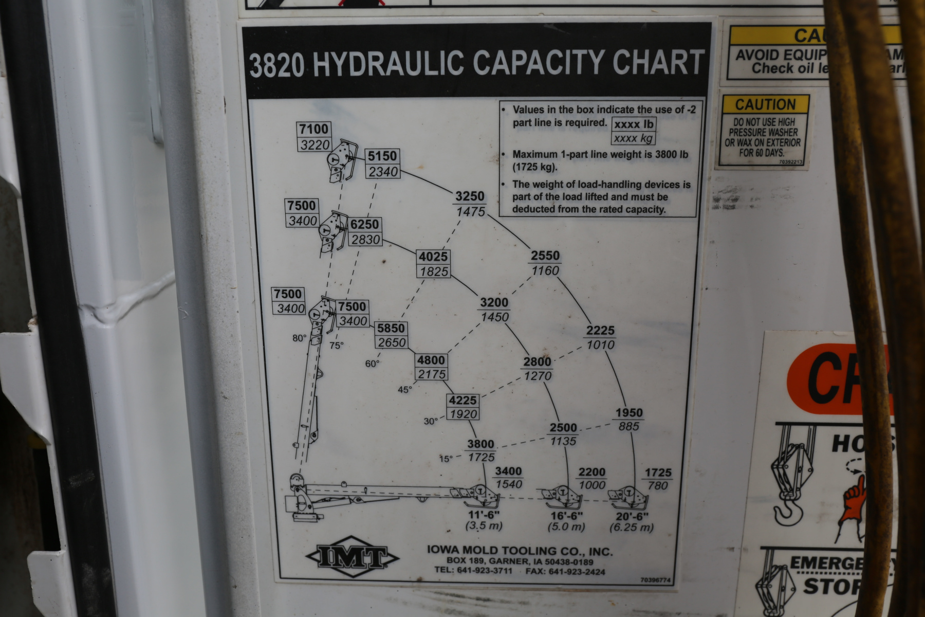 The crane is an IMT 3820 series crane with a 7500# maximum lift capacity and a two stage reach out to 20′. Run off a factory wireless remote. Showing 215 hours.