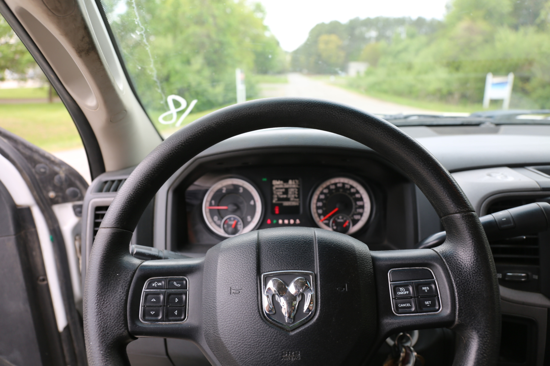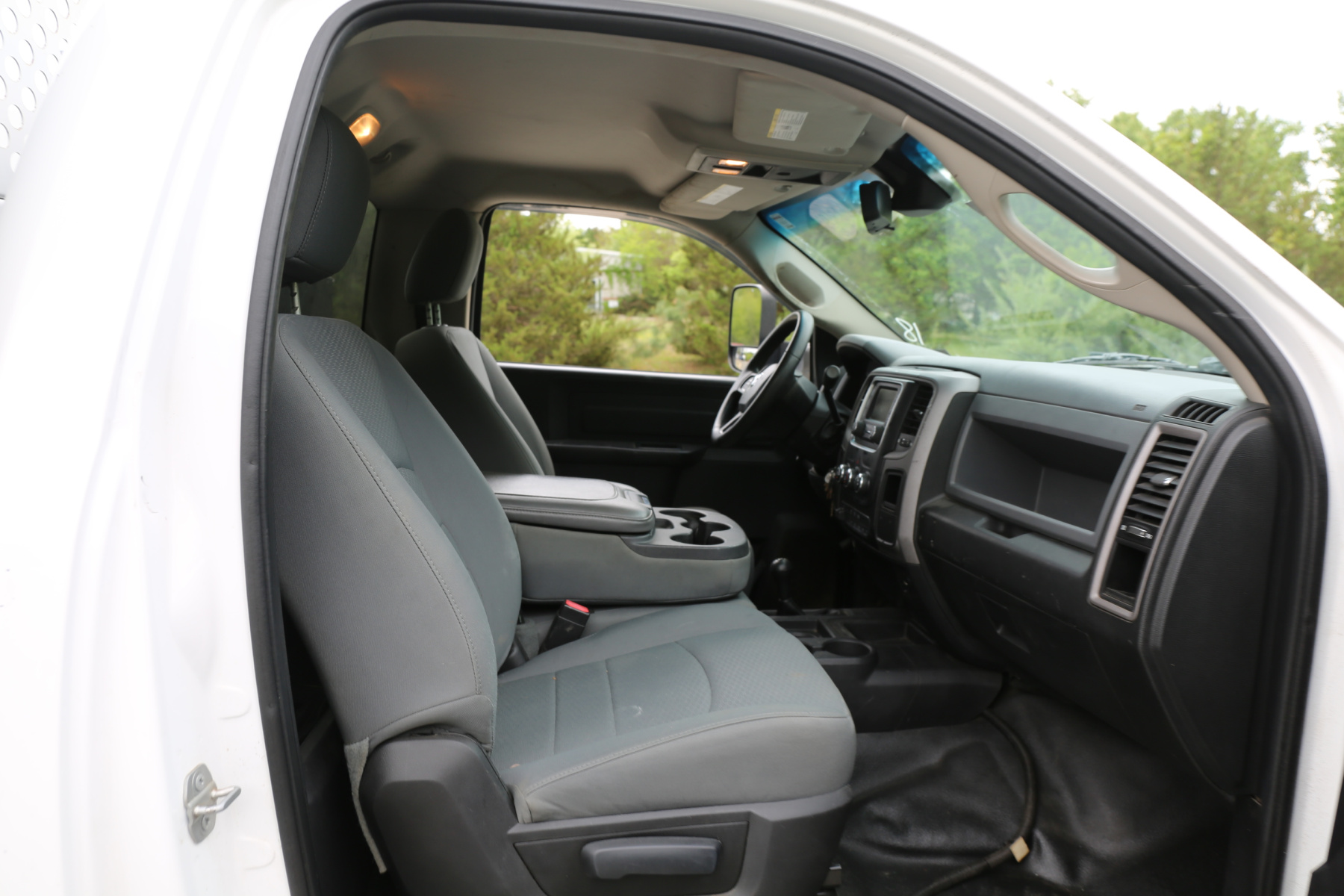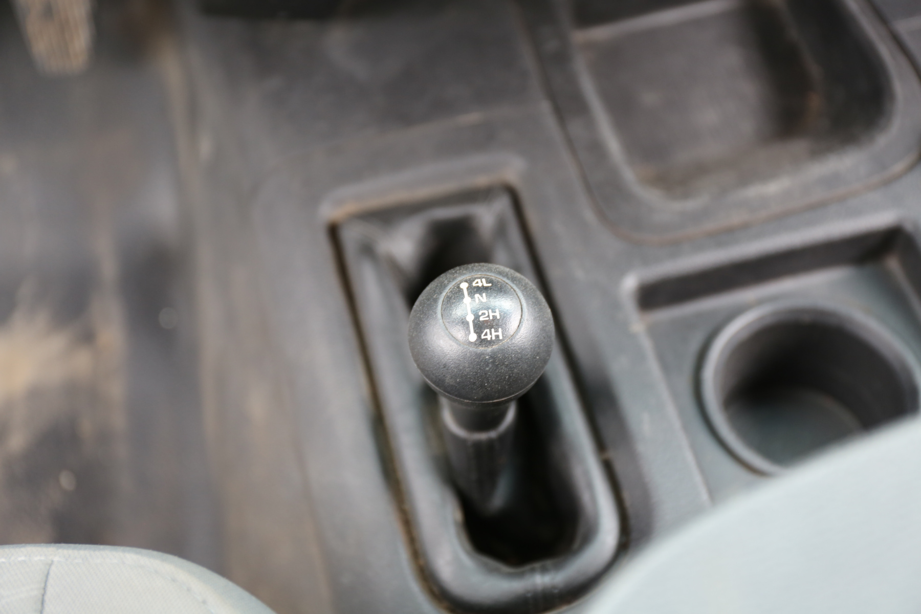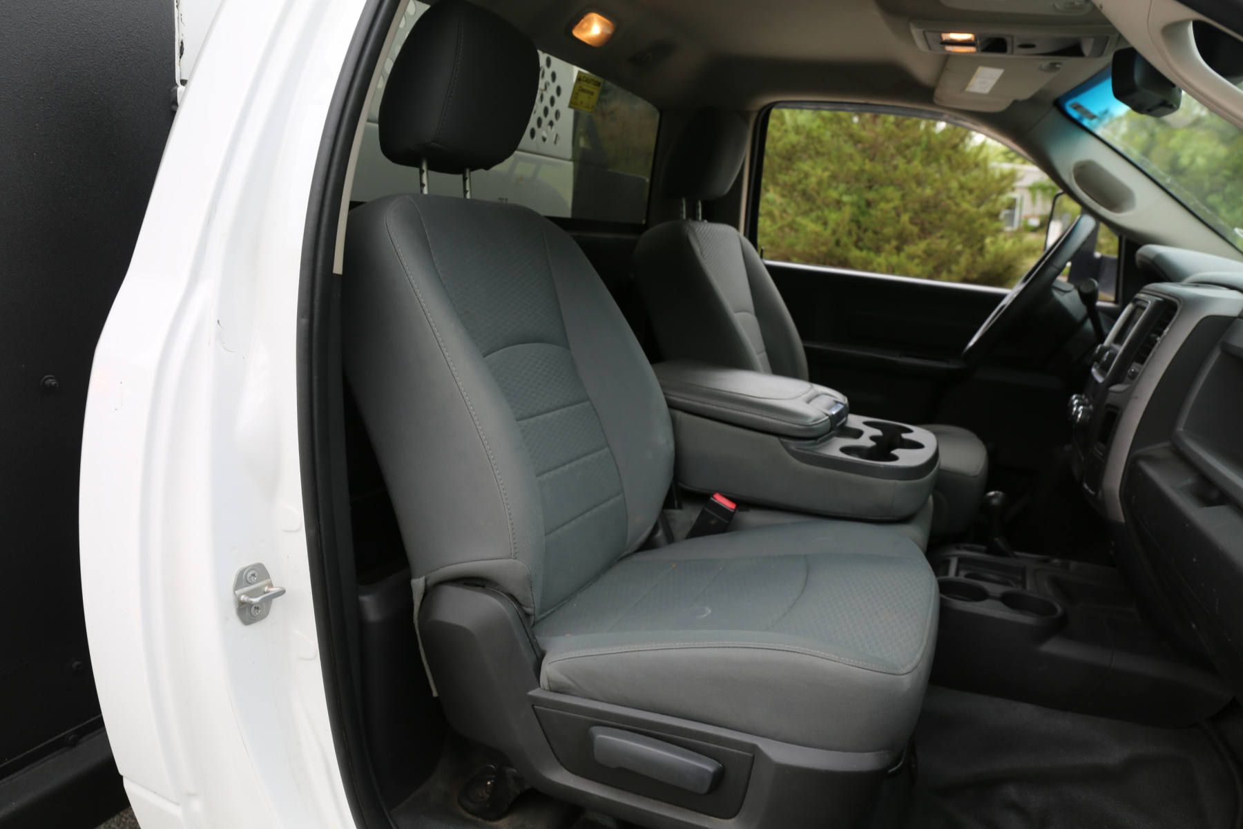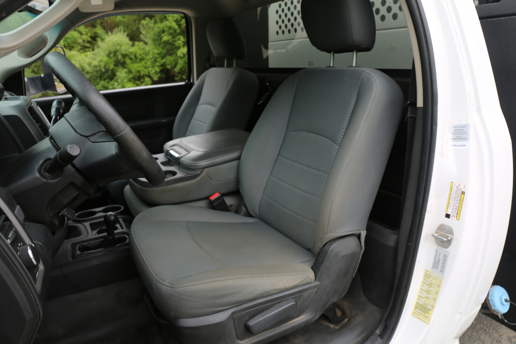 Work truck trim with vinyl seats, rubber floors, and manual windows. The interior is clean and free of any rips or tears.