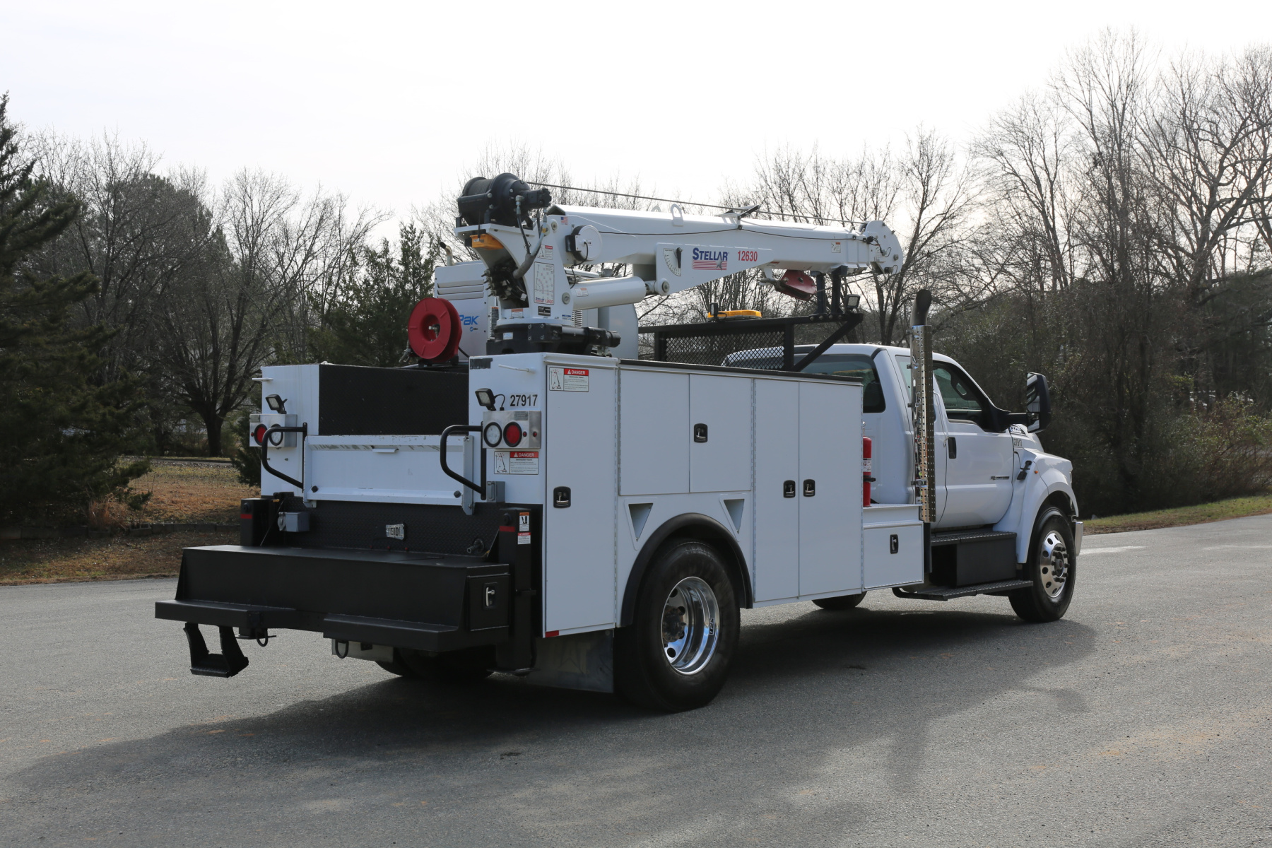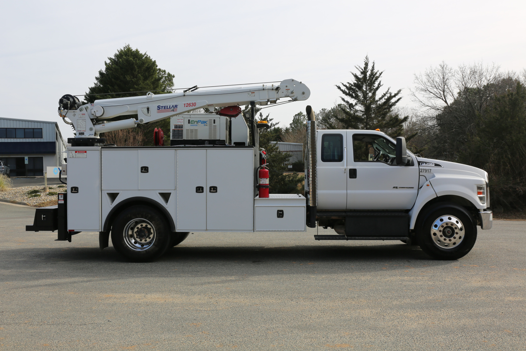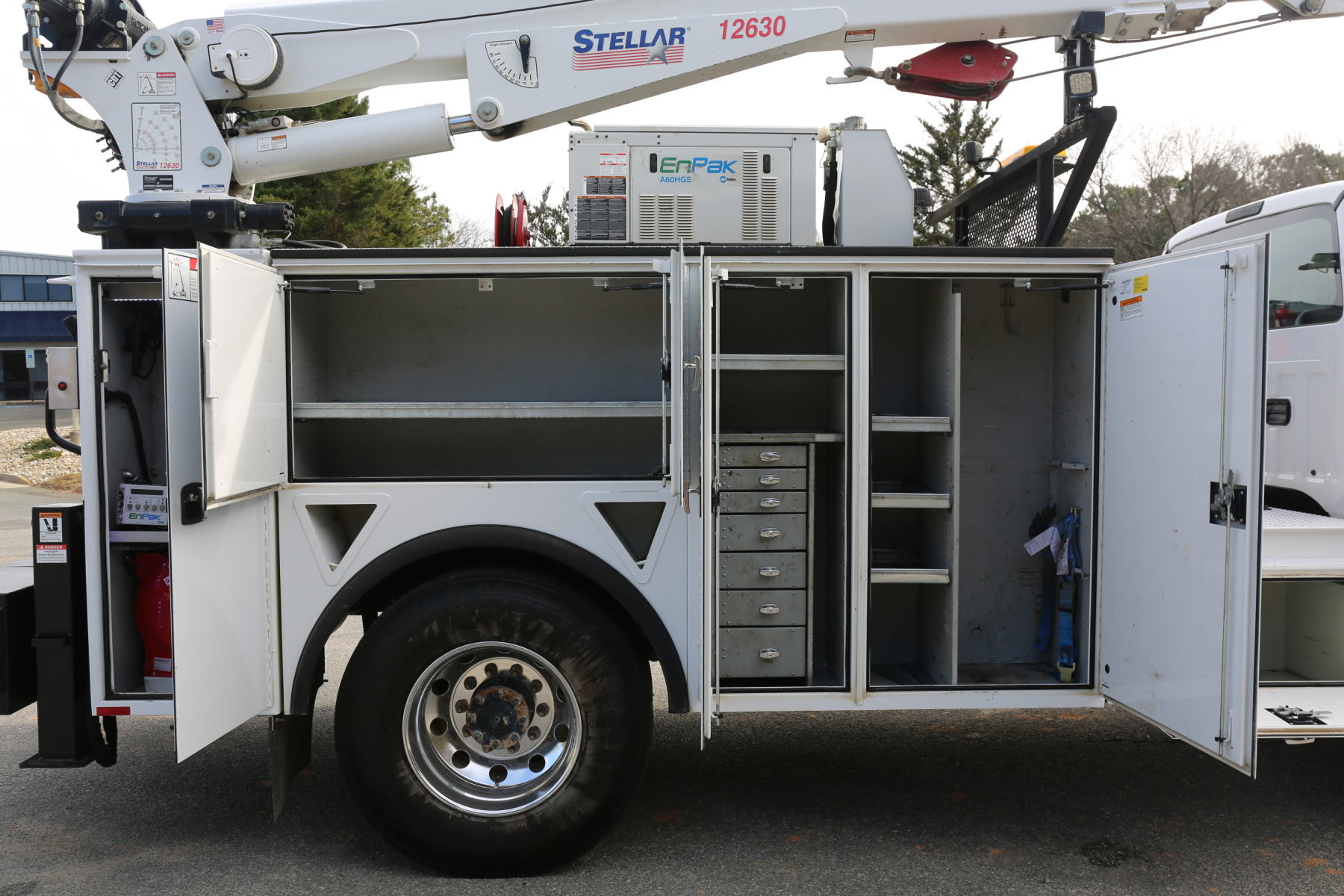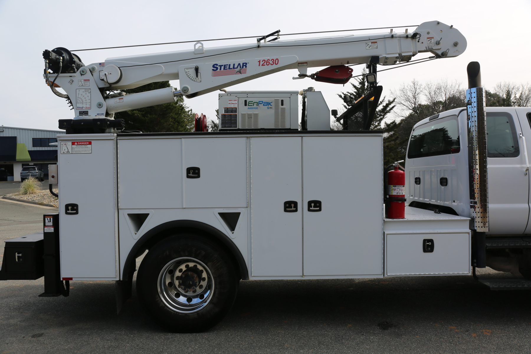 Extended cab configuration with a 3′ weld deck, and then an 11′ Knapheide mechanics body. Miller EnPak, Stellar 12630 crane, five total drawer sets. Very well equipped truck.