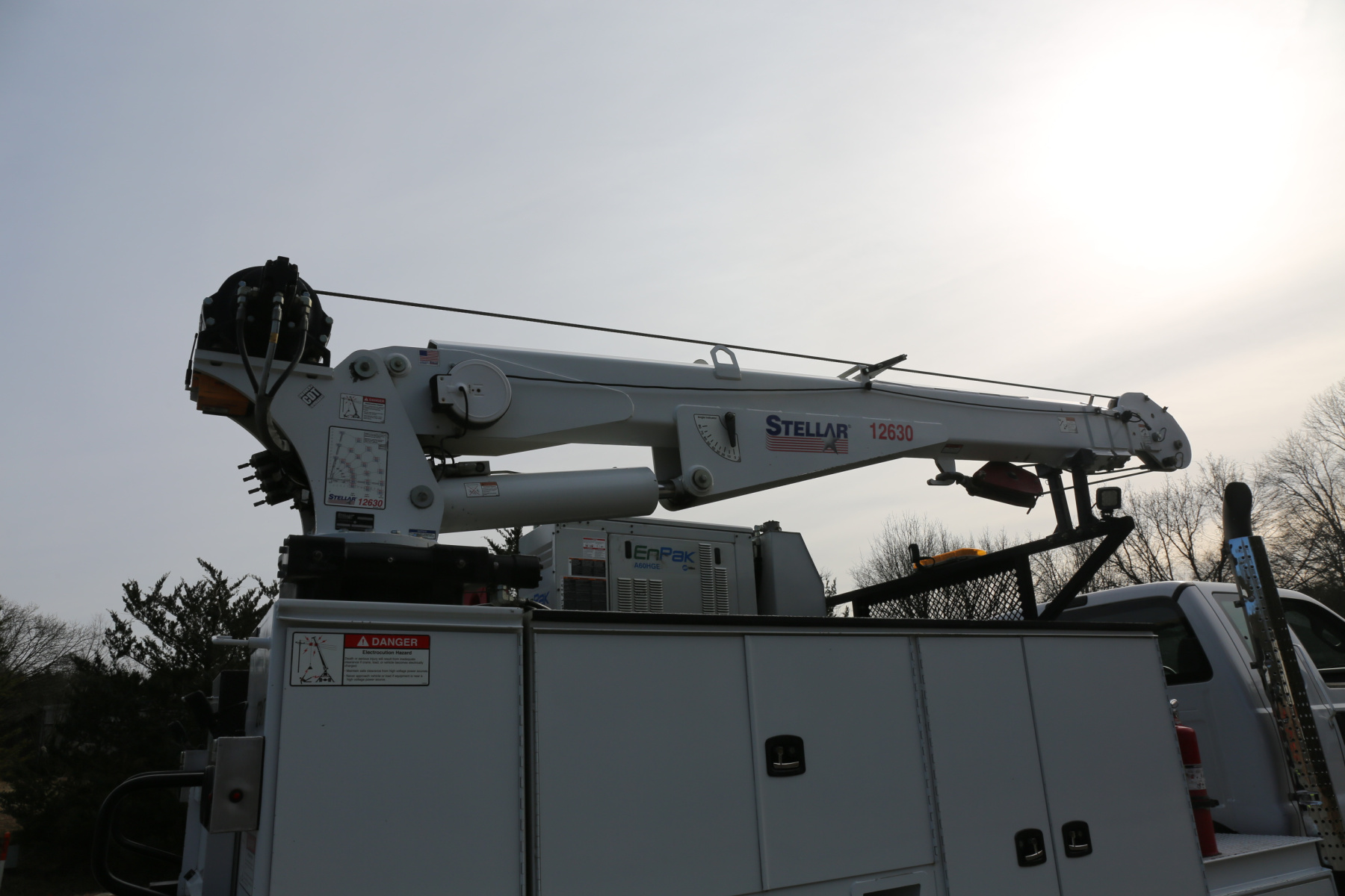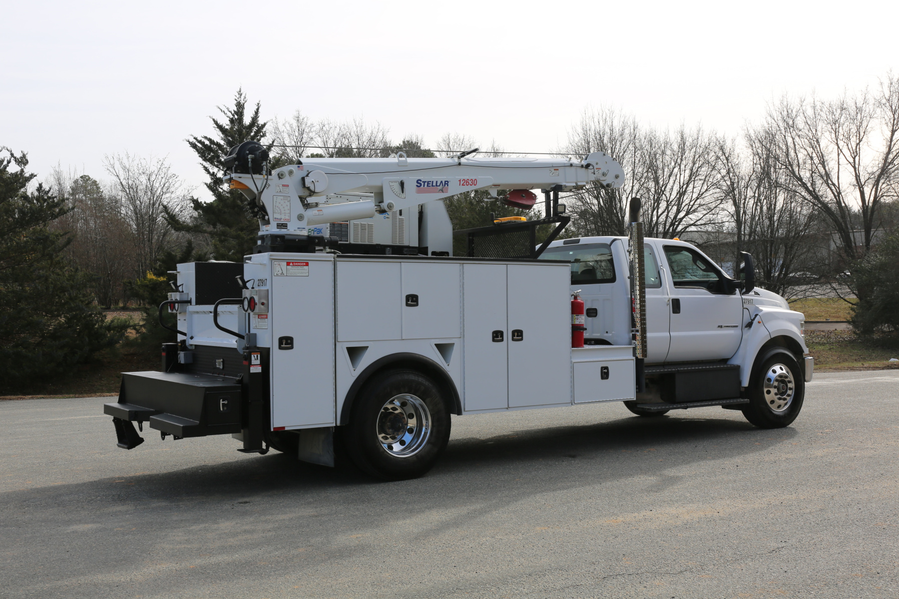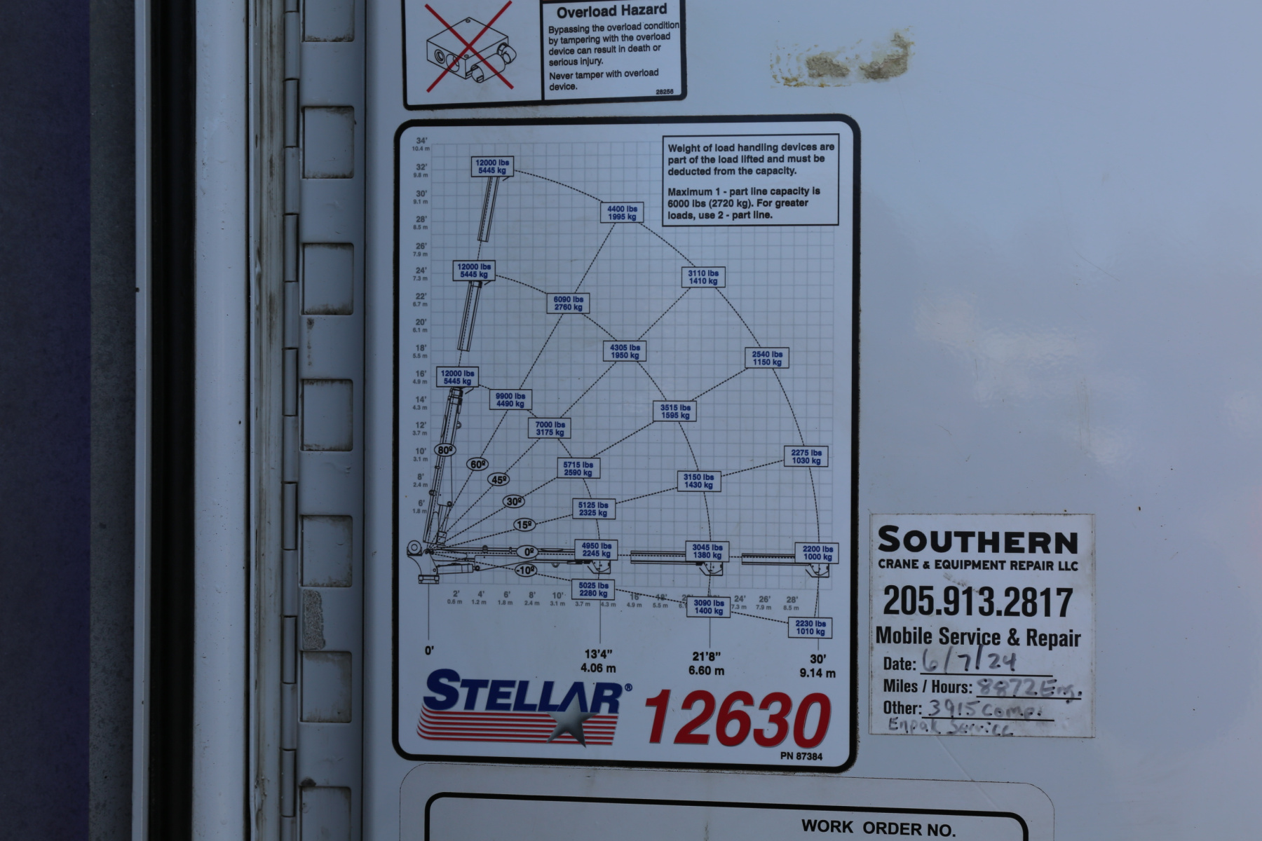 The crane is a Stellar 12630, with a 12,000# maximum lifting capacity and a two stage hydraulic extension out to 30′ of reach. Run off a factory wireless remote. The crane operates as it should.