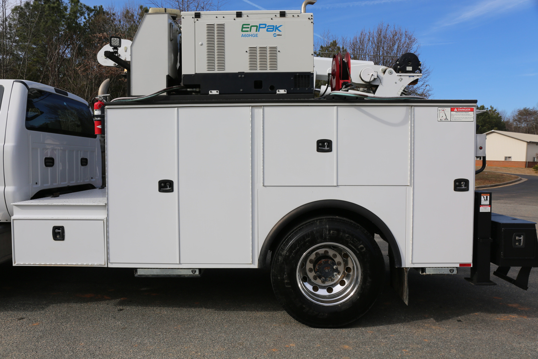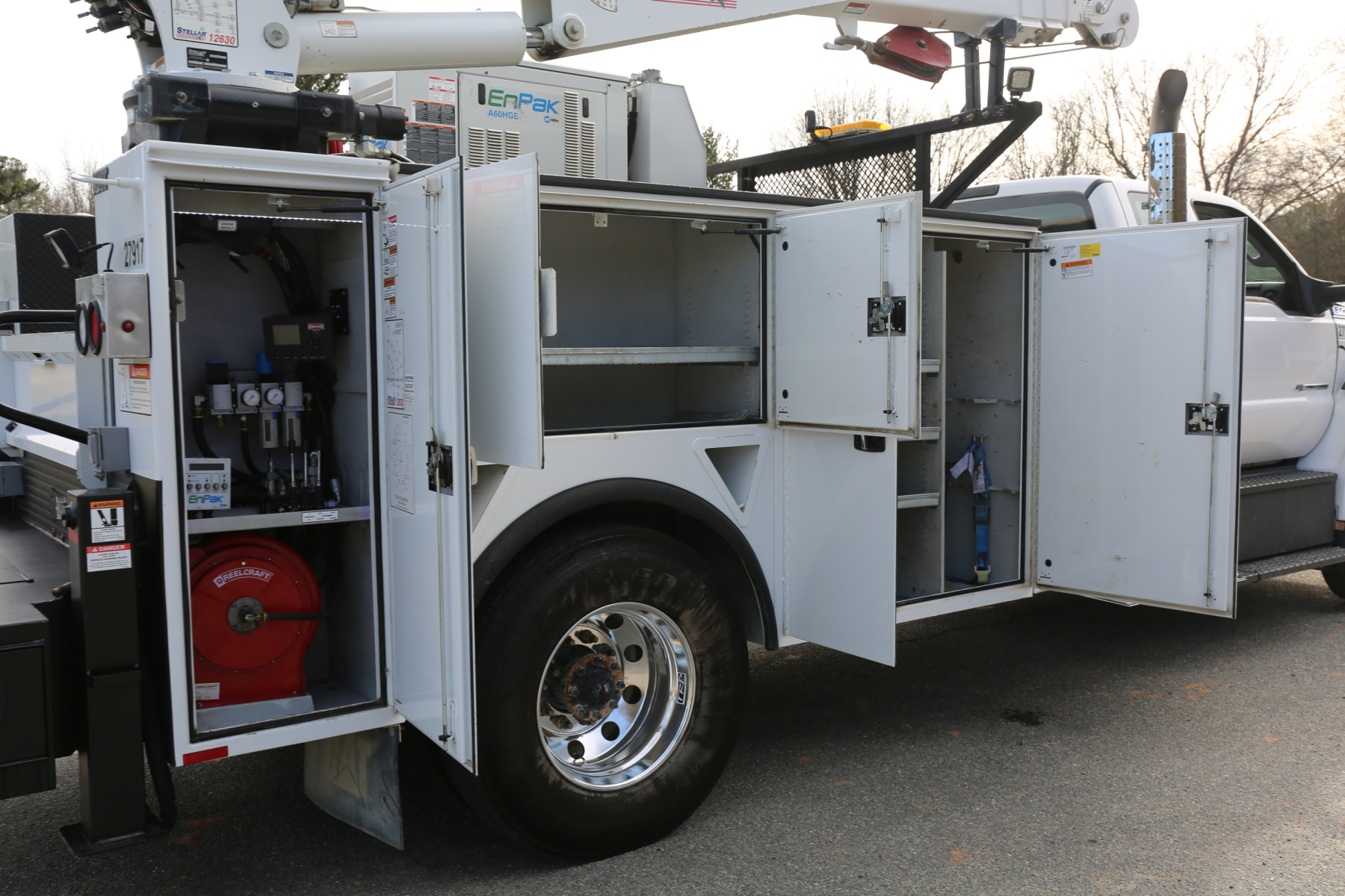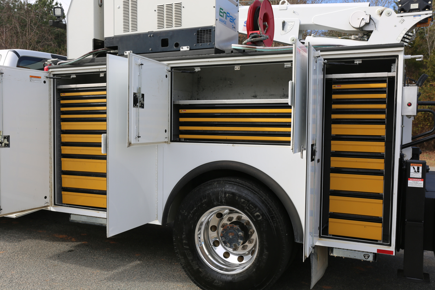 Large work bench rear bumper with pass through bin storage underneath, hydraulic outriggers, master slide locks for the bed, rear strobes, and rear mounted outlets from the EnPak.