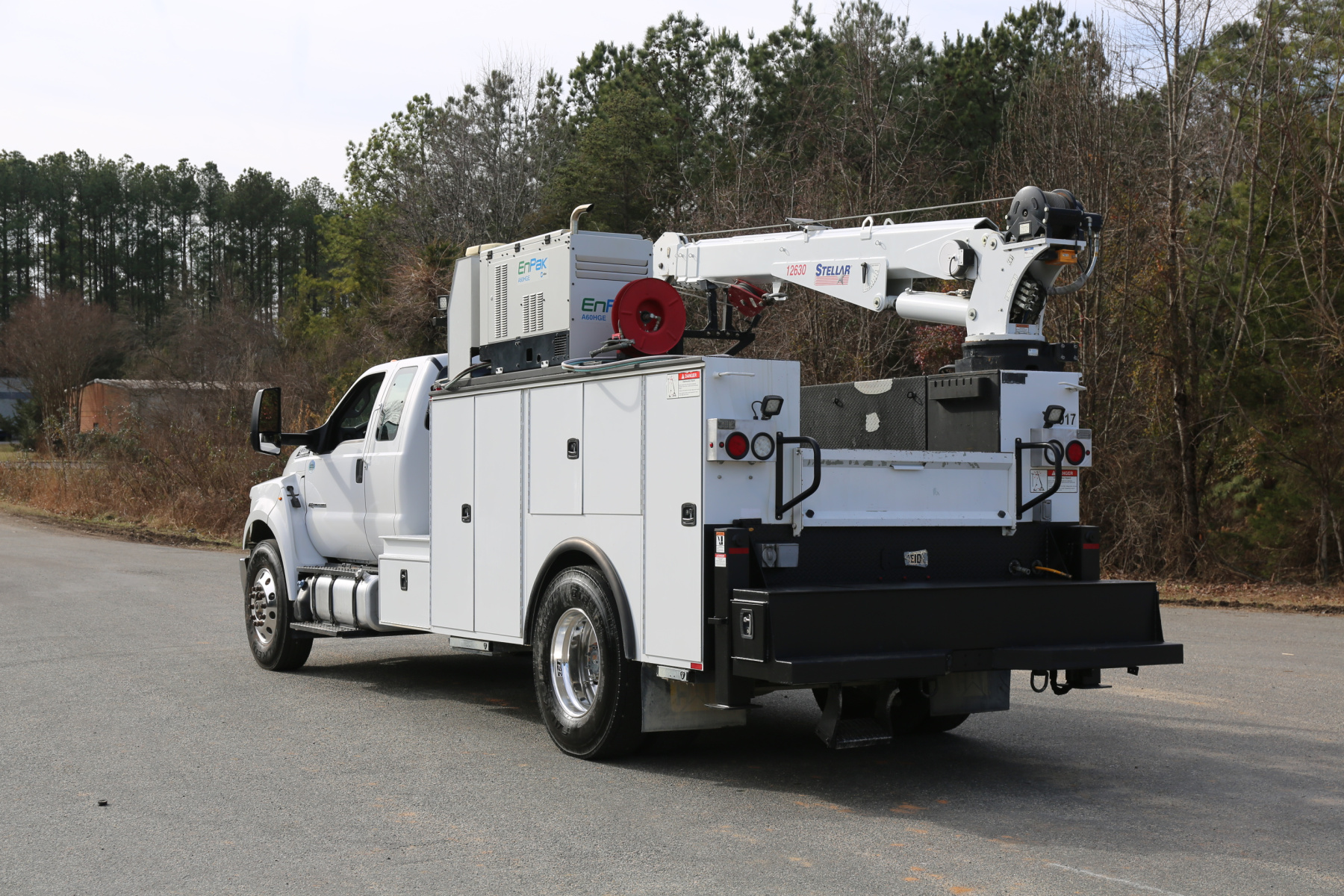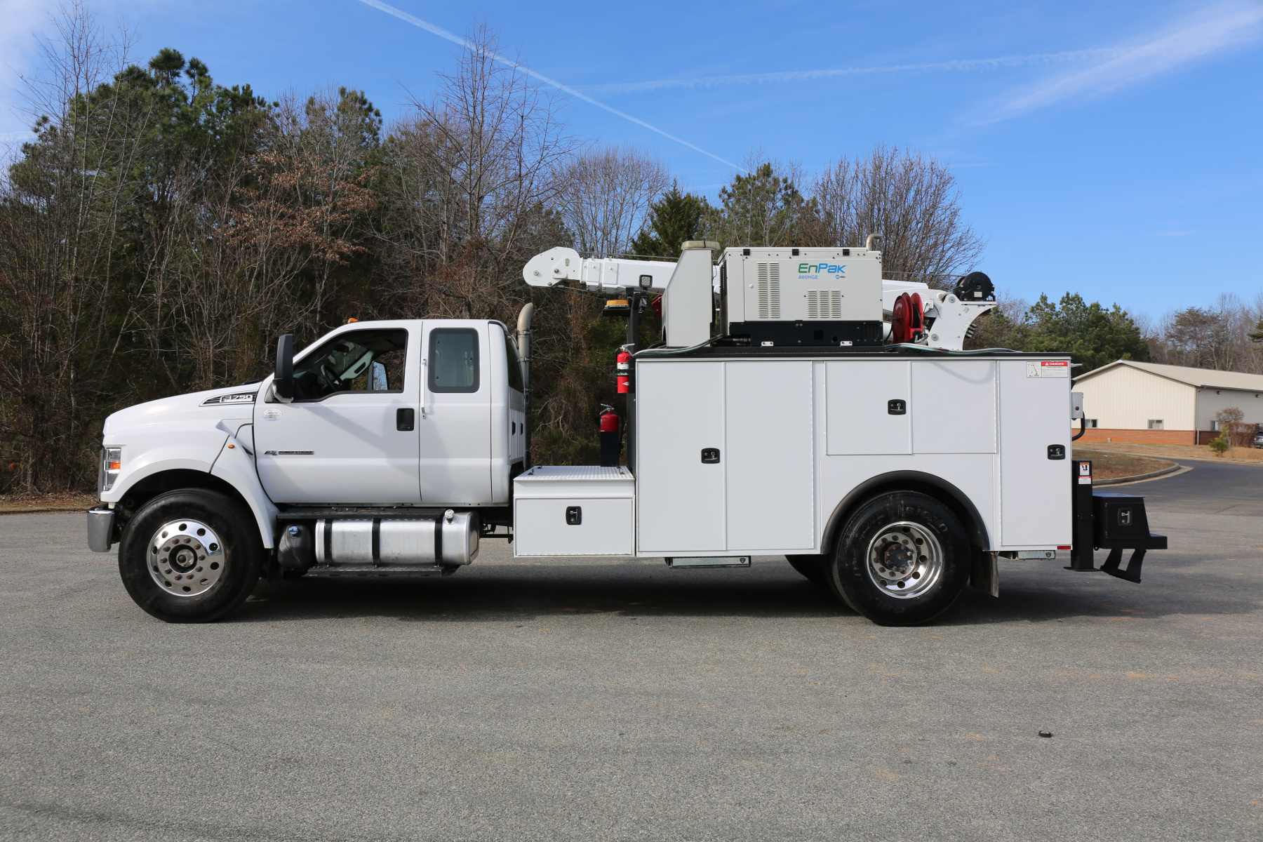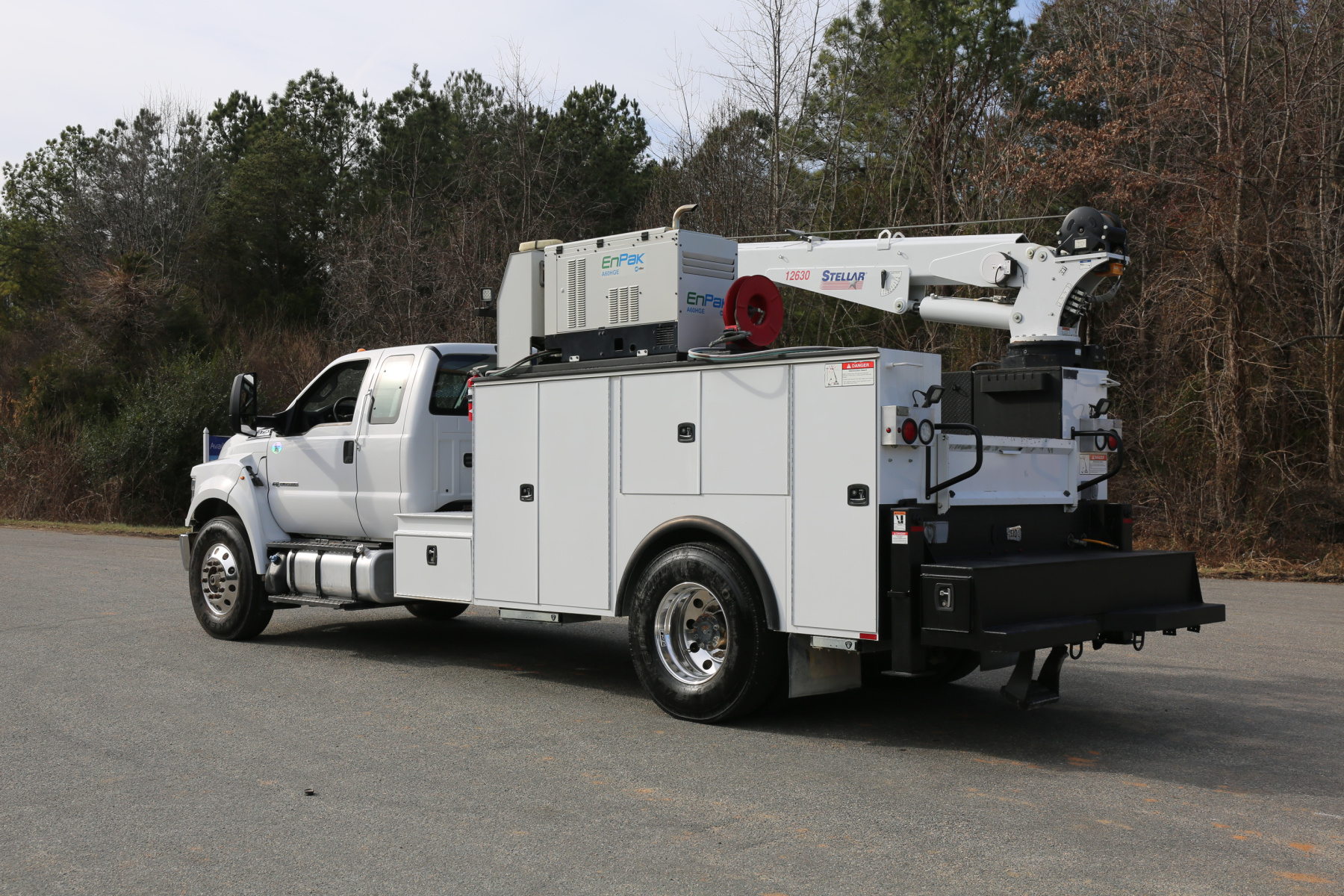 Large work bench rear bumper with pass through bin storage underneath, hydraulic outriggers, master slide locks for the bed, rear strobes, and rear mounted outlets from the EnPak.
