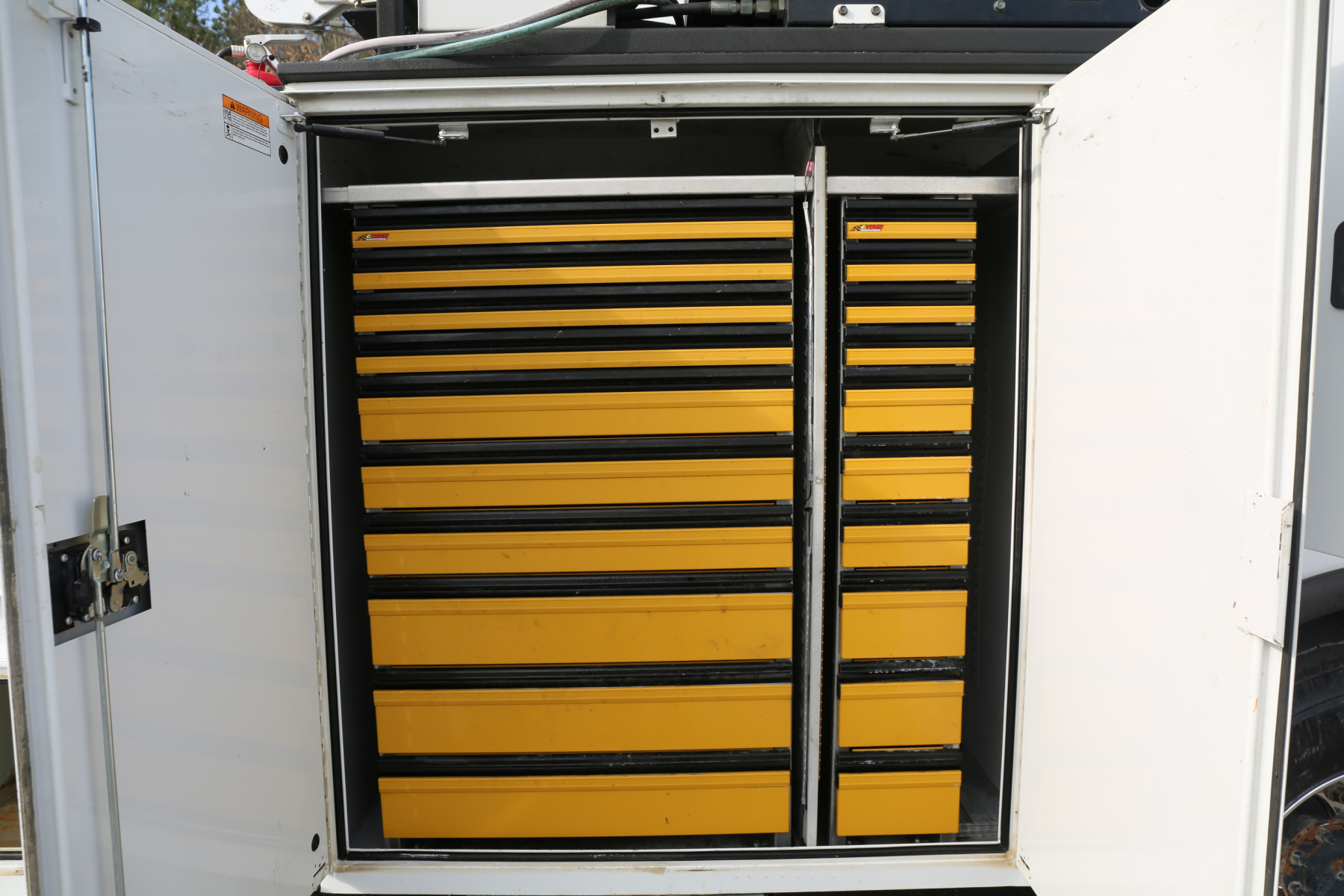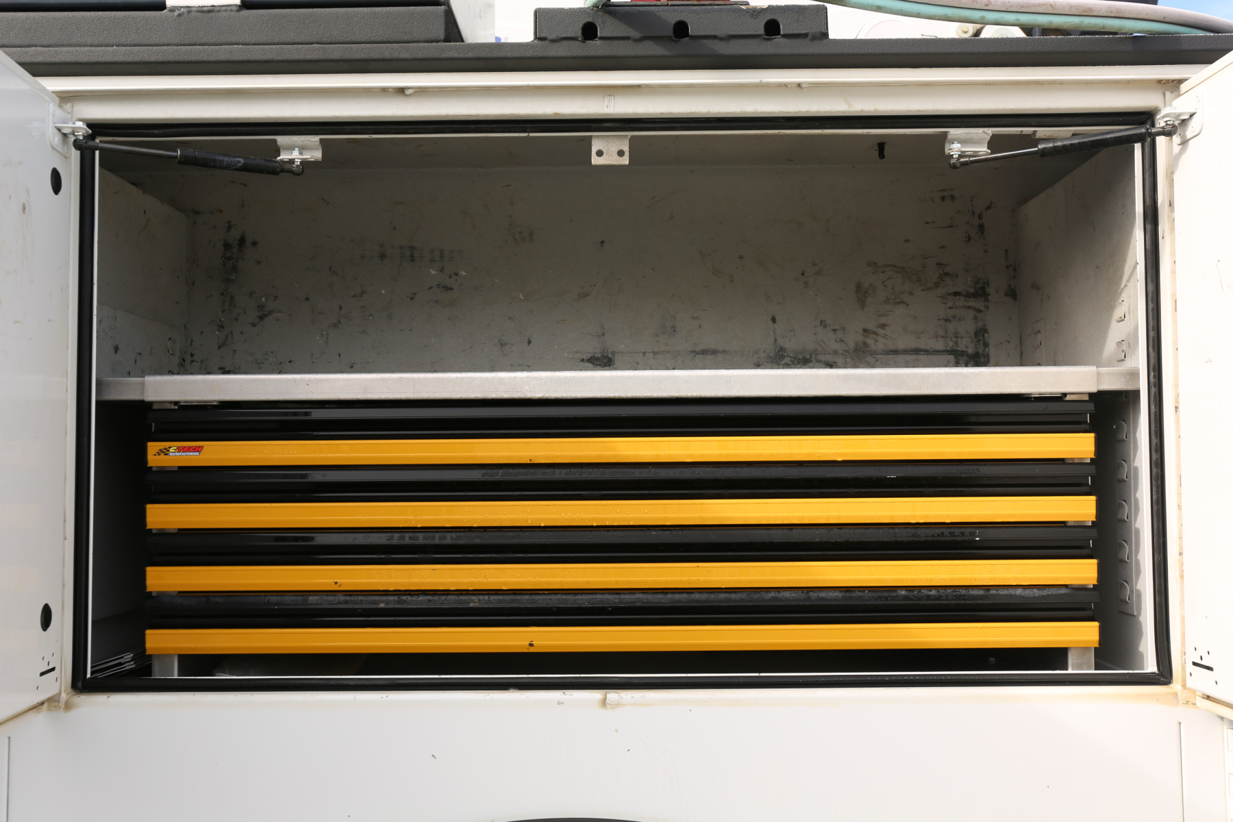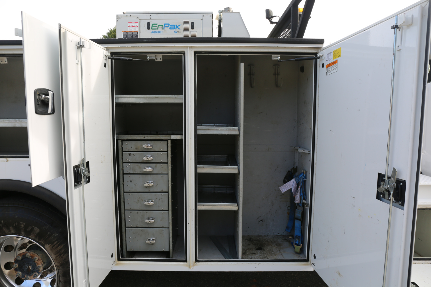 In front of the body is a 3′ Knapheide weld deck, with storage underneath. The D1 compartment houses a full set of CTech drawers, filling the whole compartment, ten total. Slide out step located underneath the D1 compartment for accessing higher drawers.
