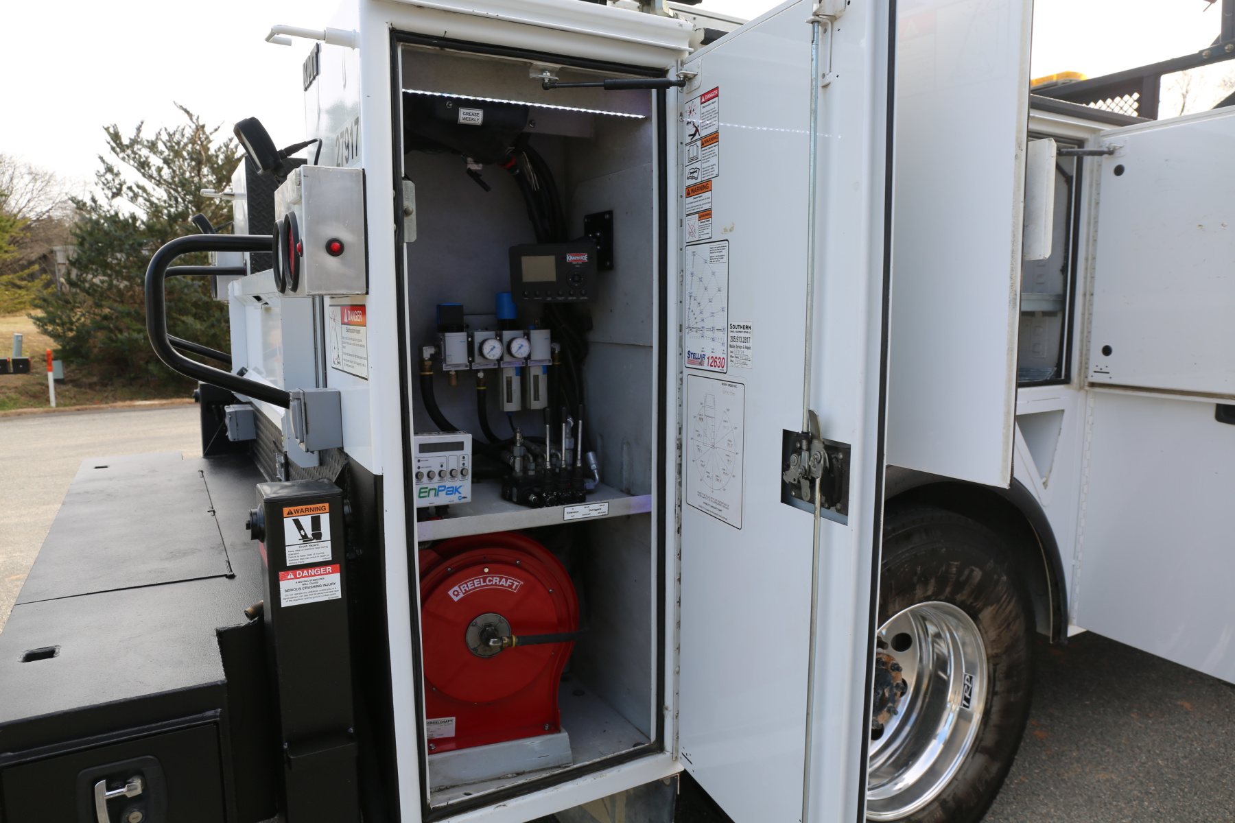 The crane compartment houses the EnPak control unit, outrigger control levers, a Reelcraft hose reel, and the body control panel for the bed lighting.