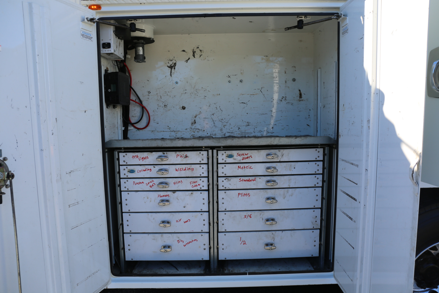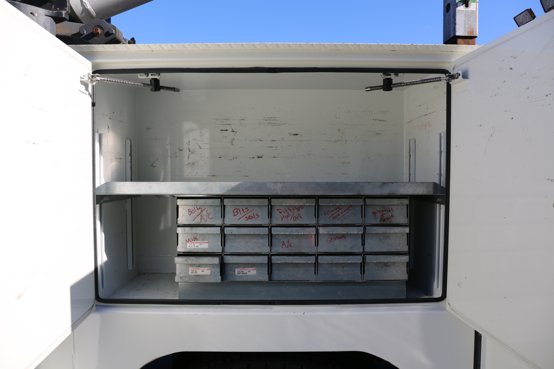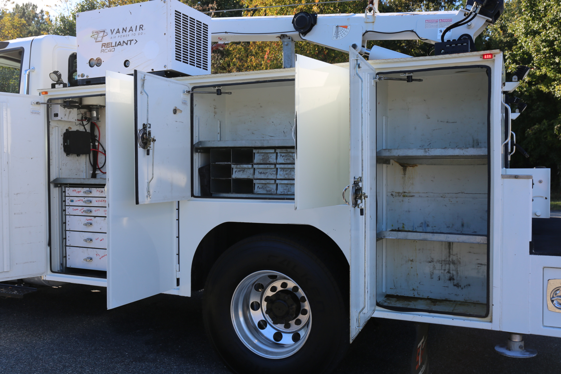1 owner, southern owned truck, with no rust in the service body or truck frame. Very well equipped with an 11′ STI service body, 11k Tiger crane, two sets of drawers, Vanair RC40 hydraulic compressor, and hydraulic outriggers.