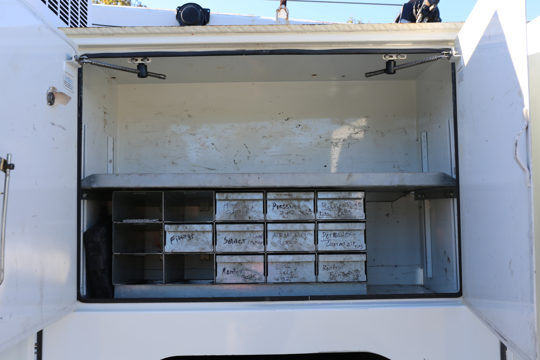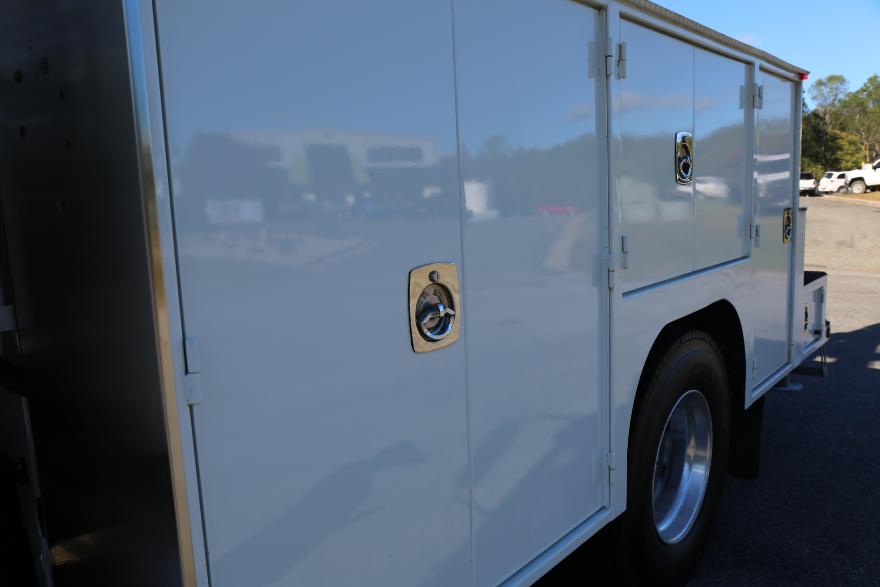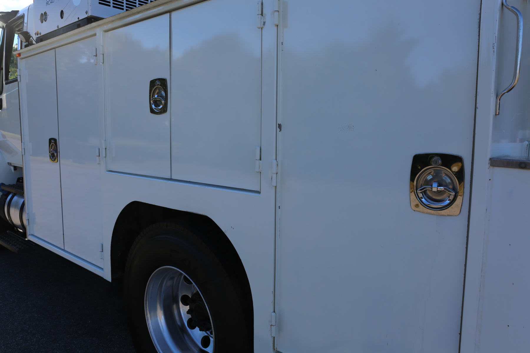 The factory paint is intact and in good shape on the service body, with minimal rock chipping. No scratches, dents, or damage to the bed. All doors close, latch, lock, and seal as they should. All bins are watertight, all latches keyed the same. One set of keys for the service body.