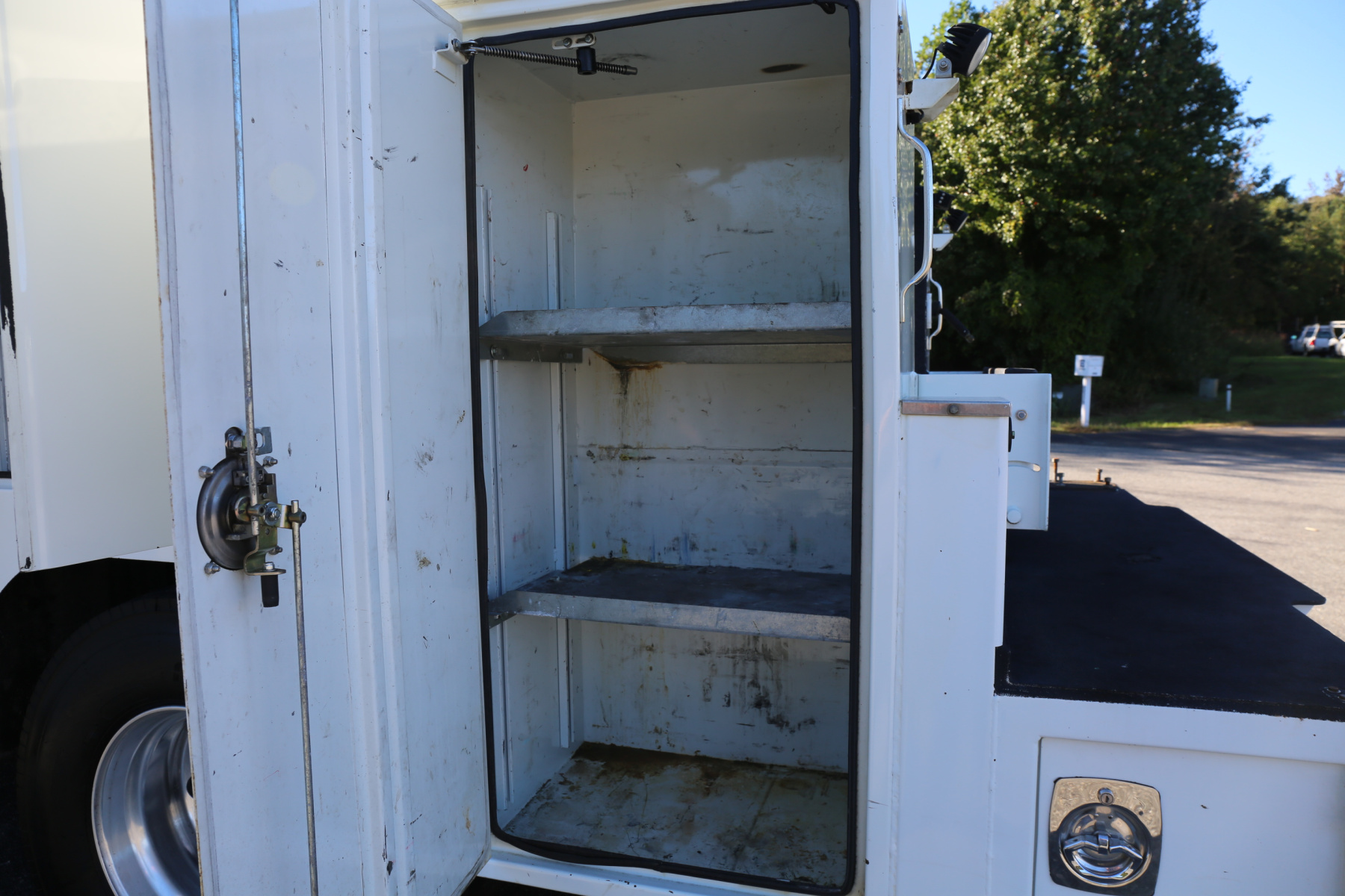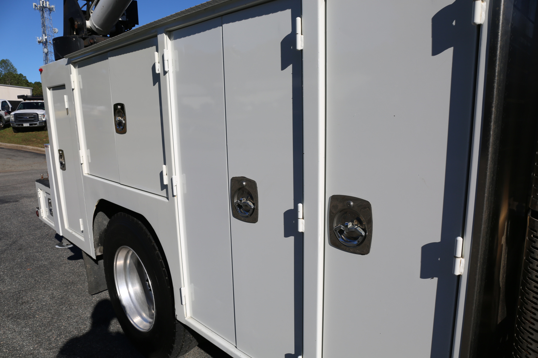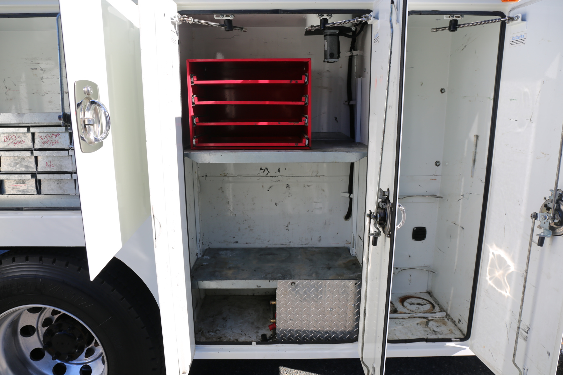 The factory paint is intact and in good shape on the service body, with minimal rock chipping. No scratches, dents, or damage to the bed. All doors close, latch, lock, and seal as they should. All bins are watertight, all latches keyed the same. One set of keys for the service body.