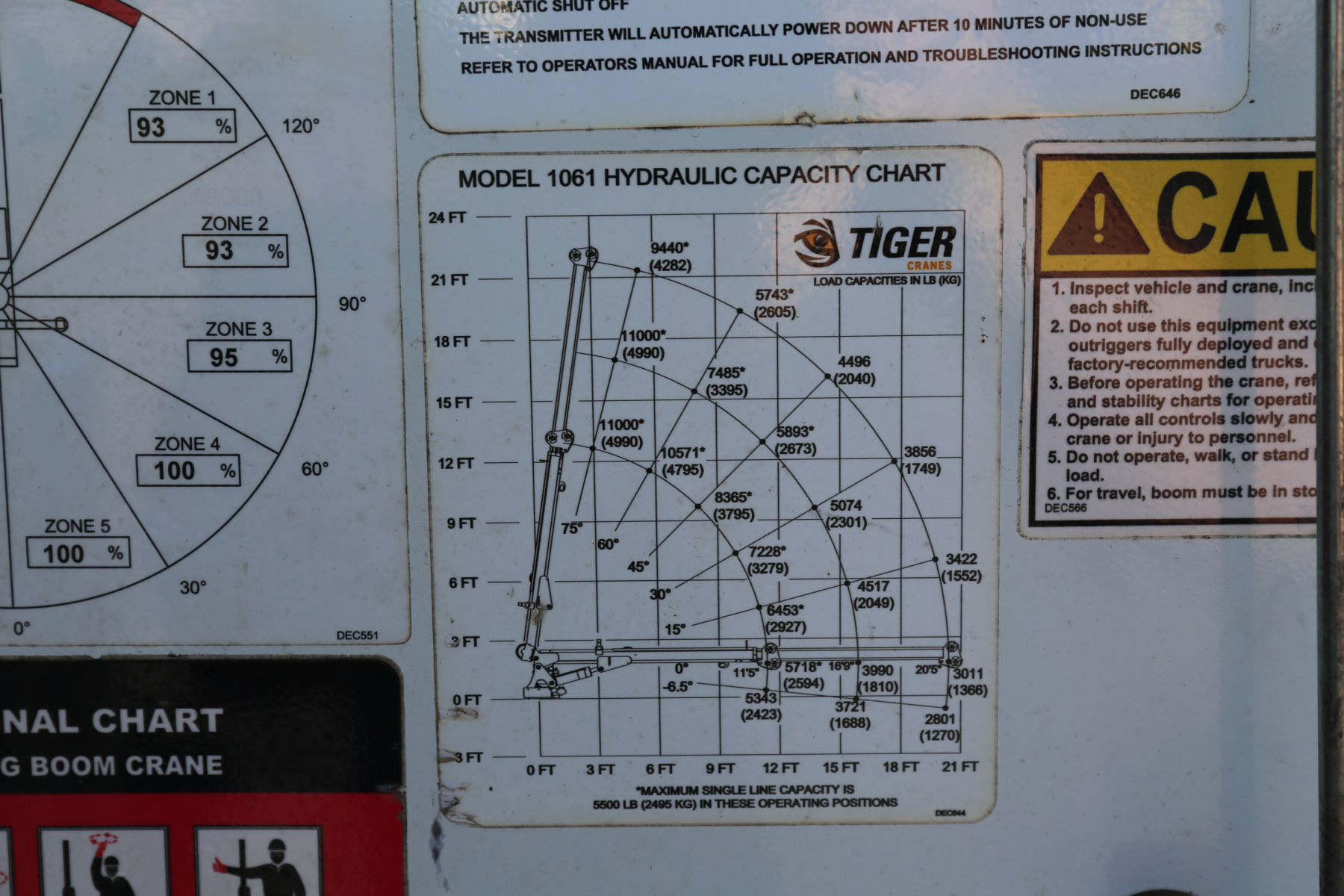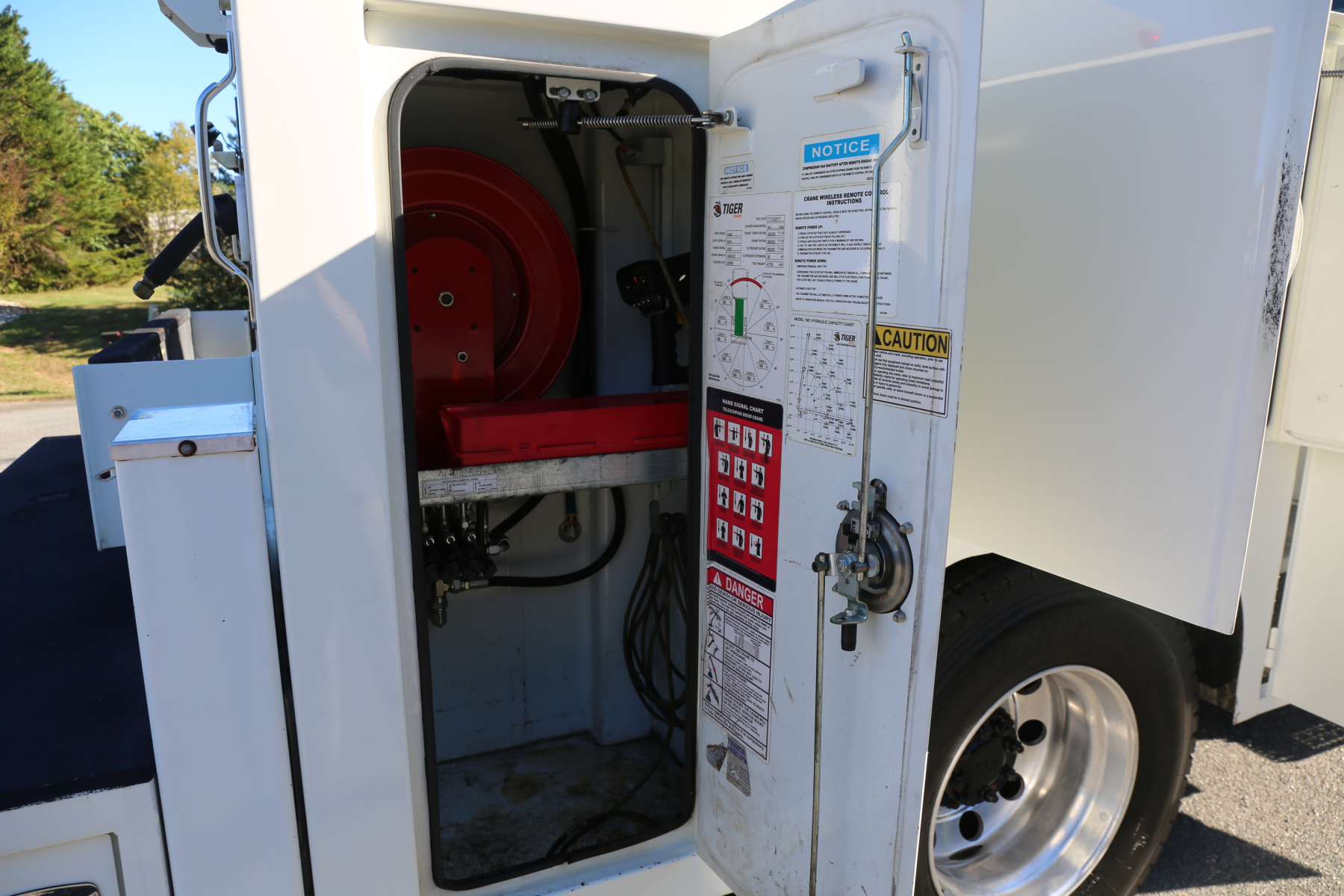 The crane is a Tiger 1061, with an 11,000# maximum lifting capacity, and hydraulic extension out to 21′ of total reach. Run off a factory wireless remote, the remote turns the compressor on and off and also controls the truck idle and has engine start/stop function.