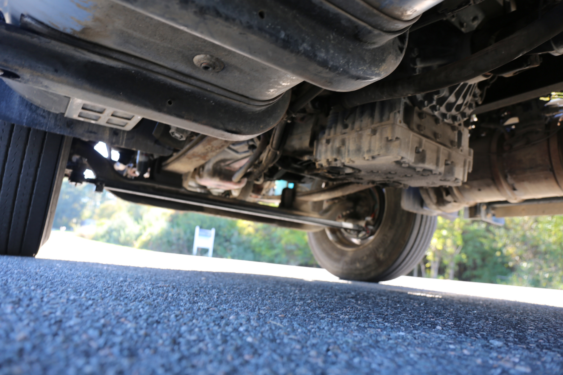 Large work bench rear bumper with pass through bin storage underneath, tow hitch receiver, driver’s side step, and a working rear view camera.