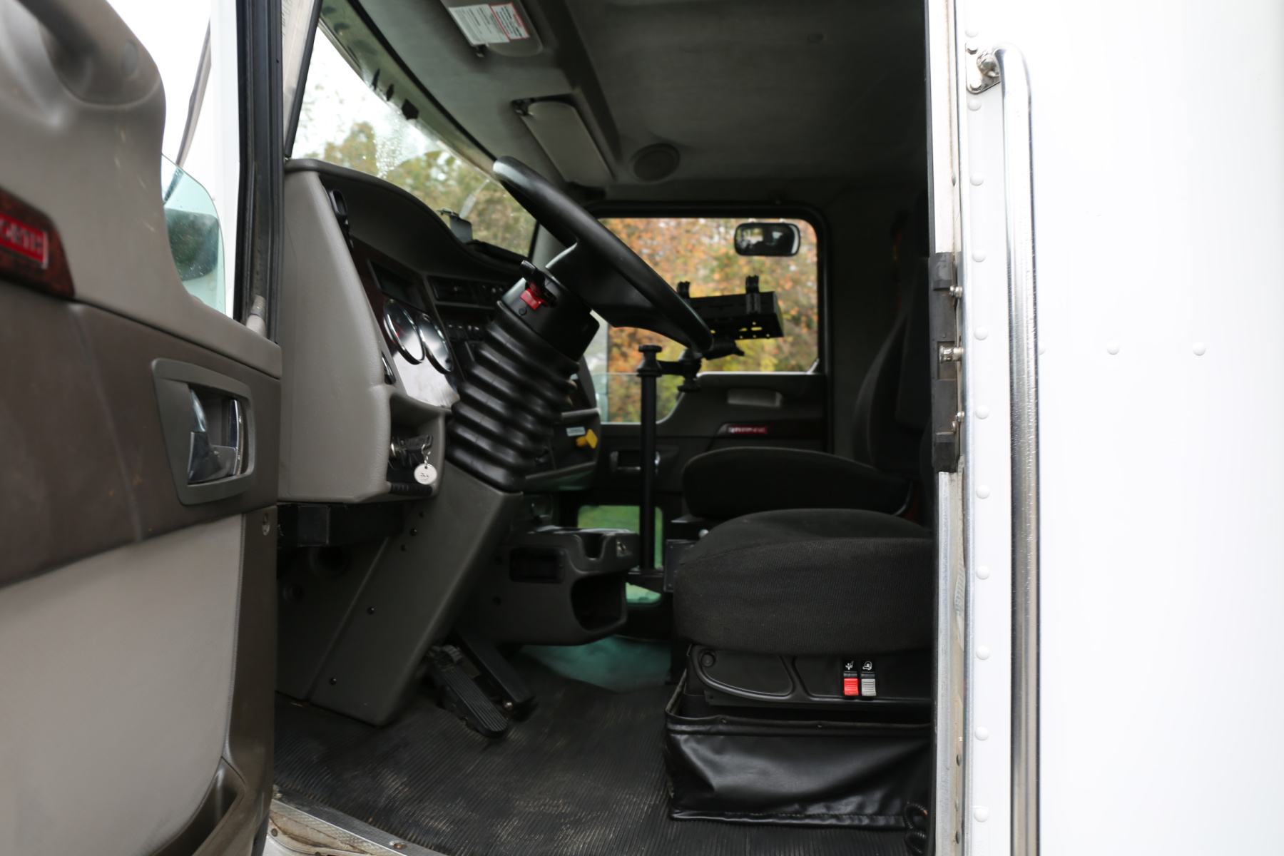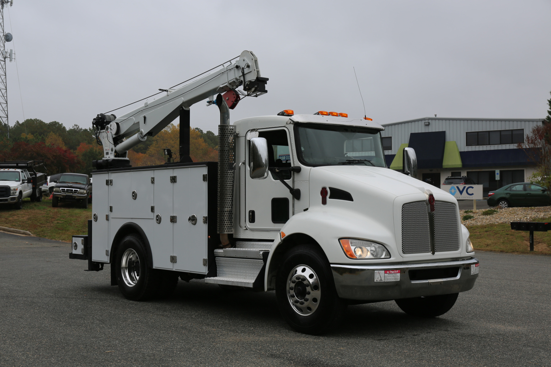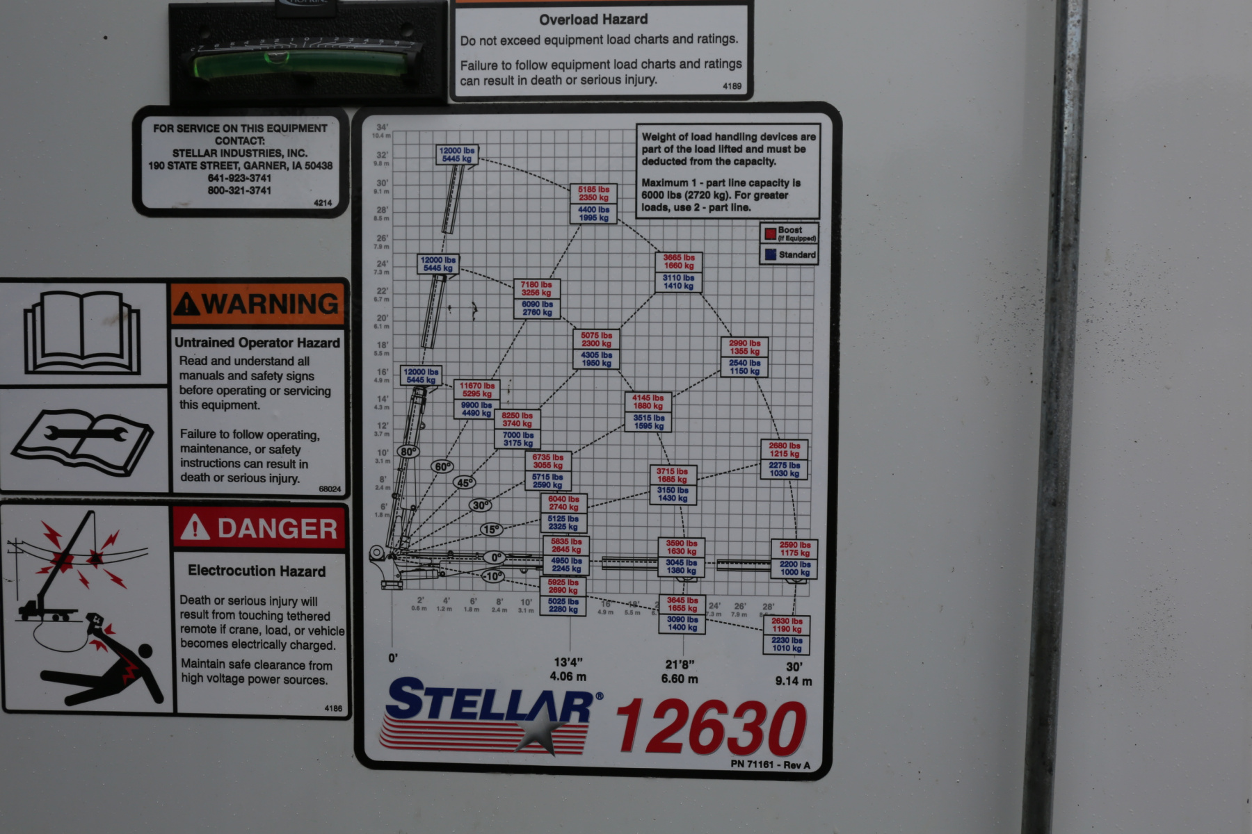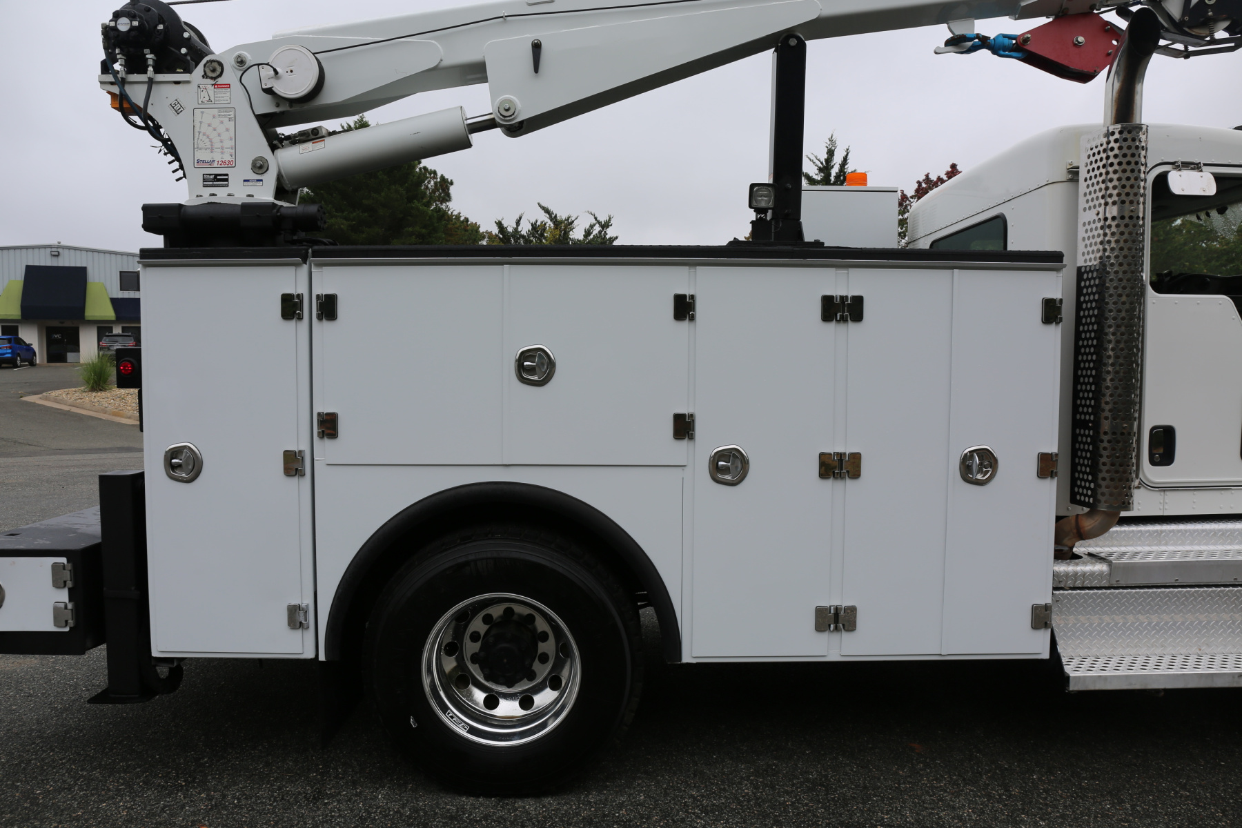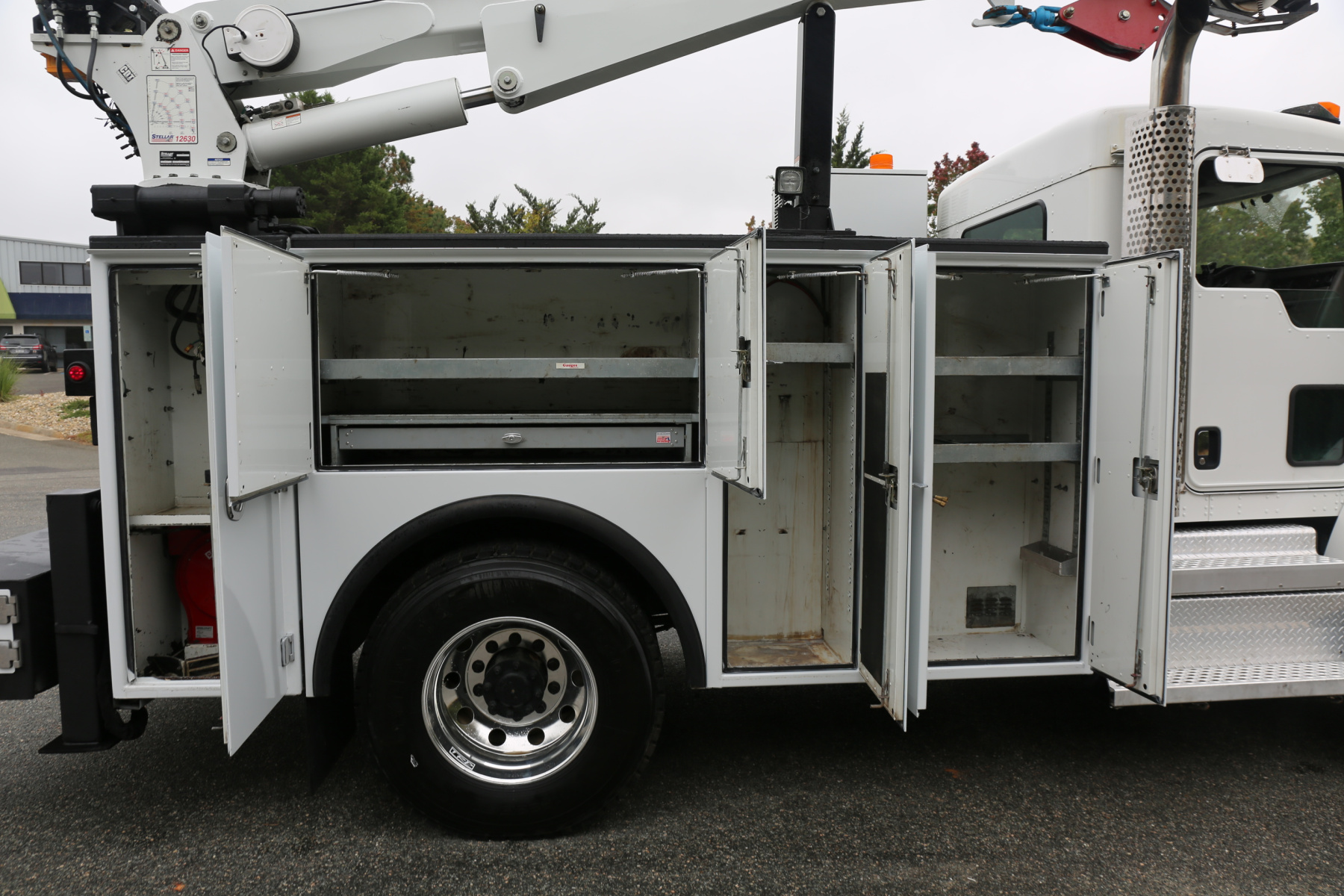 The crane is a Stellar 12630, with a 12,000# maximum capacity and a two stage extension out to 30′ of reach. Run off a factory wireless remote – the remote can turn the truck on and off, and also controls the compressor.