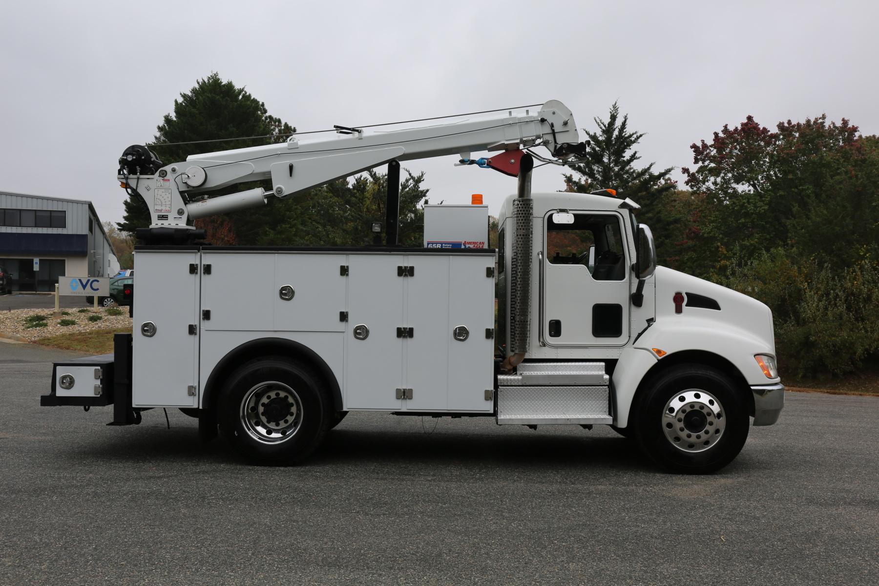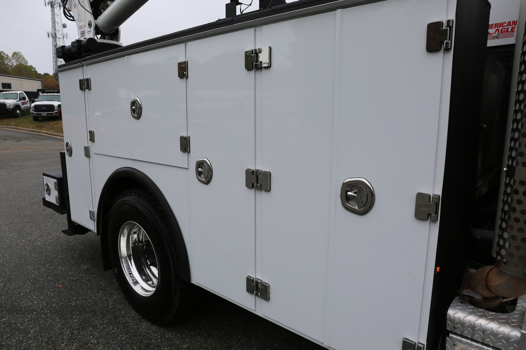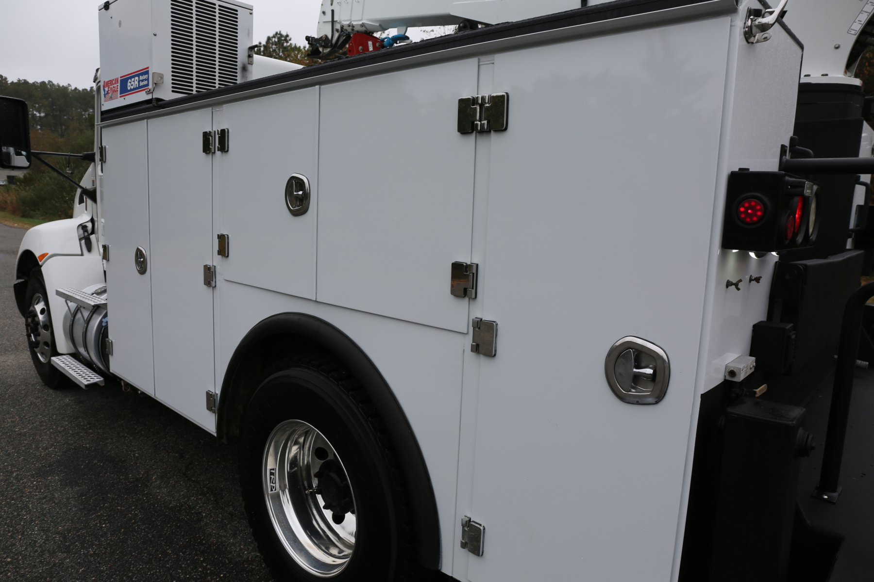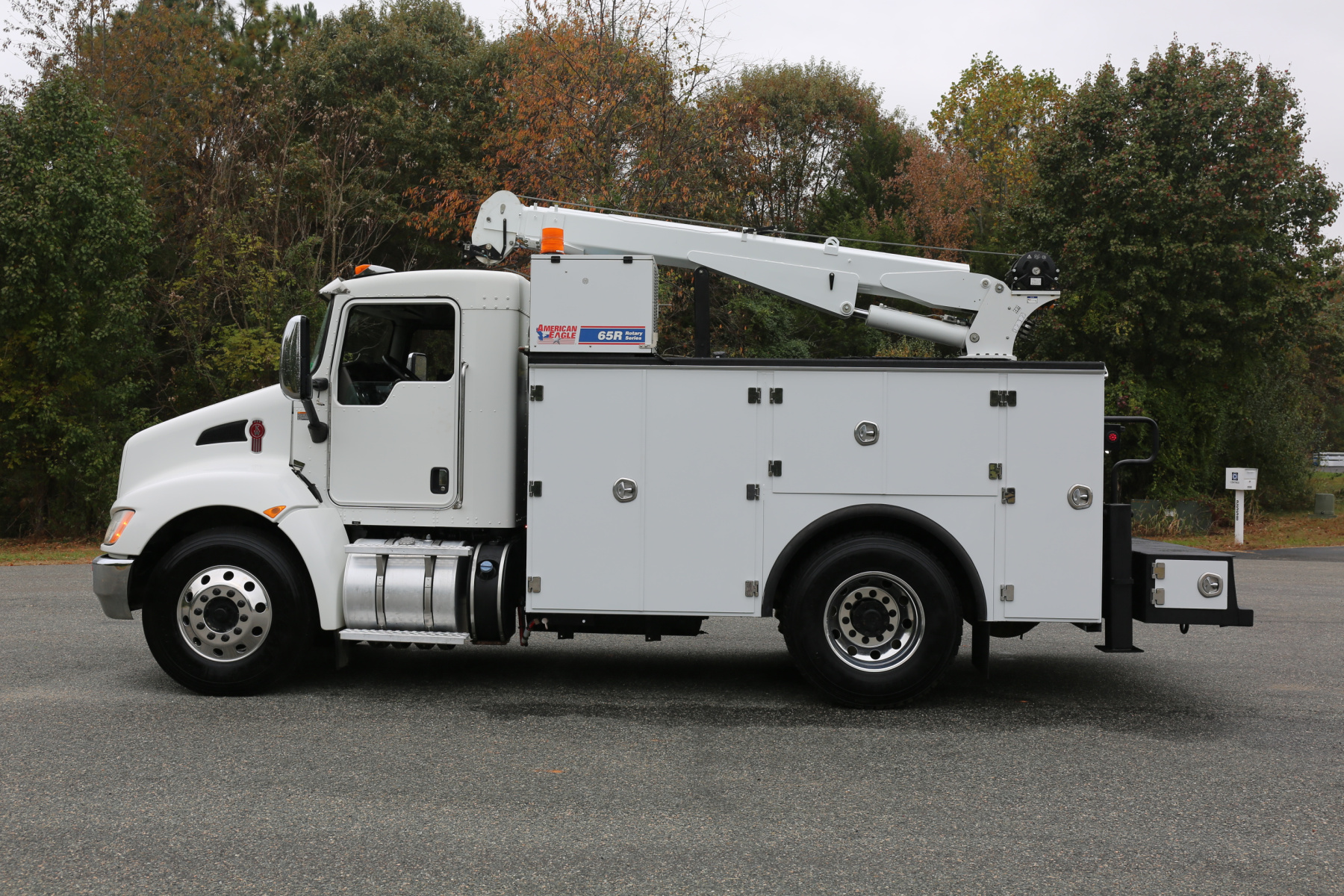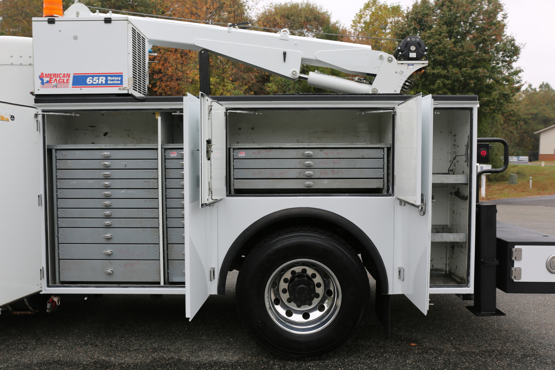 Equipped with an 11′ Stellar TMAX Service body, a 12630 Stellar crane, an American Eagle 65R rotary compressor, and three full American Eagle drawer sets.