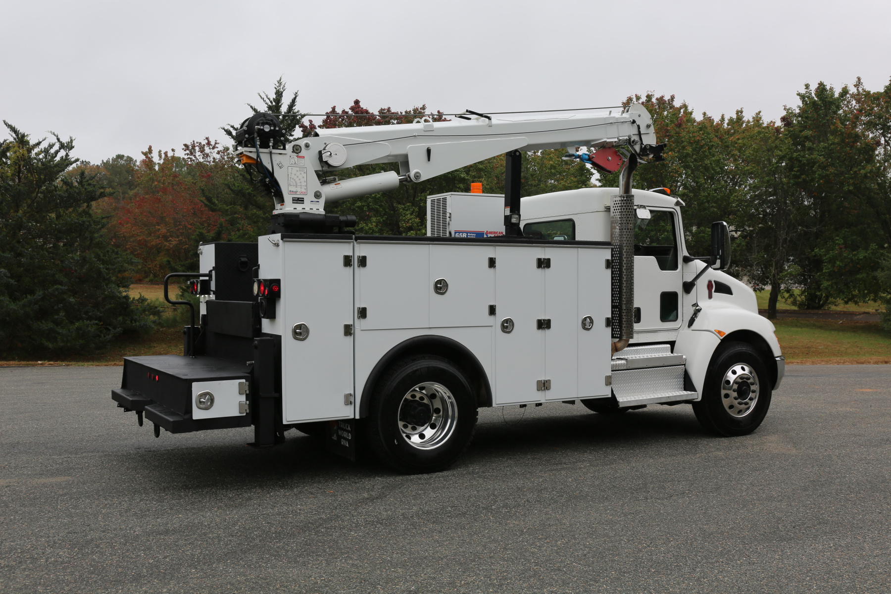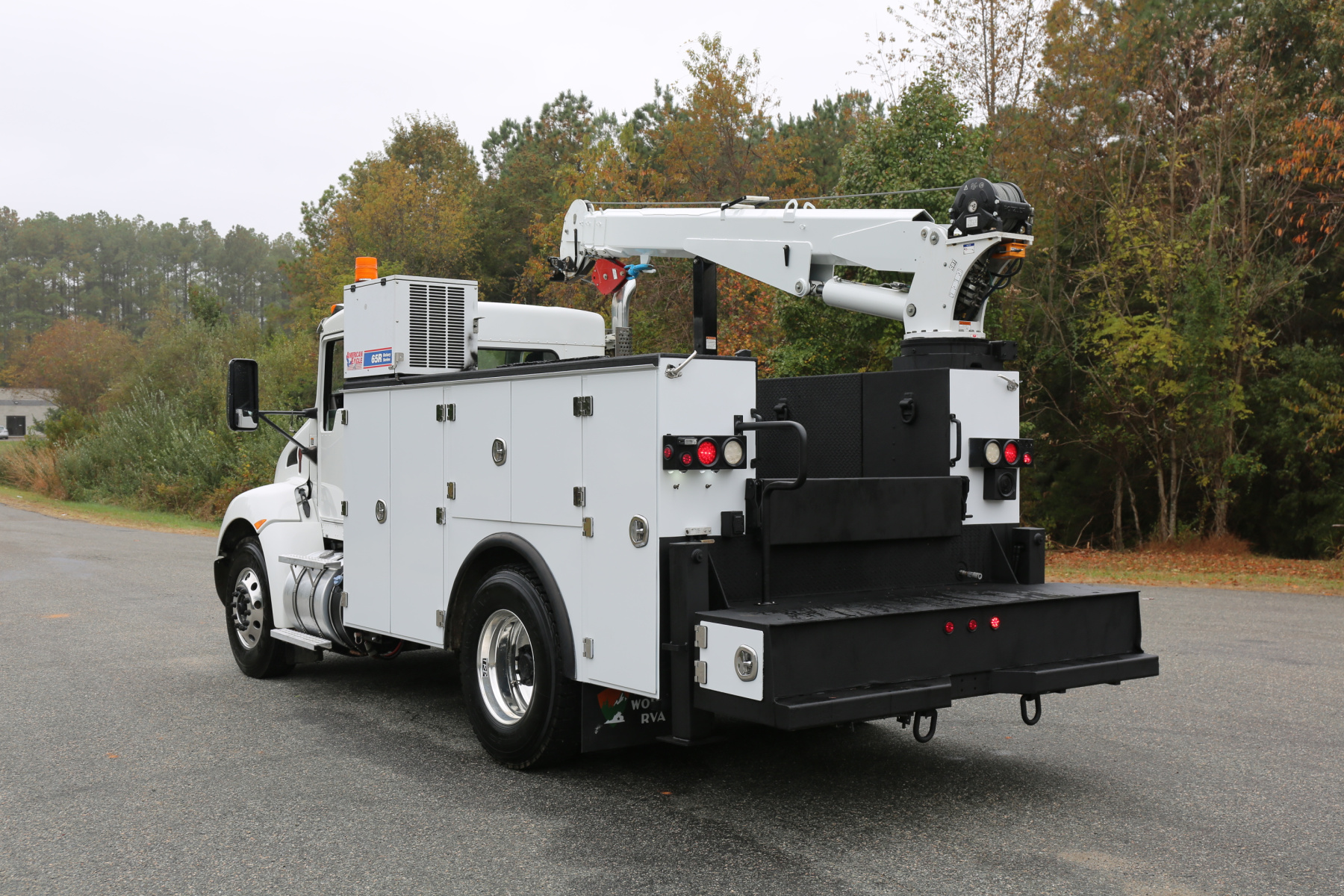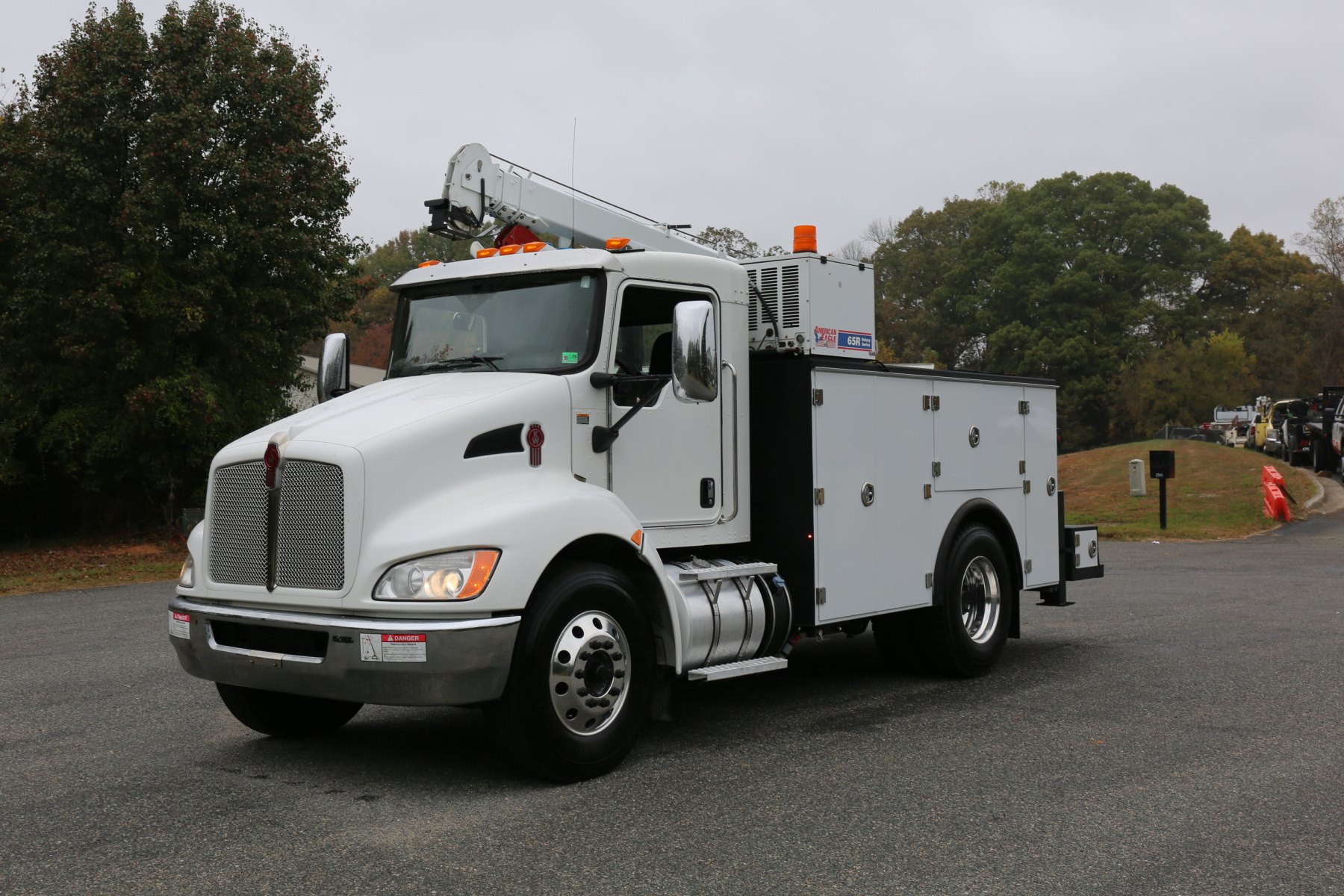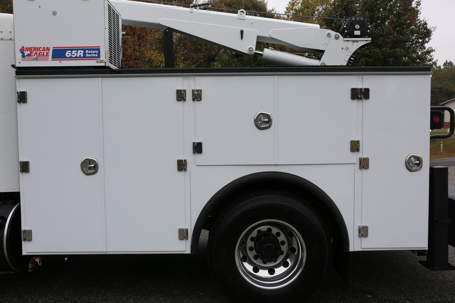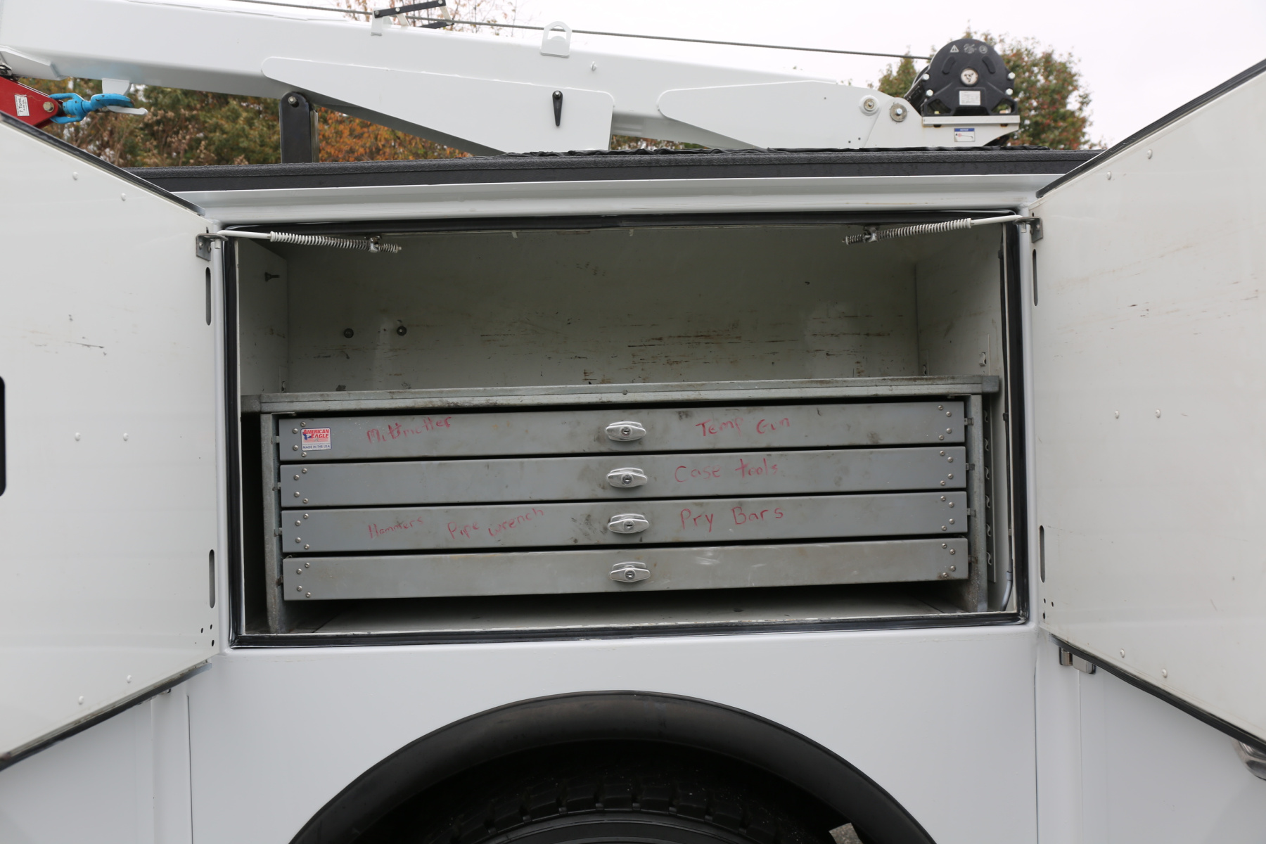 Equipped with an 11′ Stellar TMAX Service body, a 12630 Stellar crane, an American Eagle 65R rotary compressor, and three full American Eagle drawer sets.