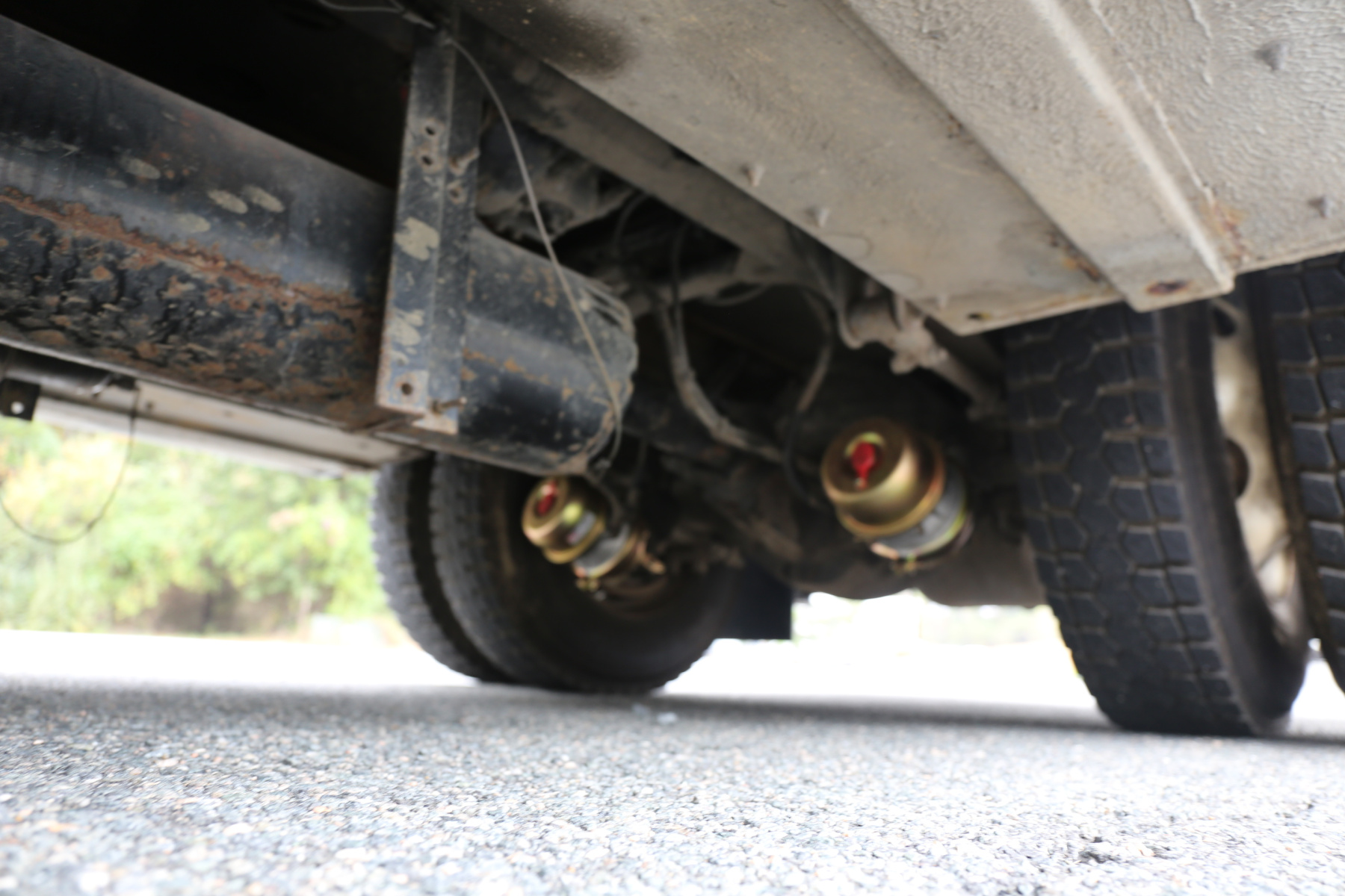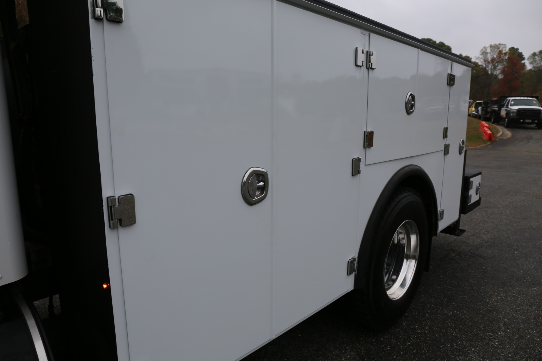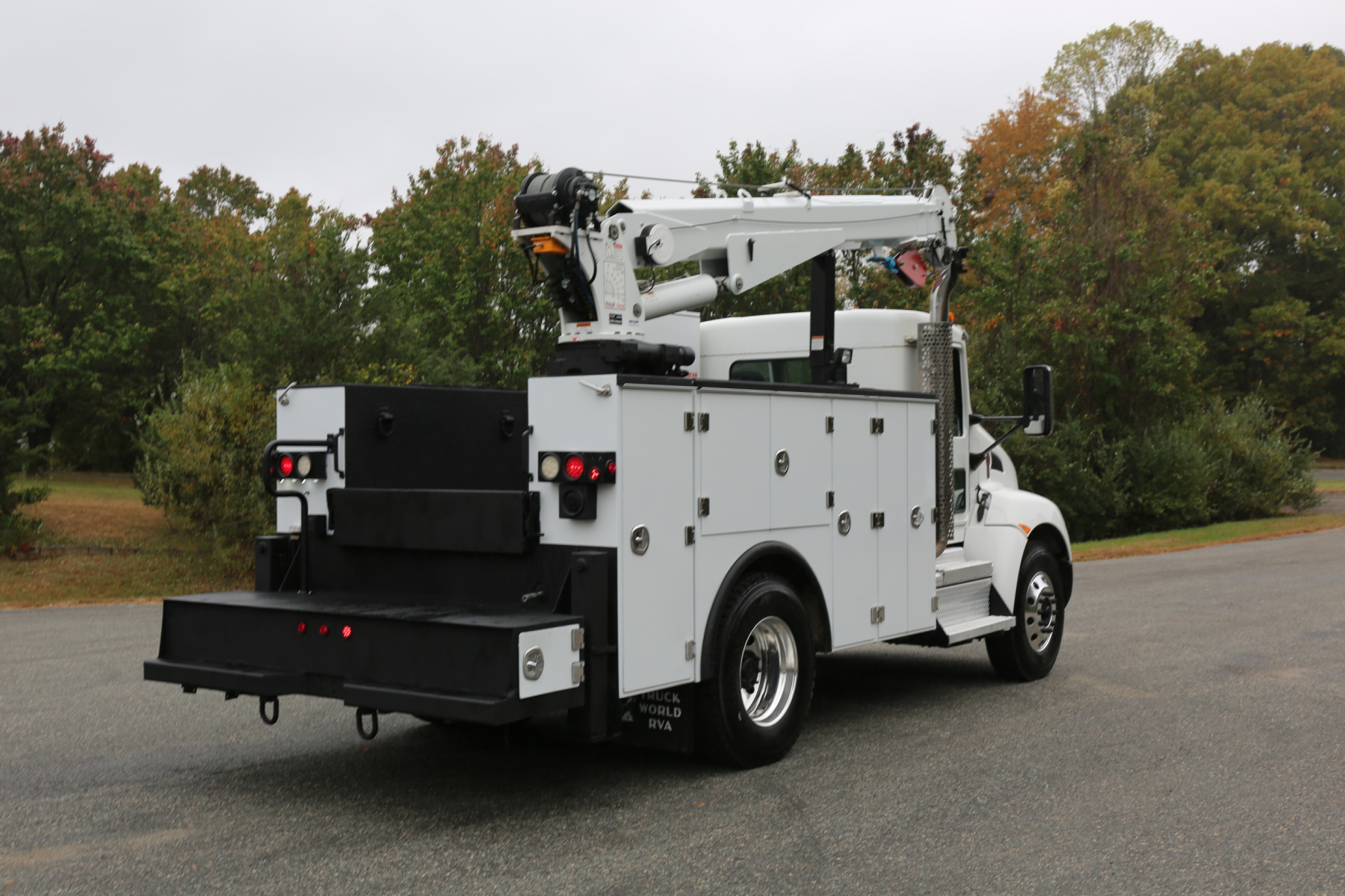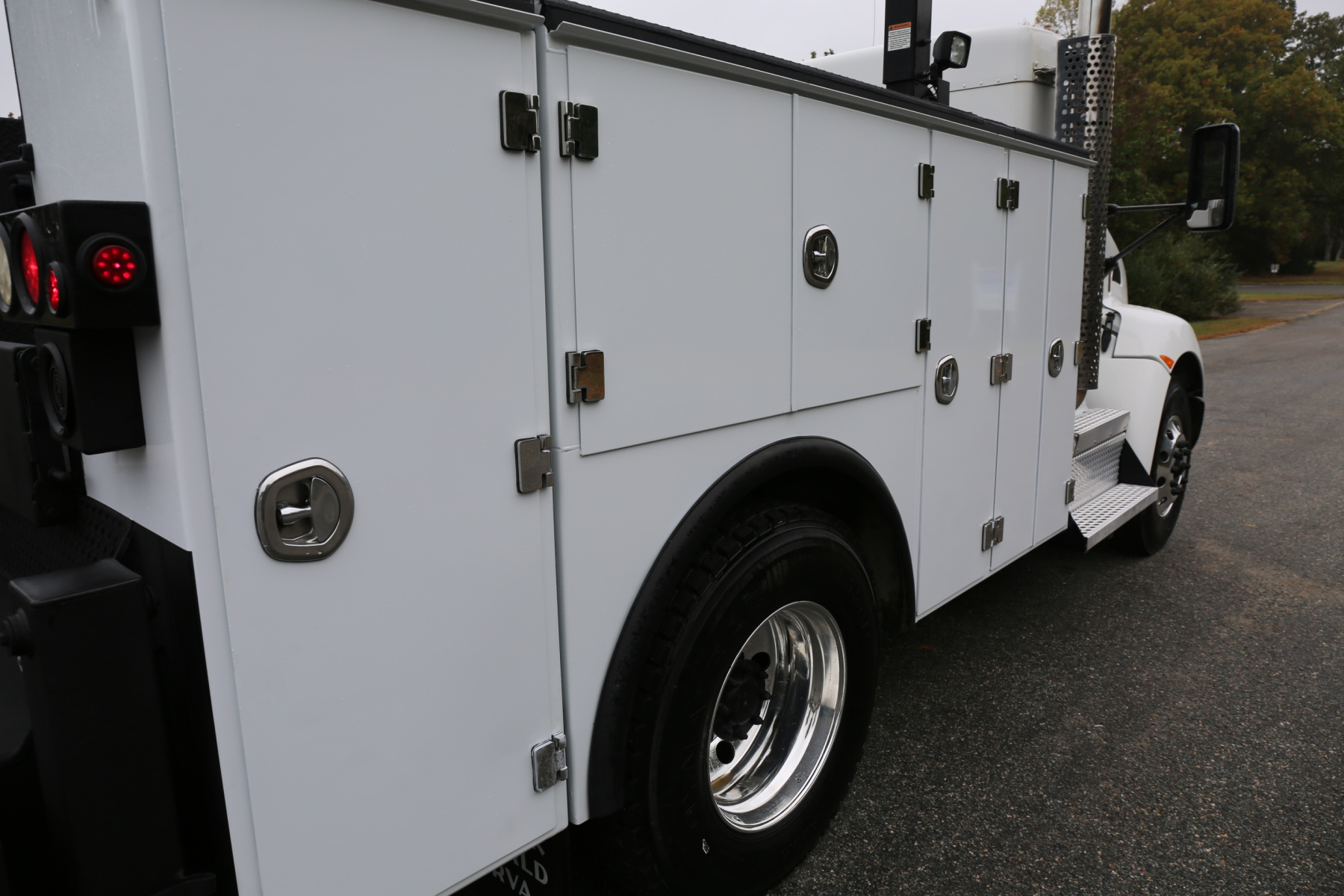 Large work bench rear bumper with pass through bin storage underneath. Hydraulic outriggers, and master twist locks for both bedsides.