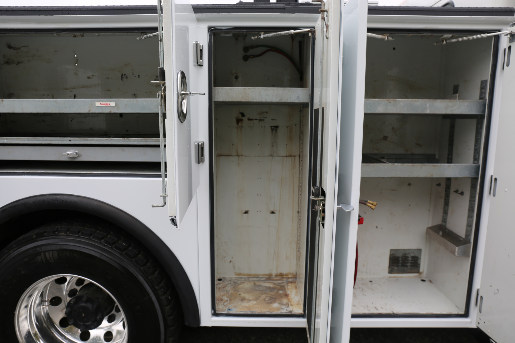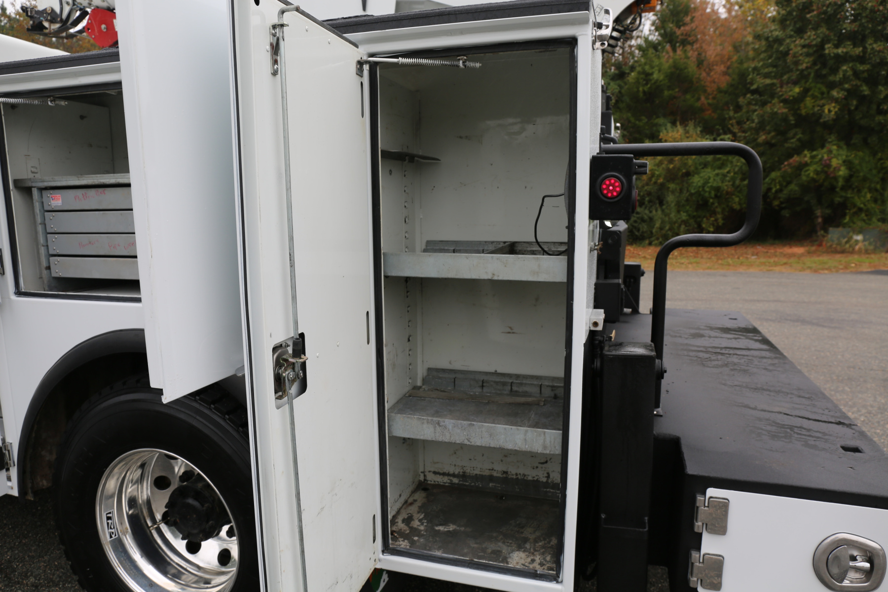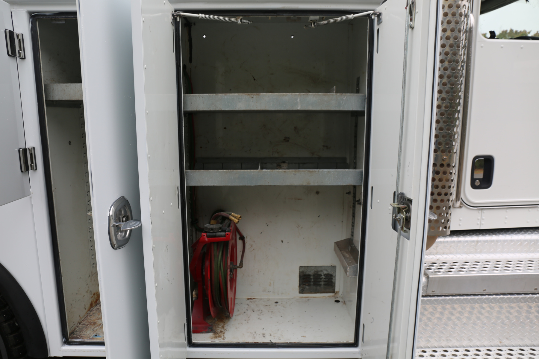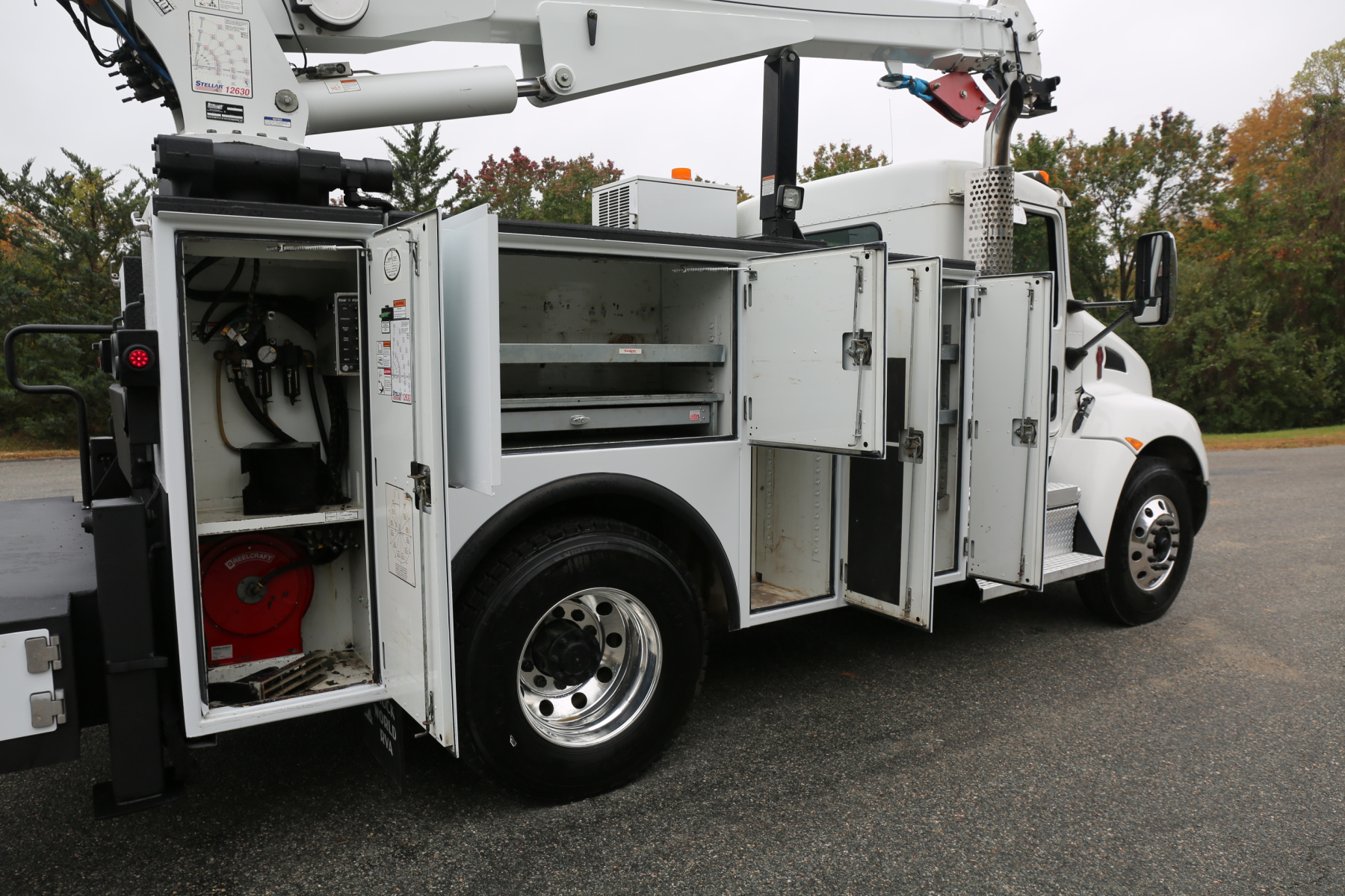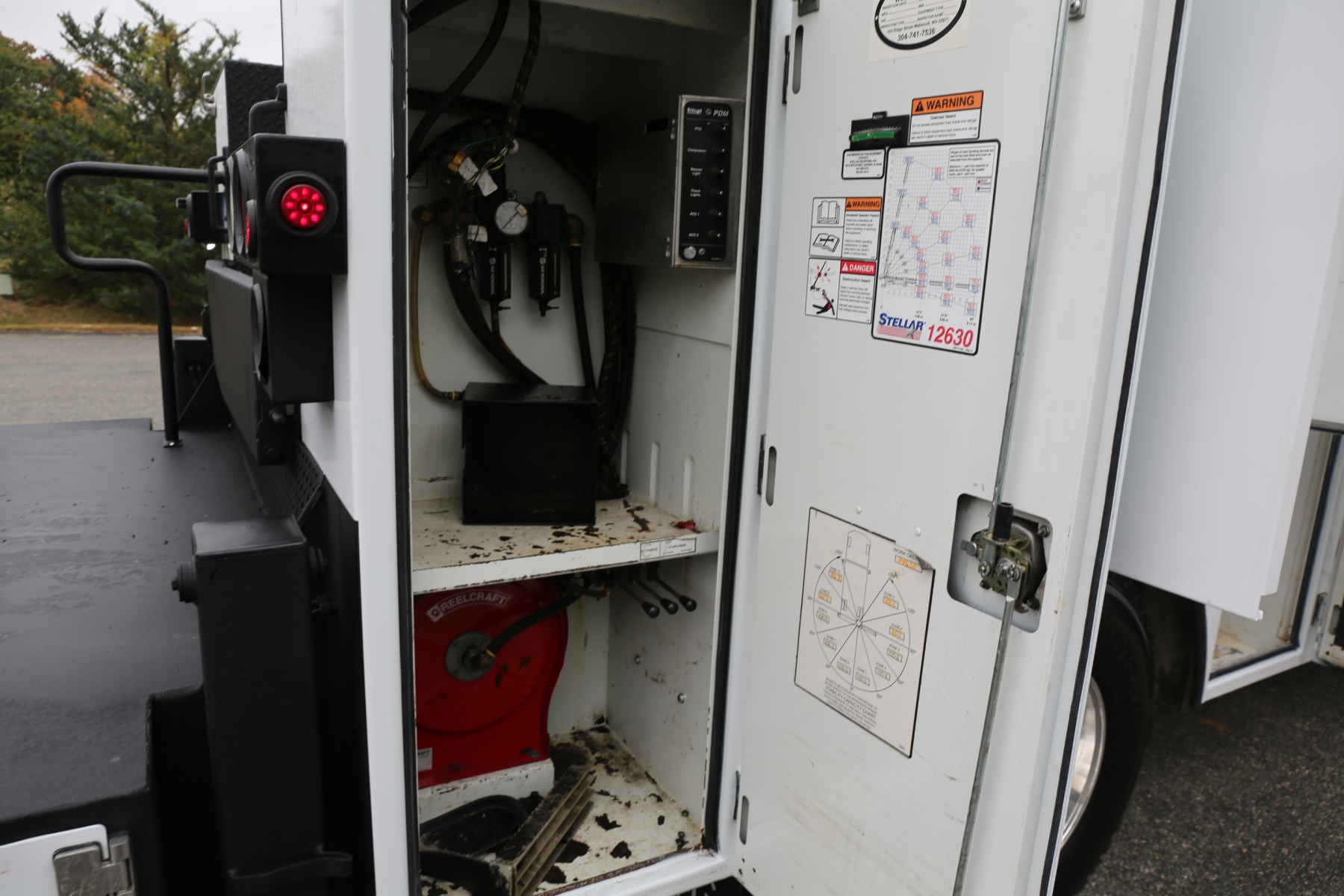 The crane compartment houses a body control panel, outriggers controls, has one shelf, and a Reelcraft air hose reel. One drawer and one shelf over the passenger wheel well compartment. One shelf in the P2 compartment. Two shelves in the P1 compartment.