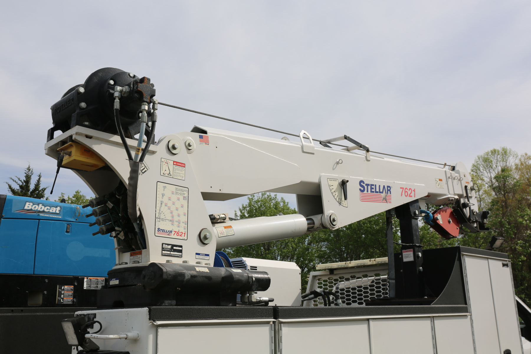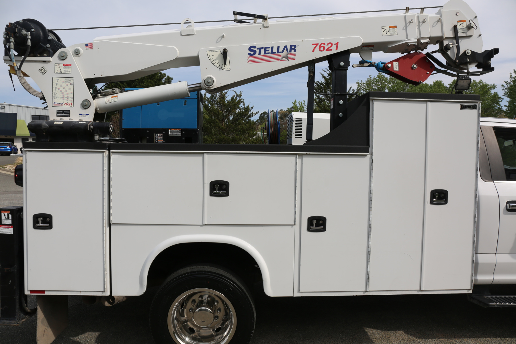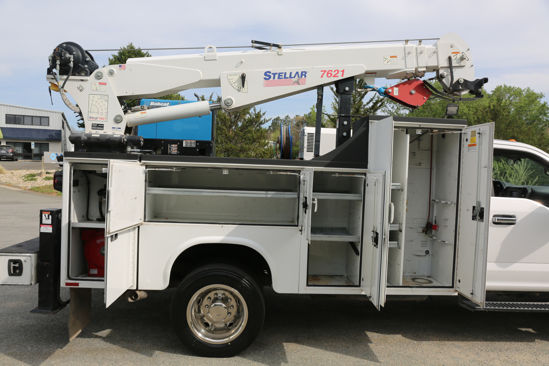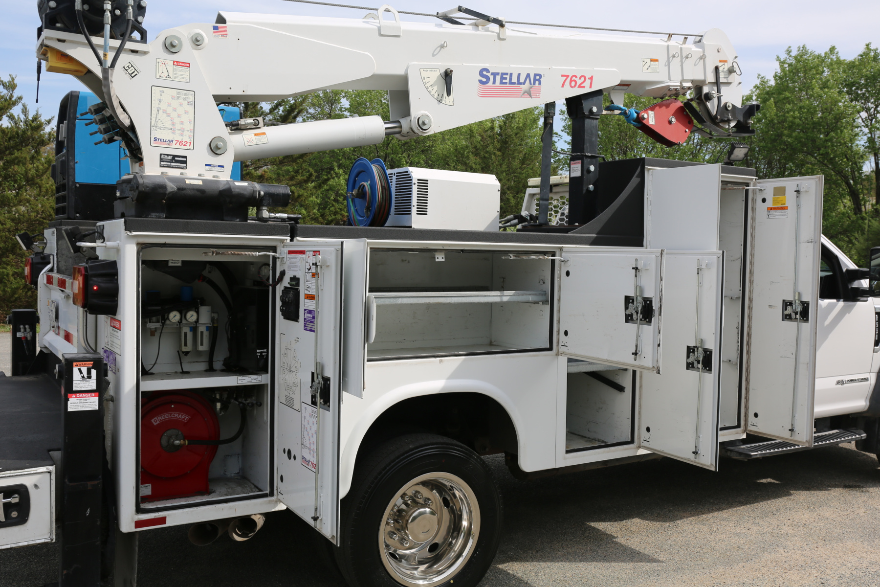 The crane is a Stellar 7621 with 7500# maximum lifting capacity and a two stage hydraulic extension out to 21′ of reach. Run off a factory wireless remote. The remote turns the compressor on and off as well.