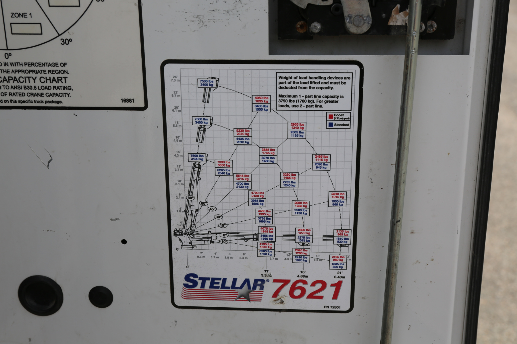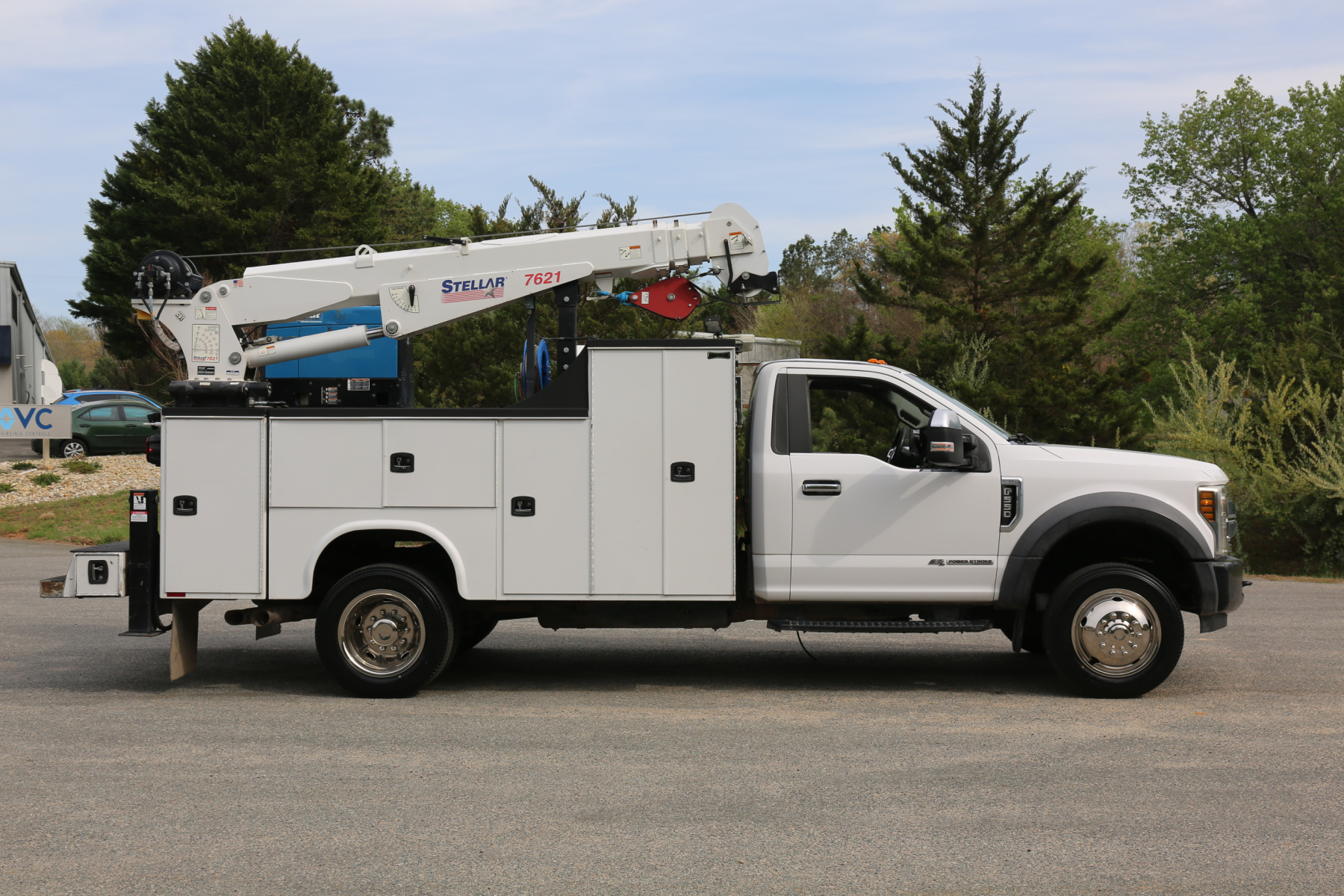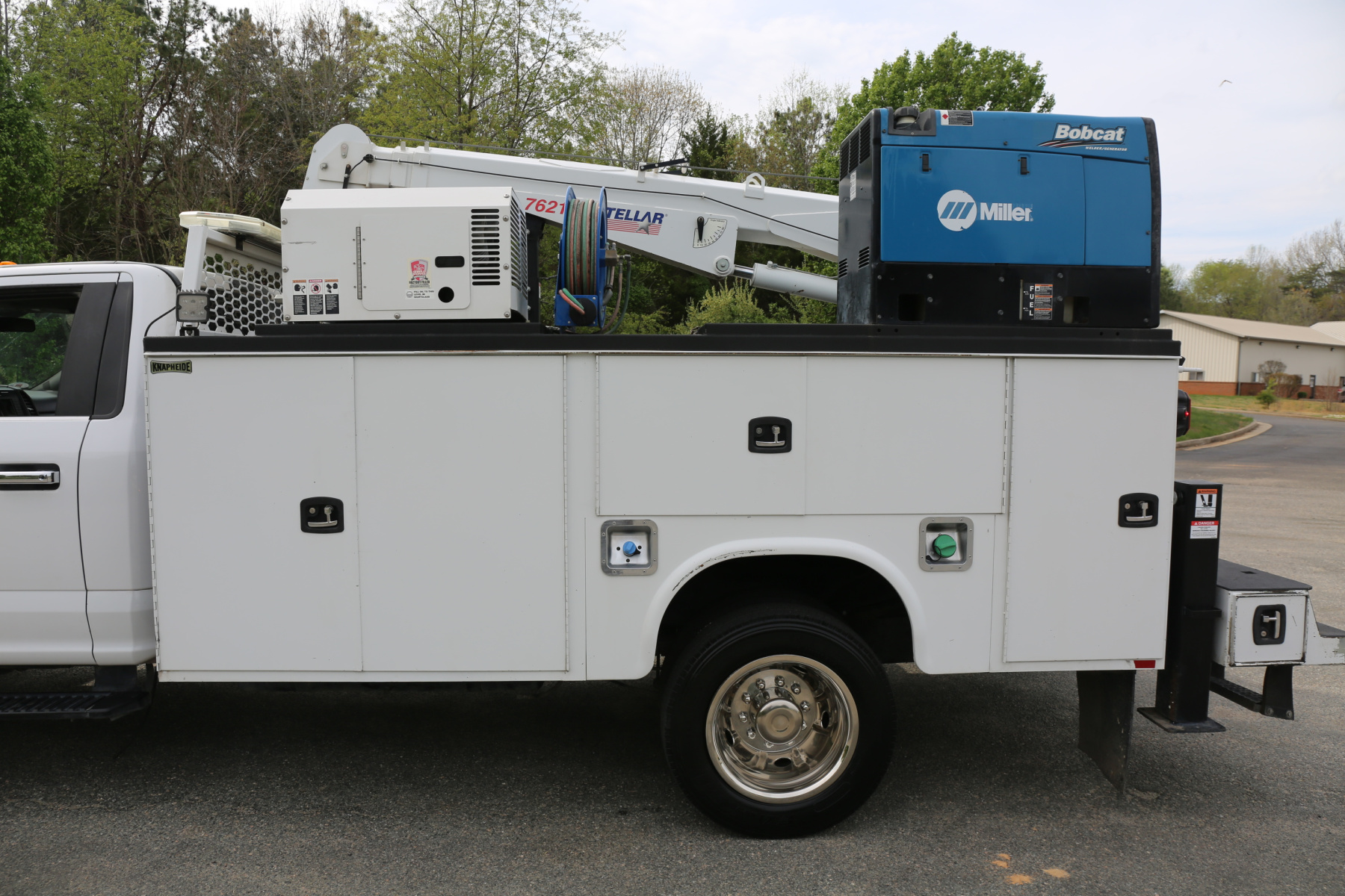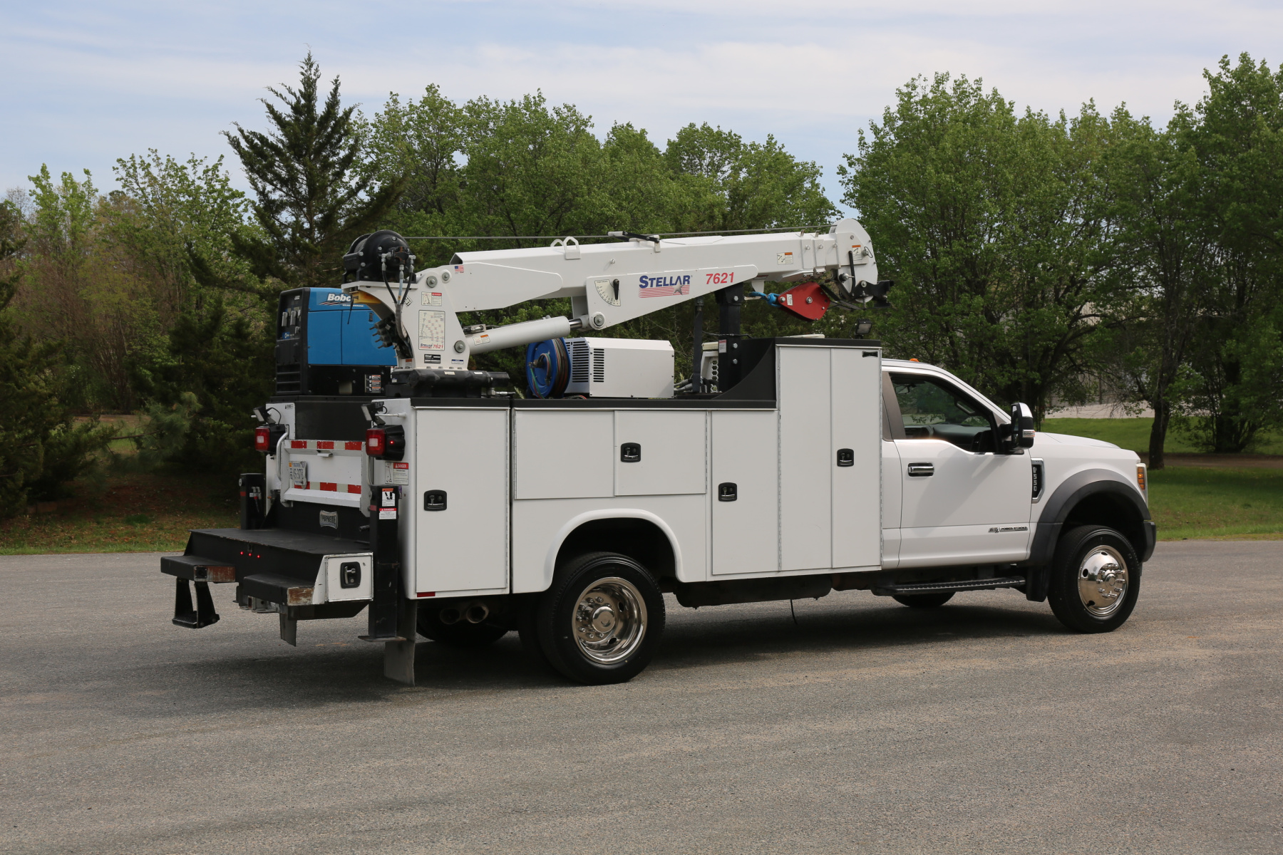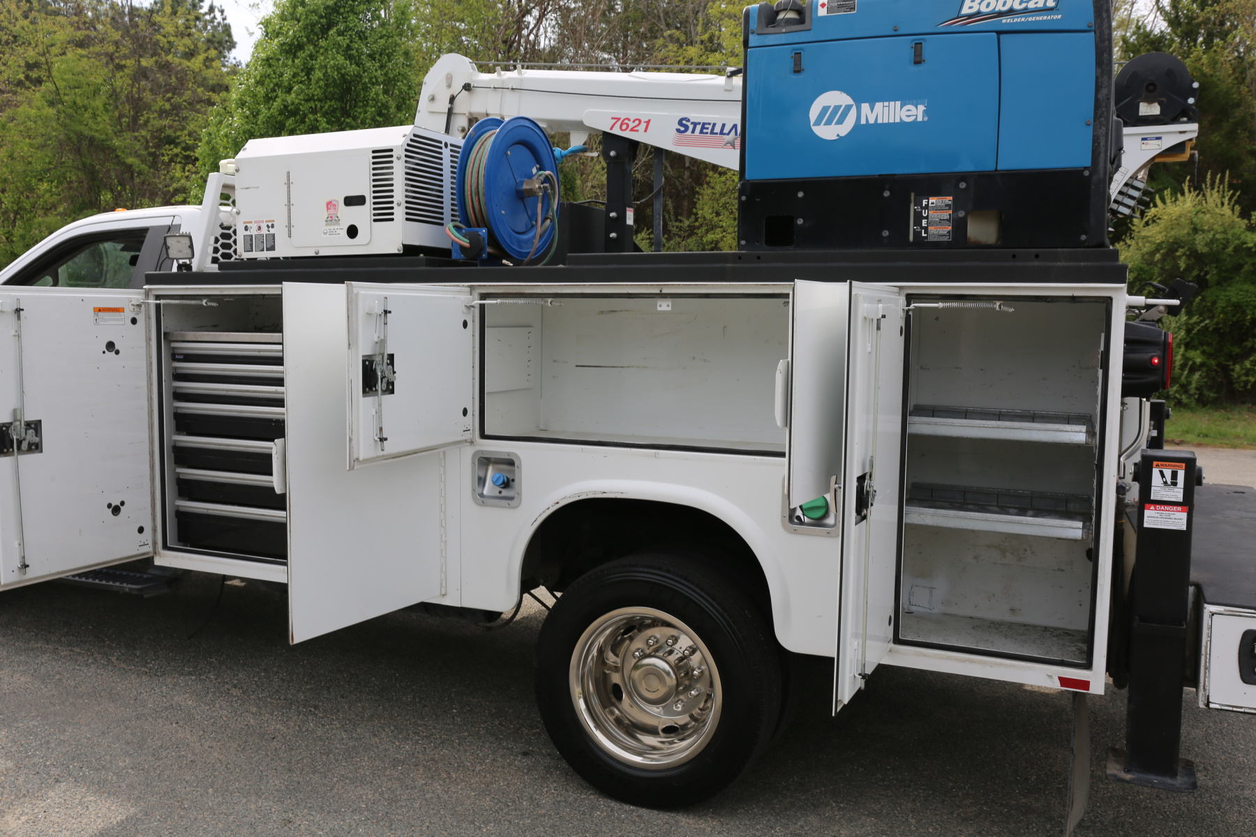 The crane is a Stellar 7621 with 7500# maximum lifting capacity and a two stage hydraulic extension out to 21′ of reach. Run off a factory wireless remote. The remote turns the compressor on and off as well.