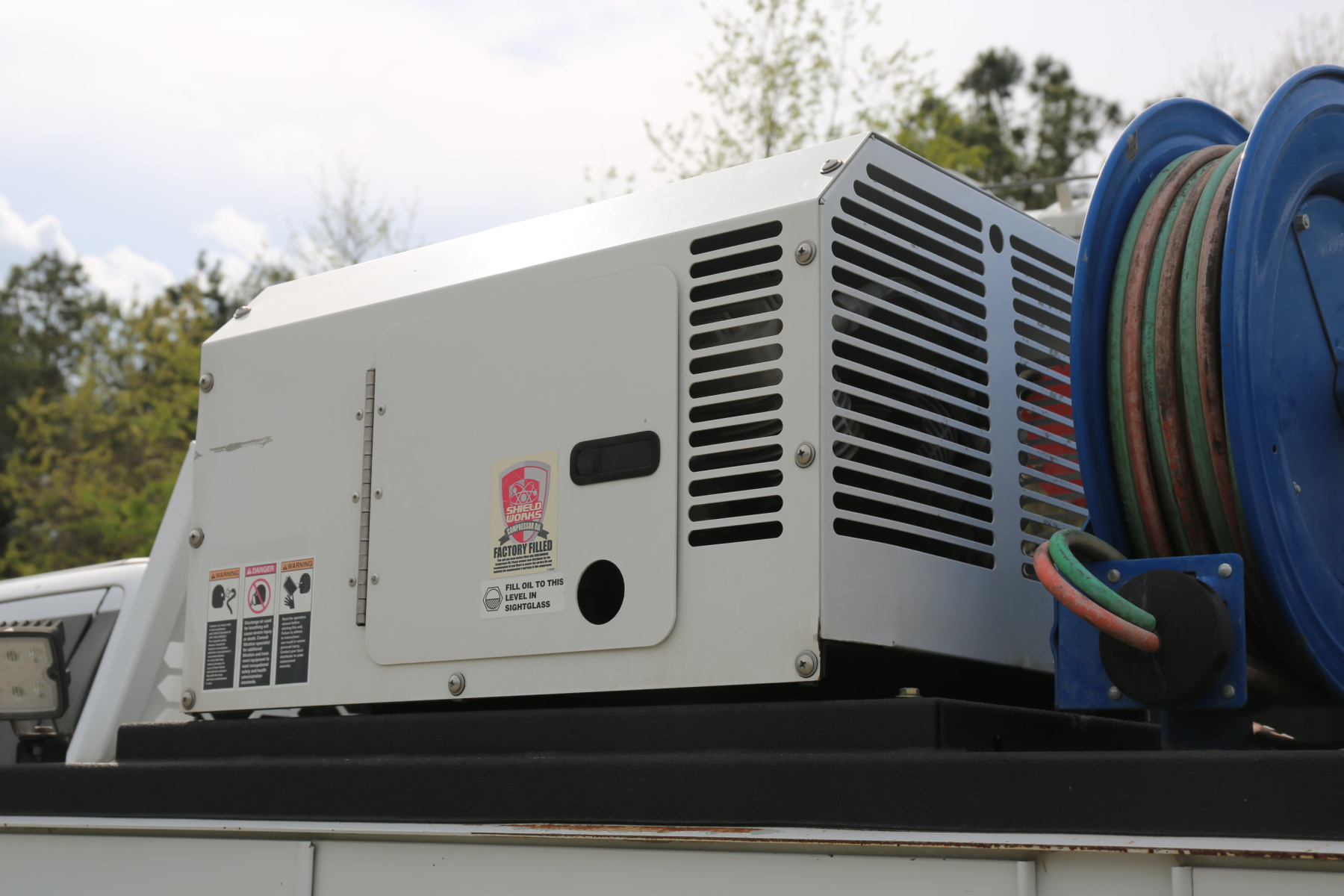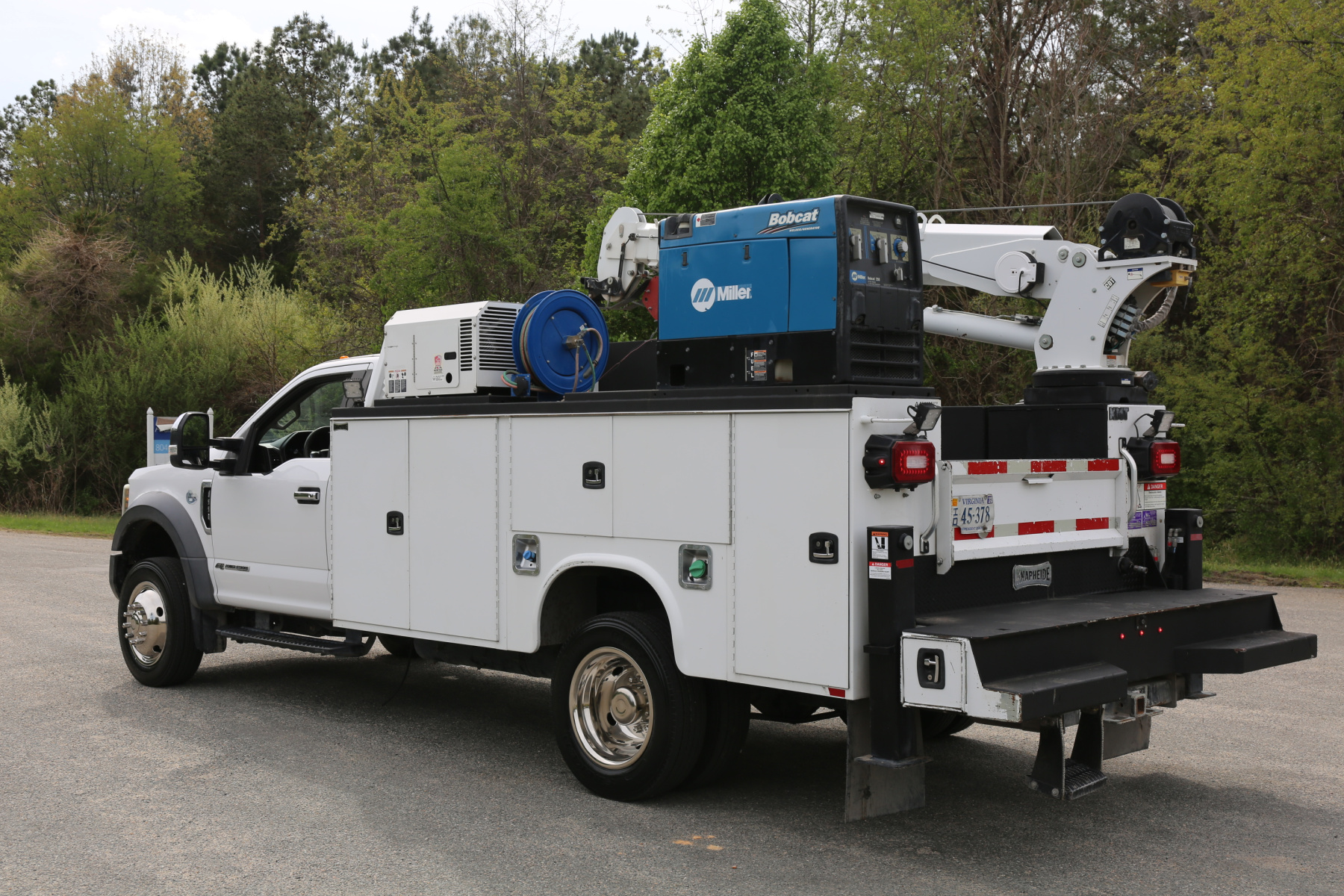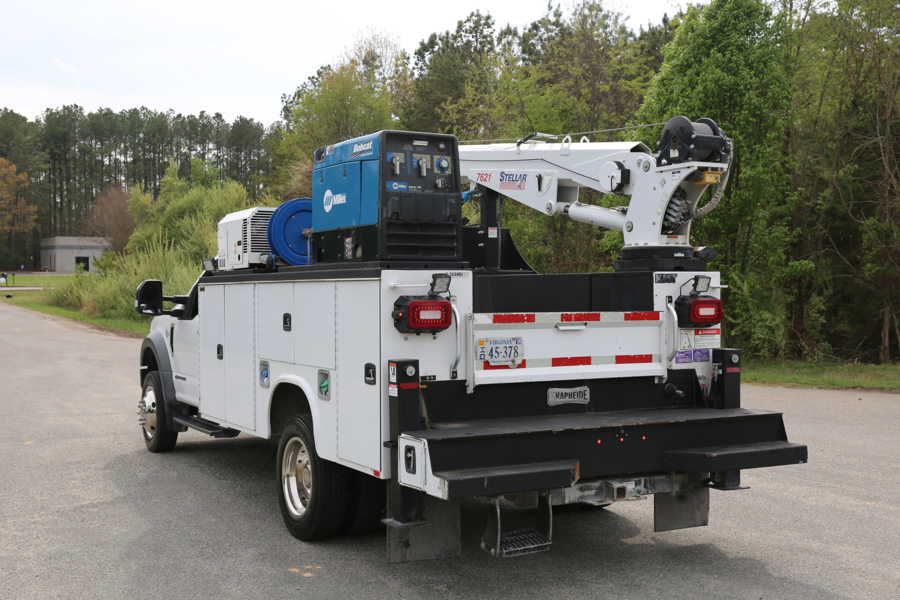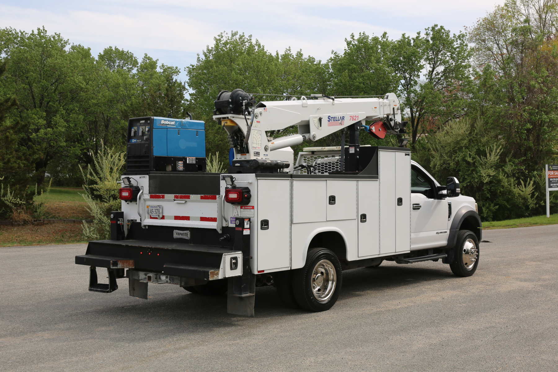 The crane is a Stellar 7621 with 7500# maximum lifting capacity and a two stage hydraulic extension out to 21′ of reach. Run off a factory wireless remote. The remote turns the compressor on and off as well.