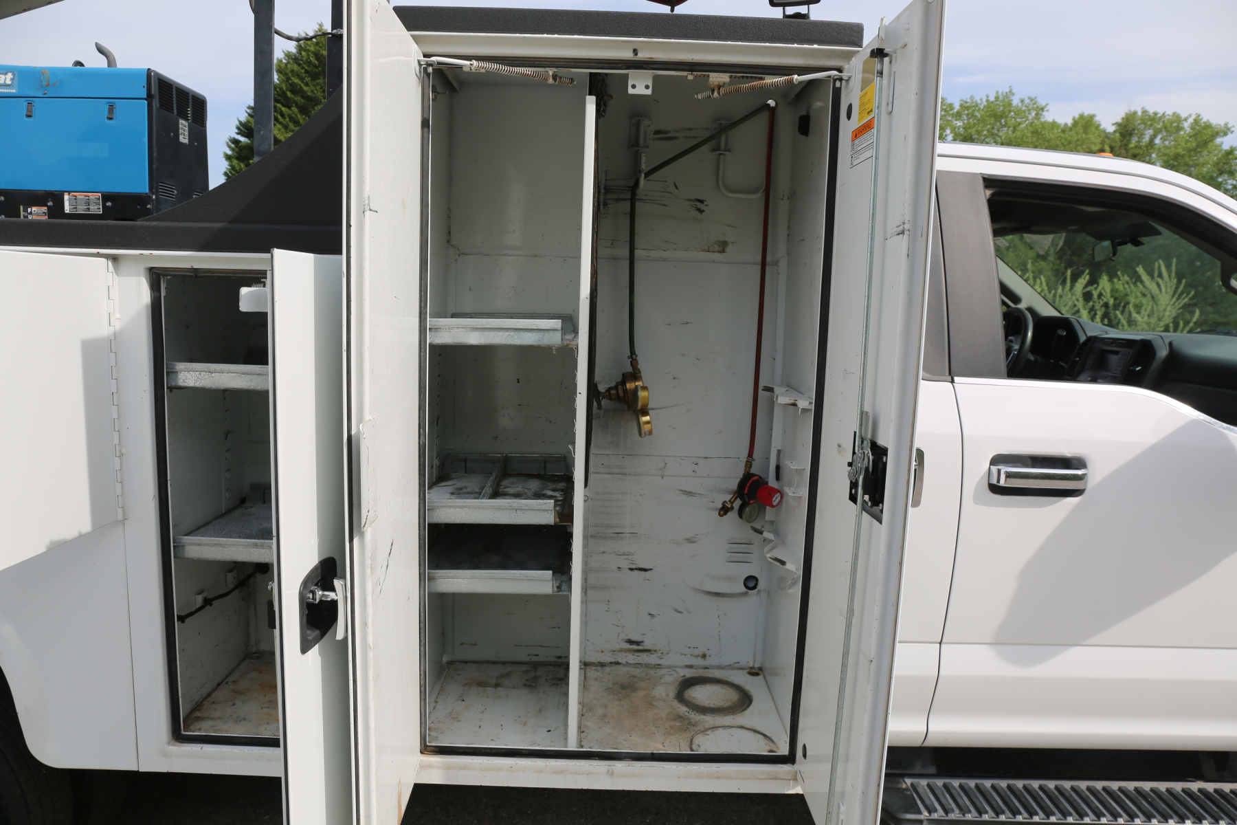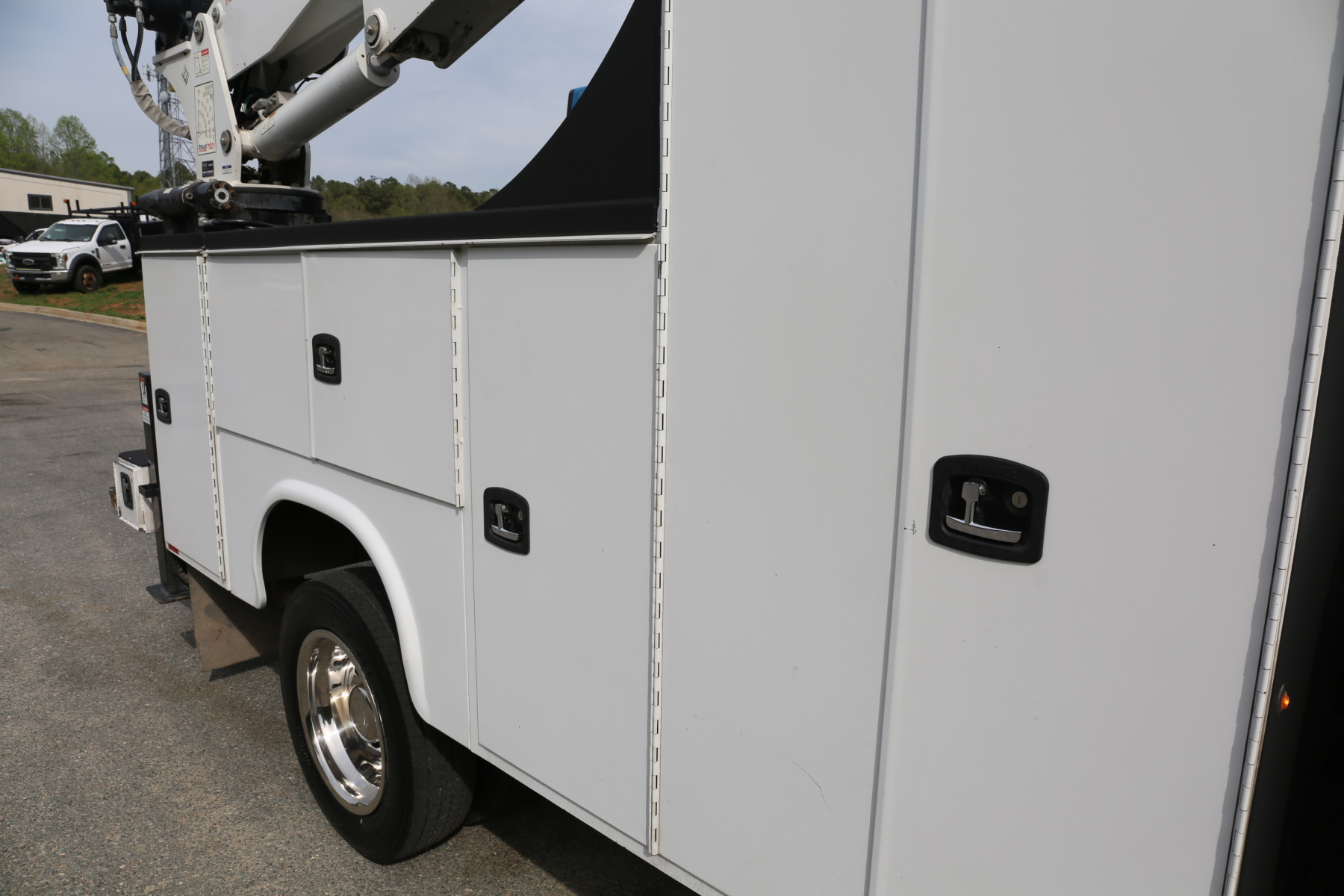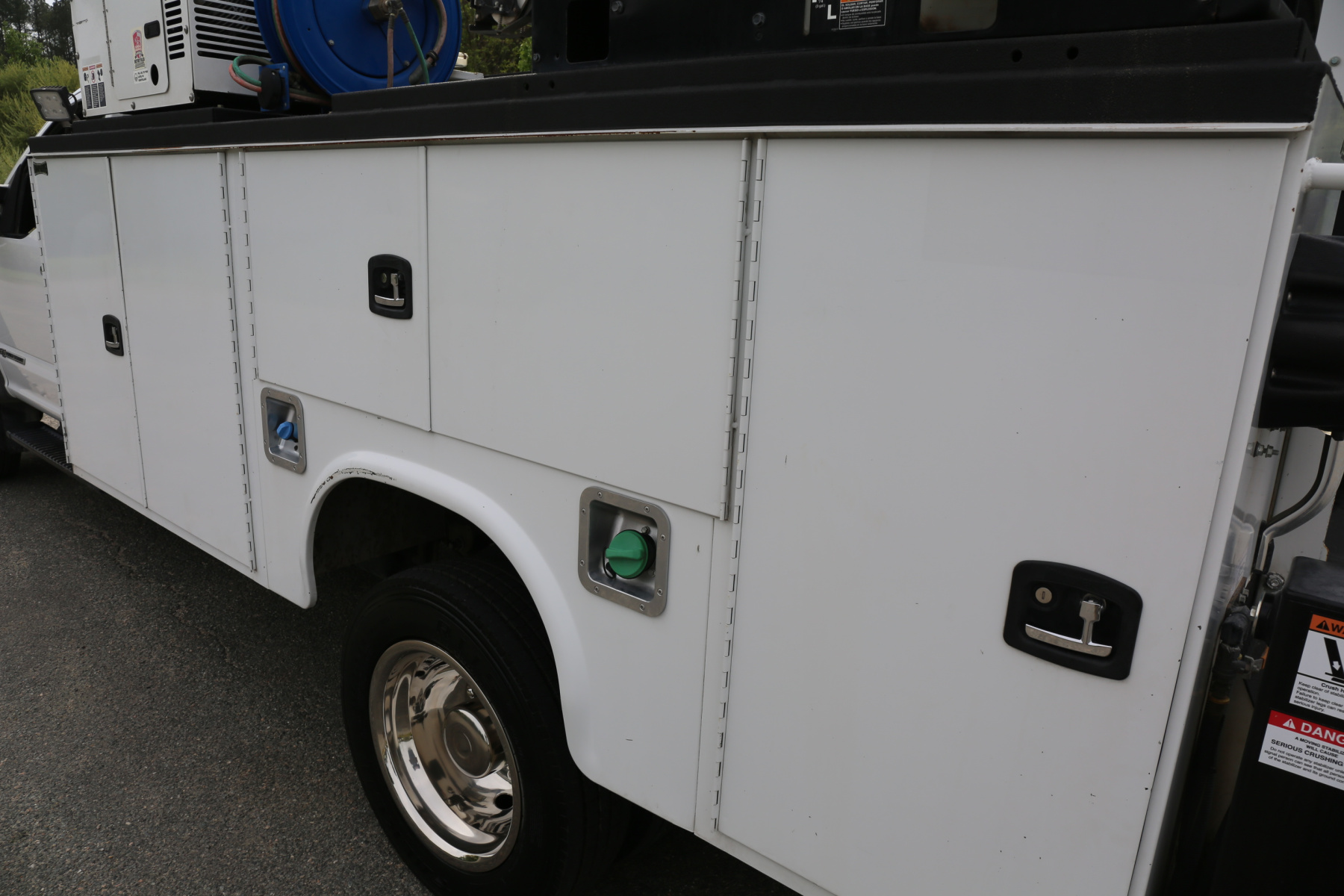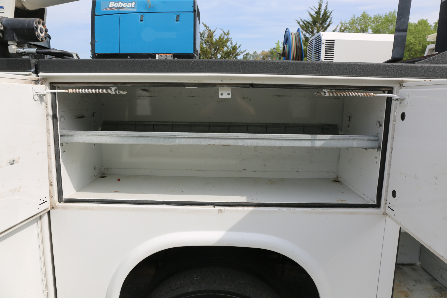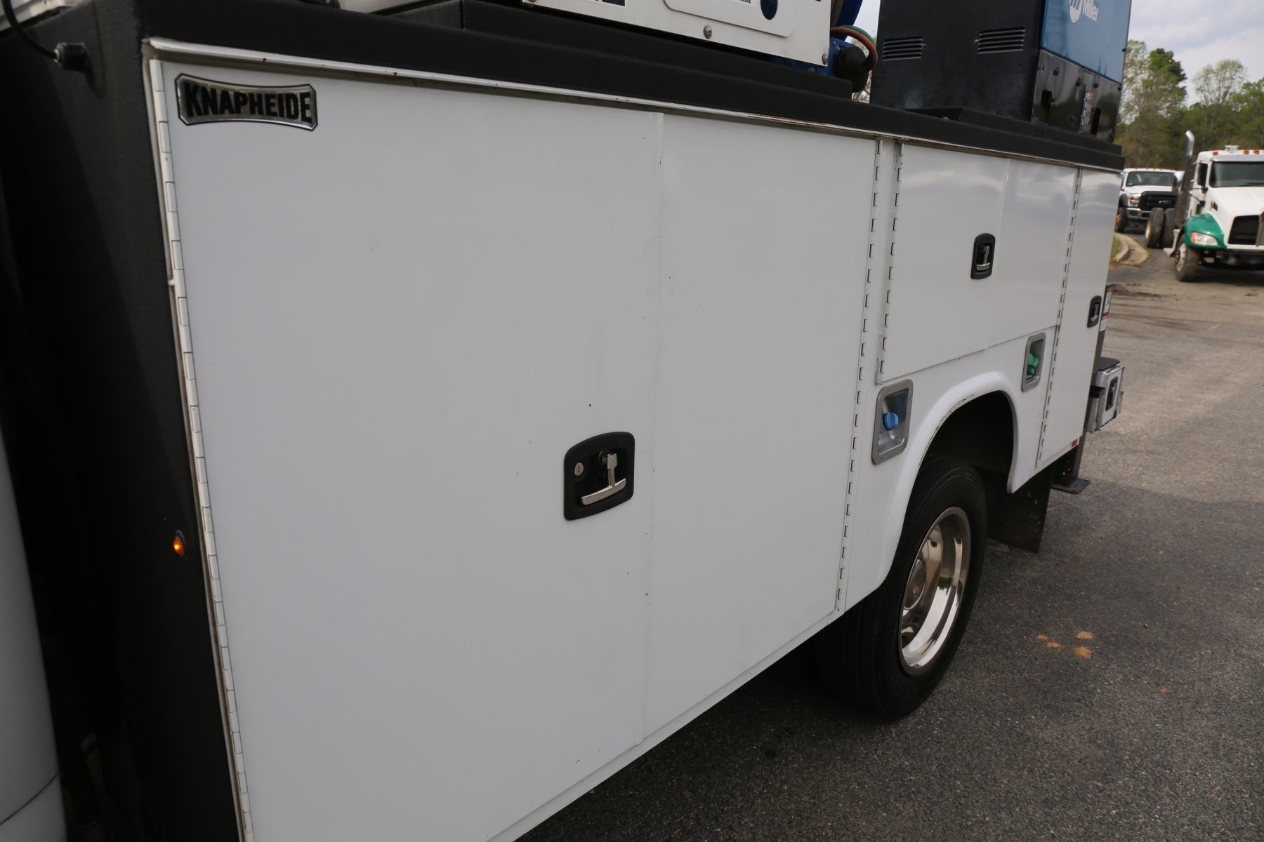 The bed is an 11′ Knapheide mechanics body. Minor rock chipping all around, no major damage or dents. All of the doors close, latch, and lock as they should. All of the bin latches are keyed the same. No rust in the body.