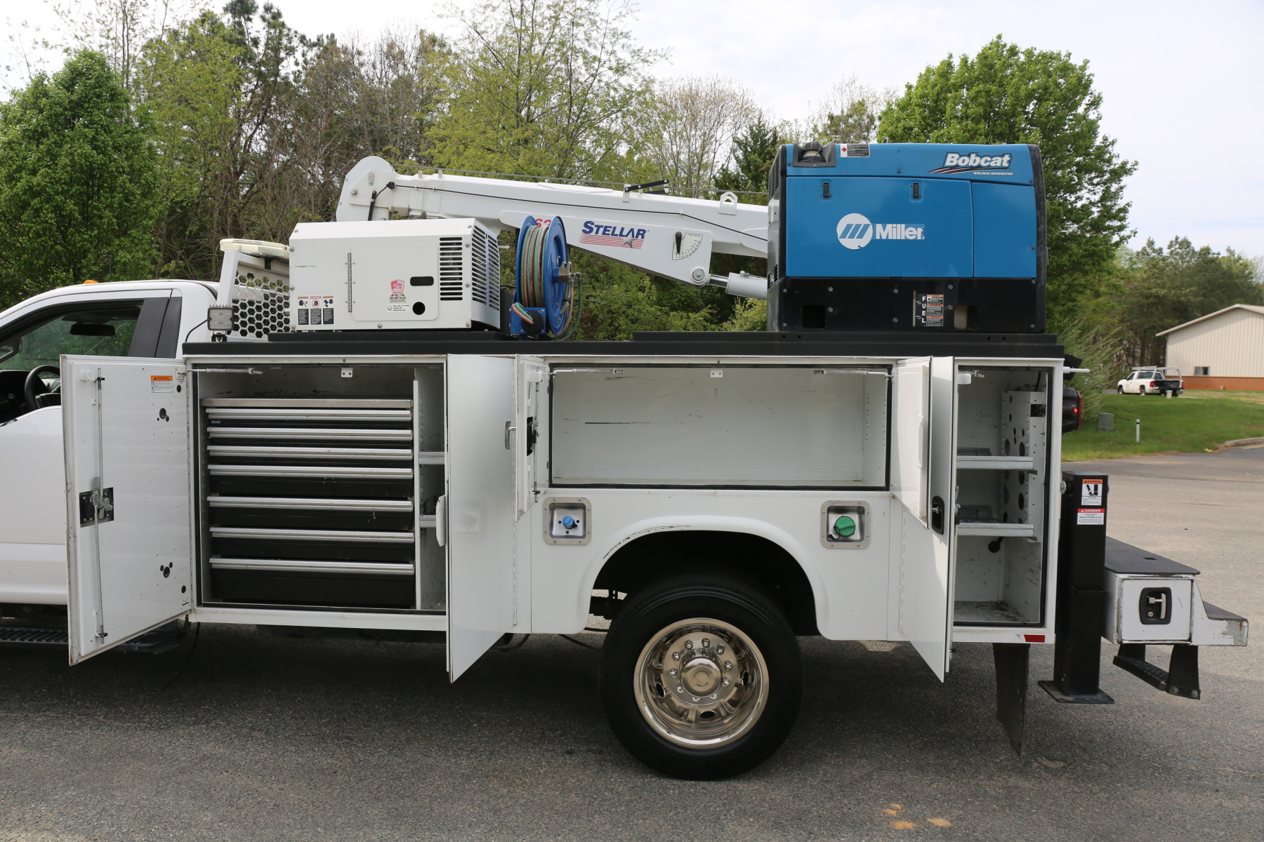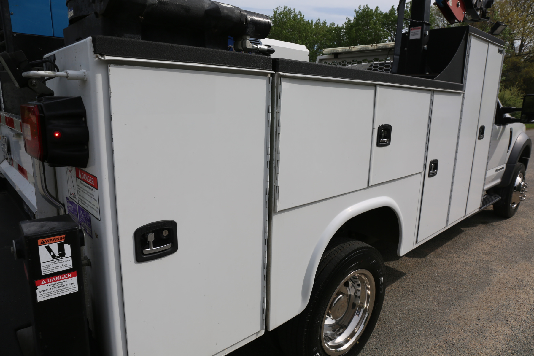 Work bench rear bumper with pass through bin storage underneath. Master slide locks for the bed. Hydraulic outriggers, and a tow hitch receiver.