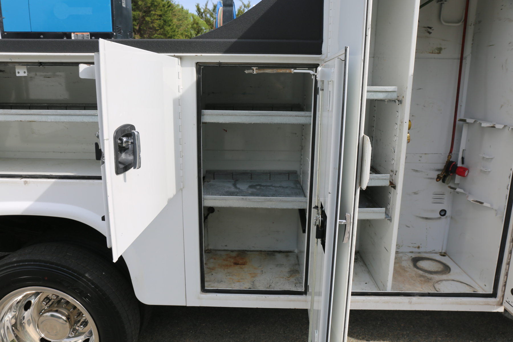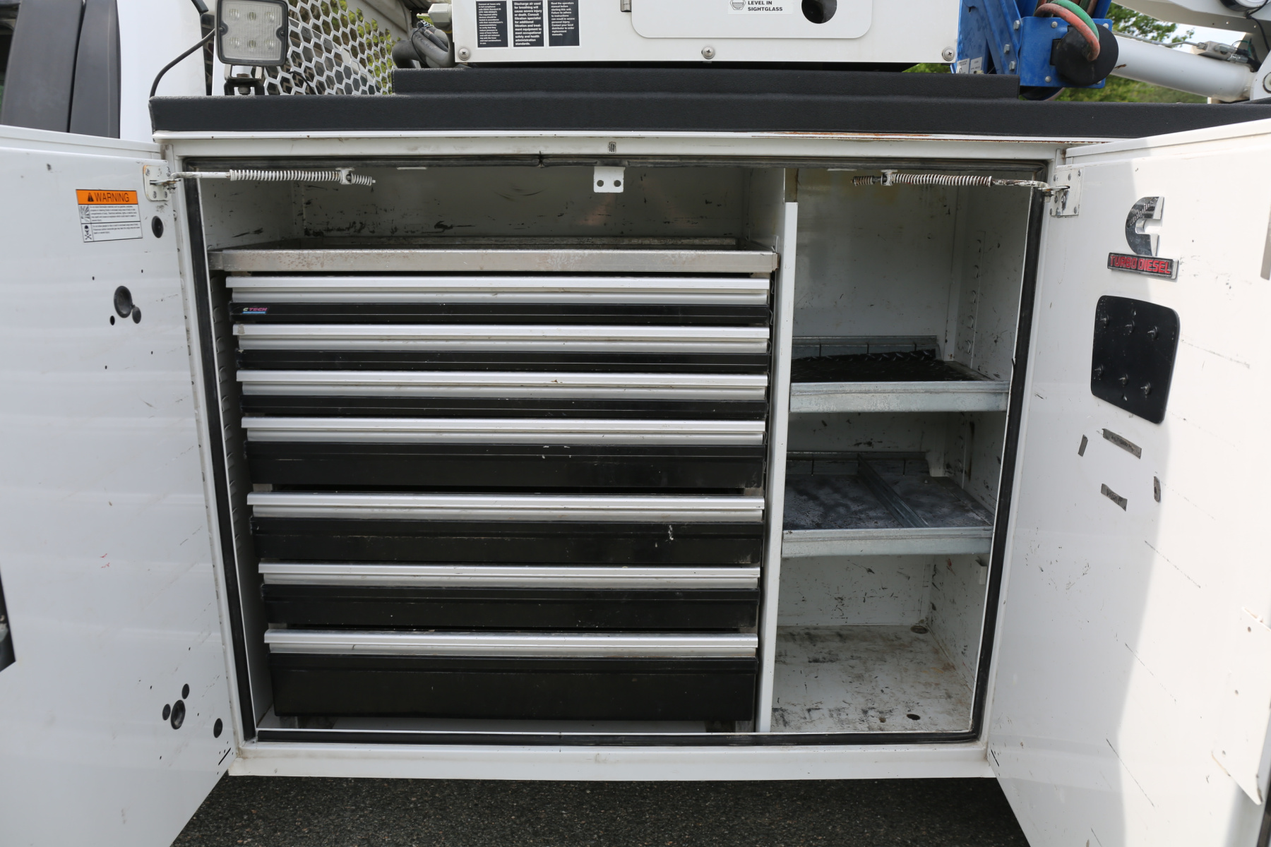 The D1 compartment has a full set of CTech drawers, seven total. Two shelves in the D2 compartment. The Driver wheel well compartment is open with no shelving. Two more shelves in the driver rear compartment.