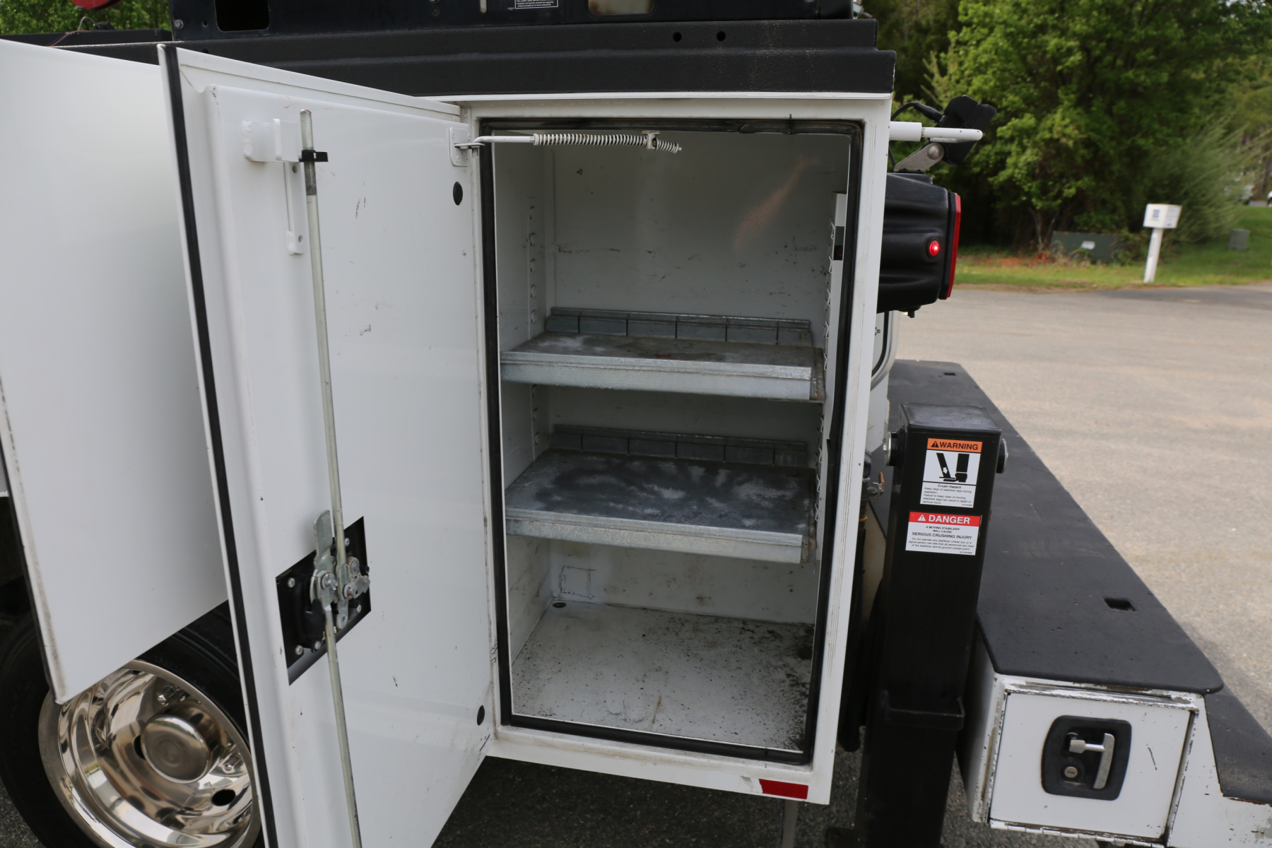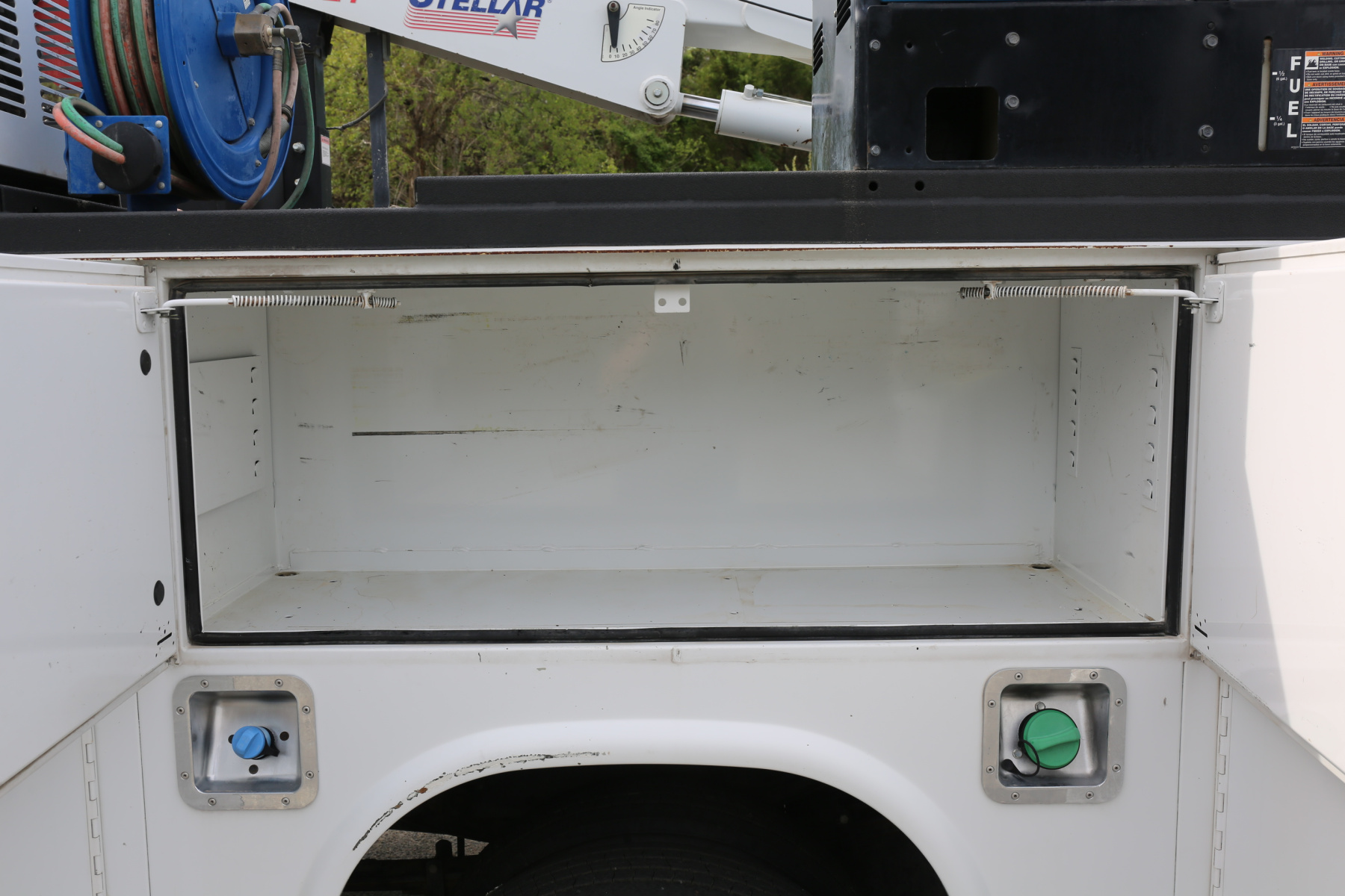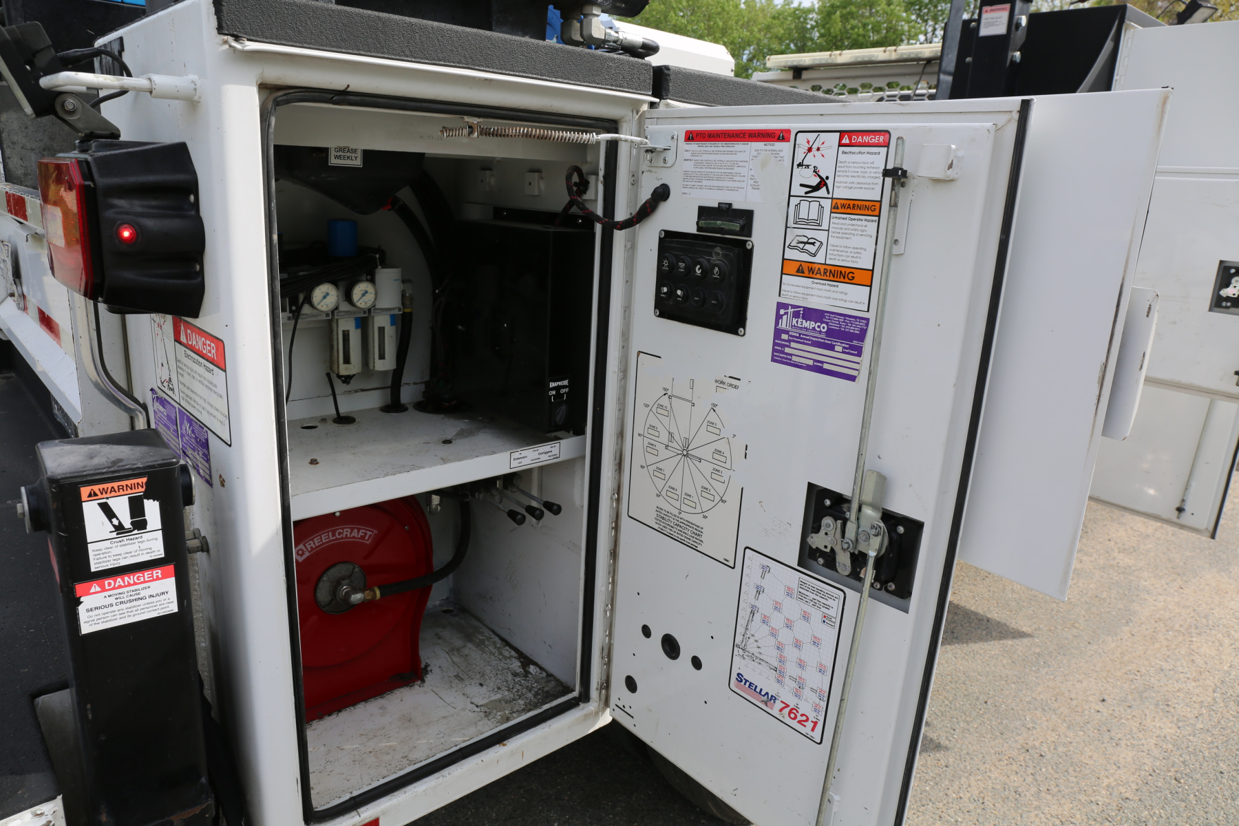 The crane compartment houses a ReelCraft hose reel, one shelf, and has the outrigger controls and body lighting control panel.