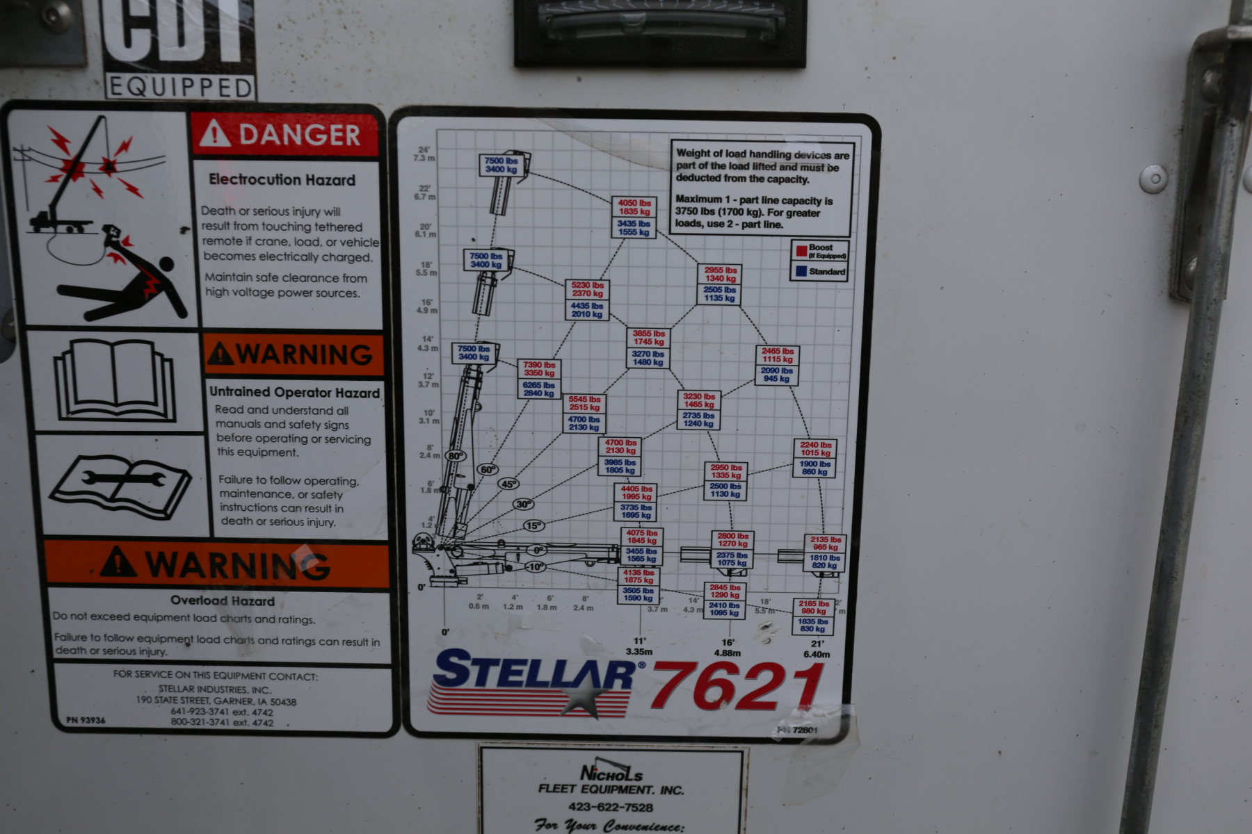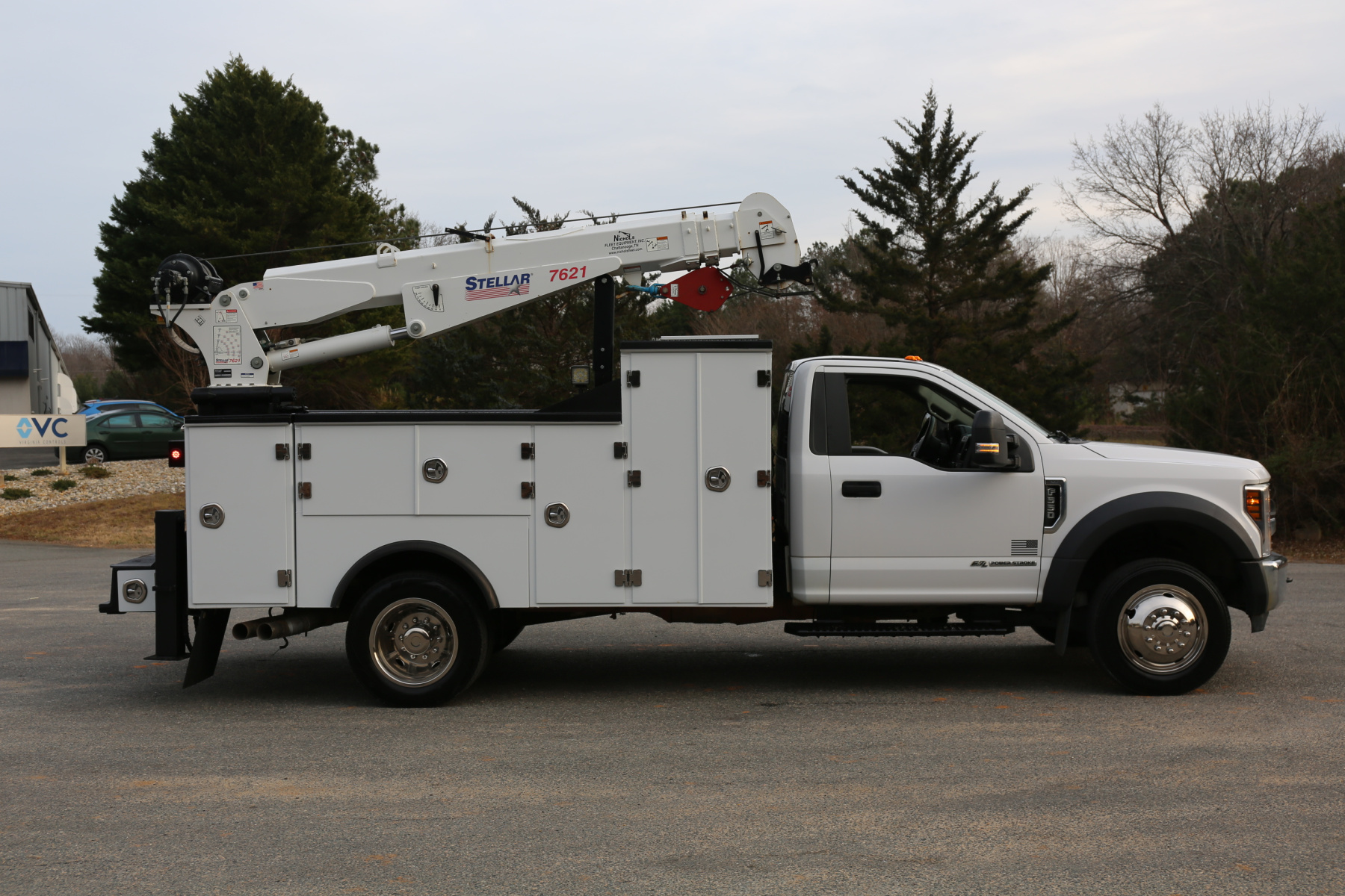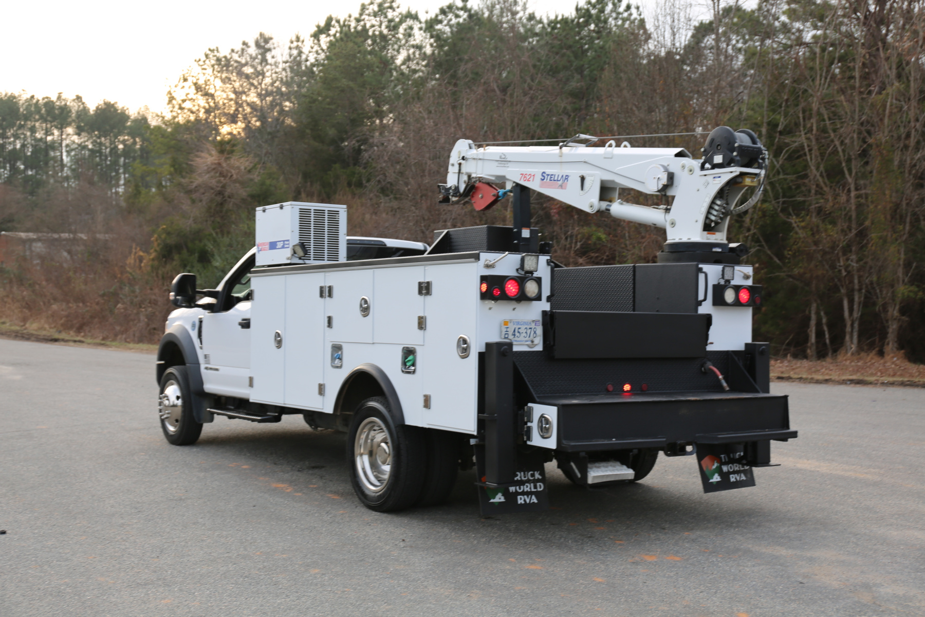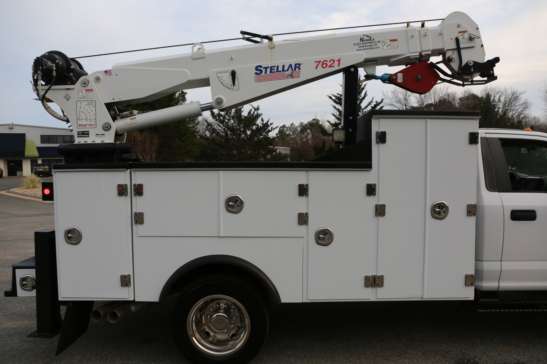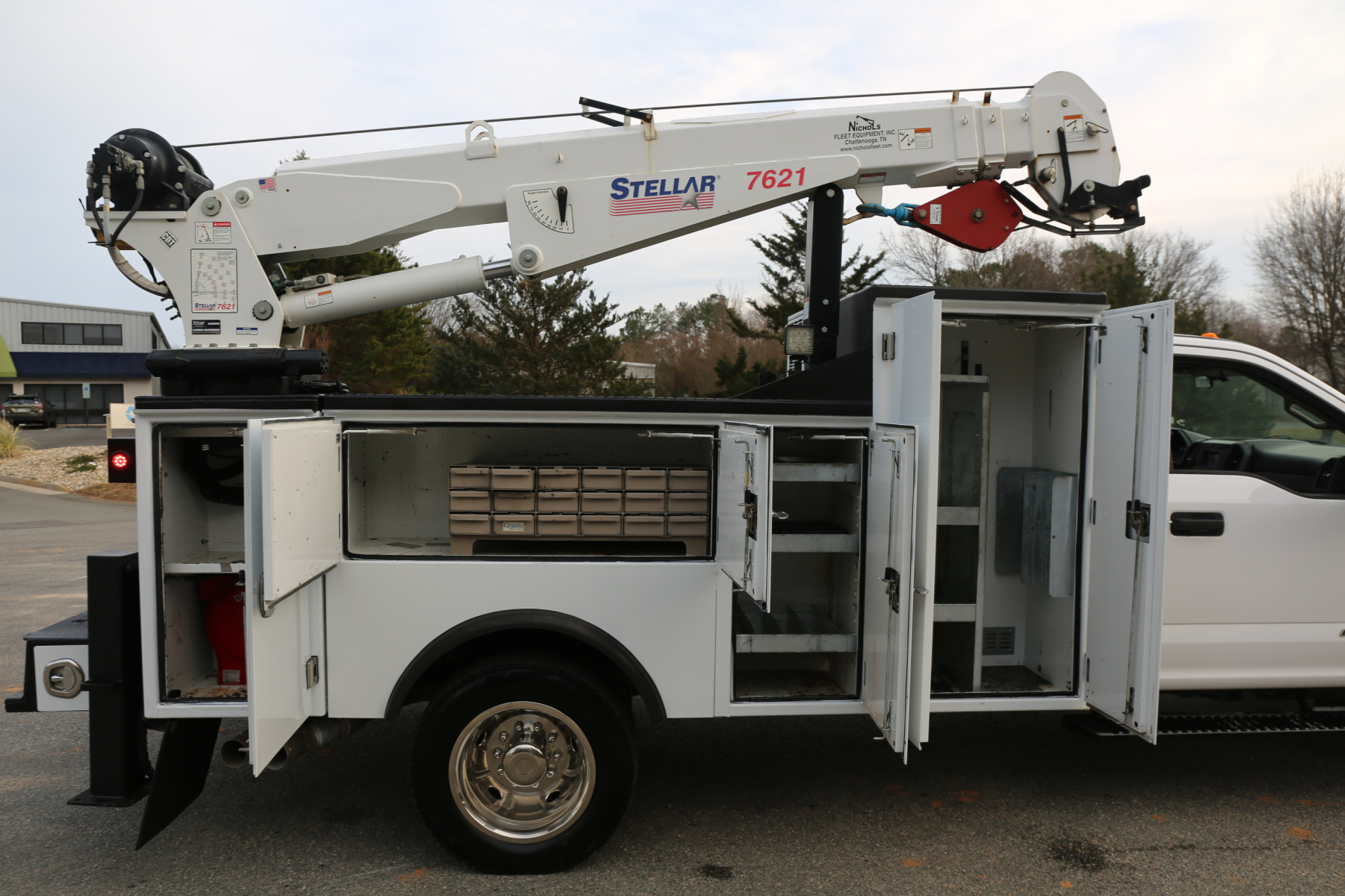 The crane is a Stellar 7621, run off a factory wireless remote. 7500# maximum lifting capacity, and a two stage hydraulic extension out to 21′ of total reach. Runs as it should, controlled from a factory wireless remote. The remote controls the compressor as well.
