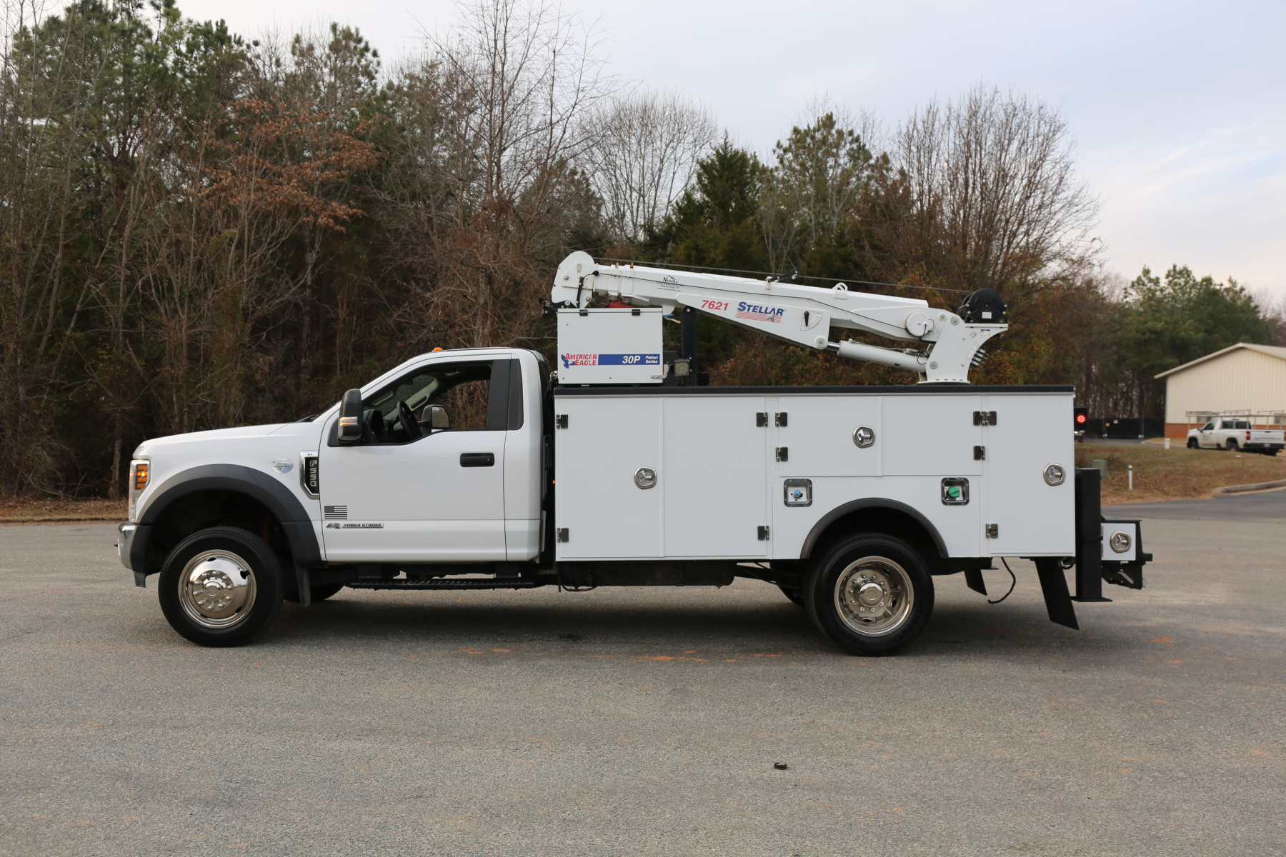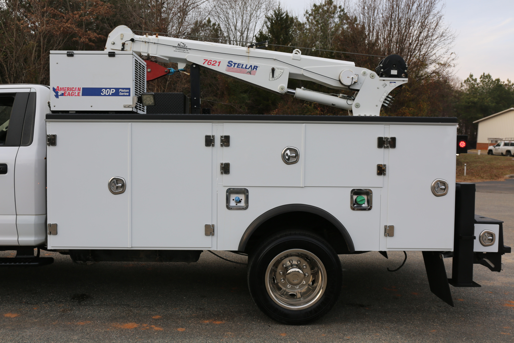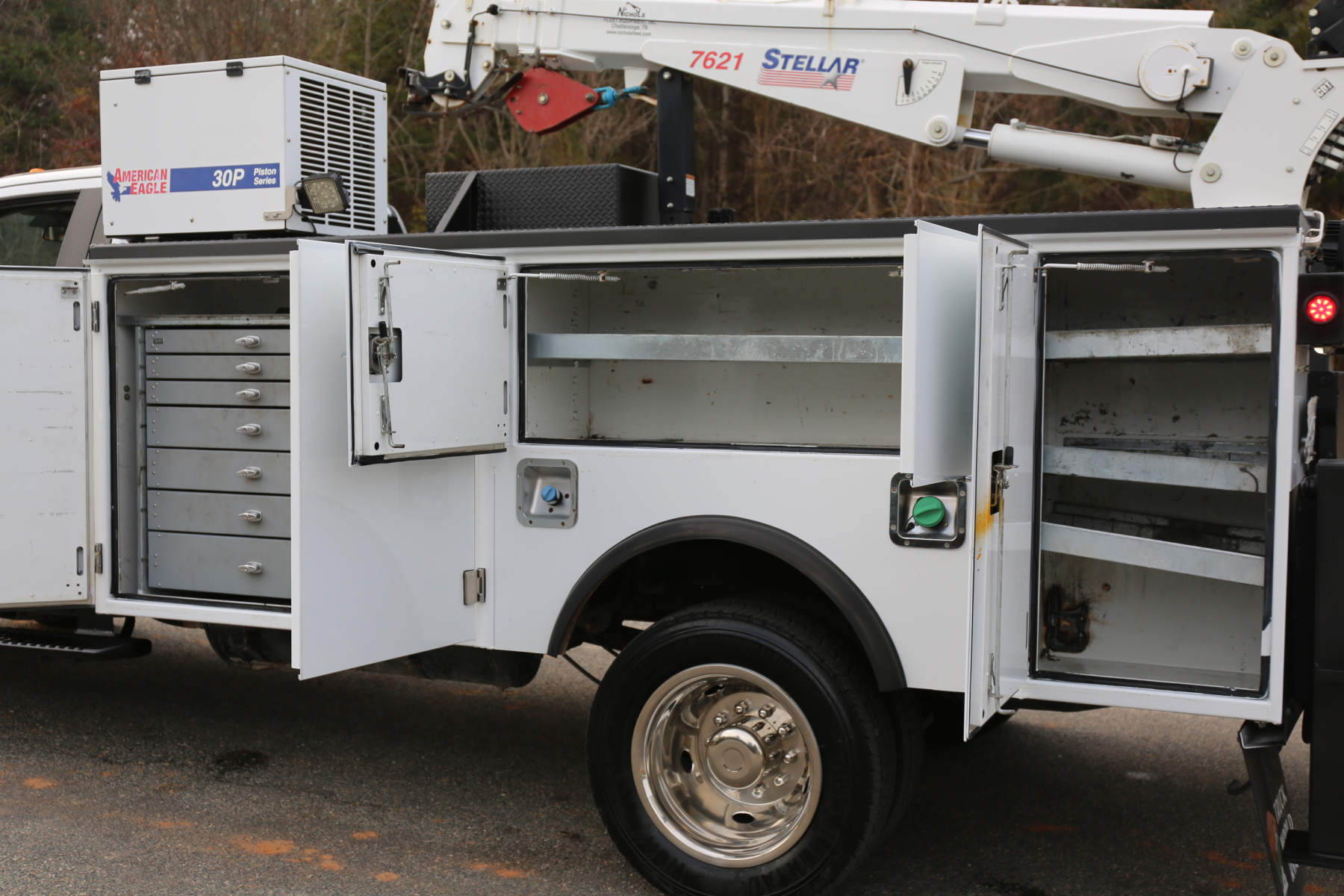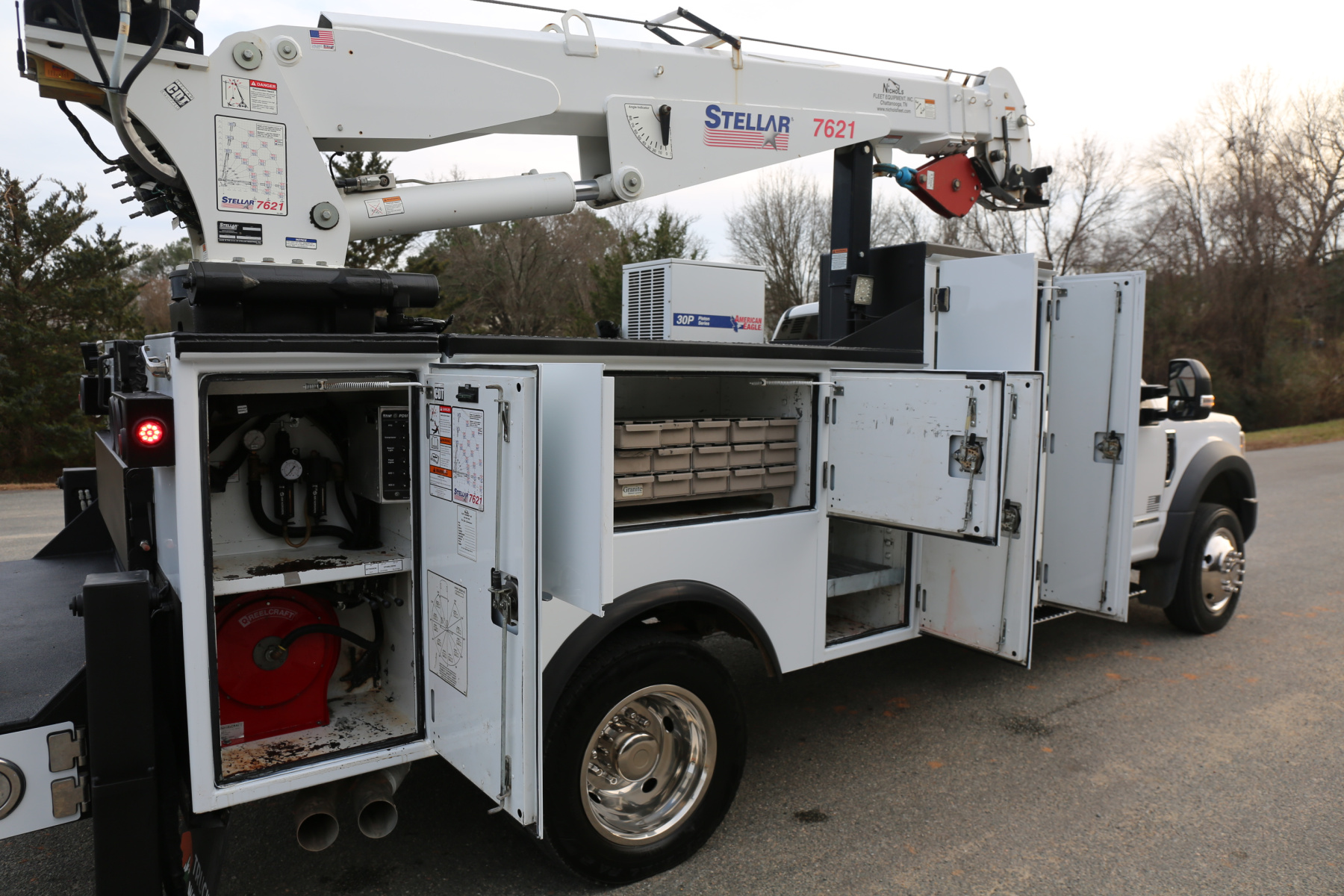 Equipped with an 11′ Stellar TMAX service body, a Stellar 7621 crane run off a factory wireless remote, an American Eagle 30P hydraulic compressor, hydraulic outriggers, one set of American Eagle drawers, and one set of bolt bins. All of the equipment works as it should.