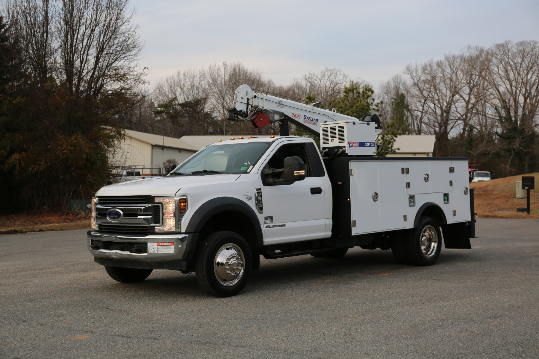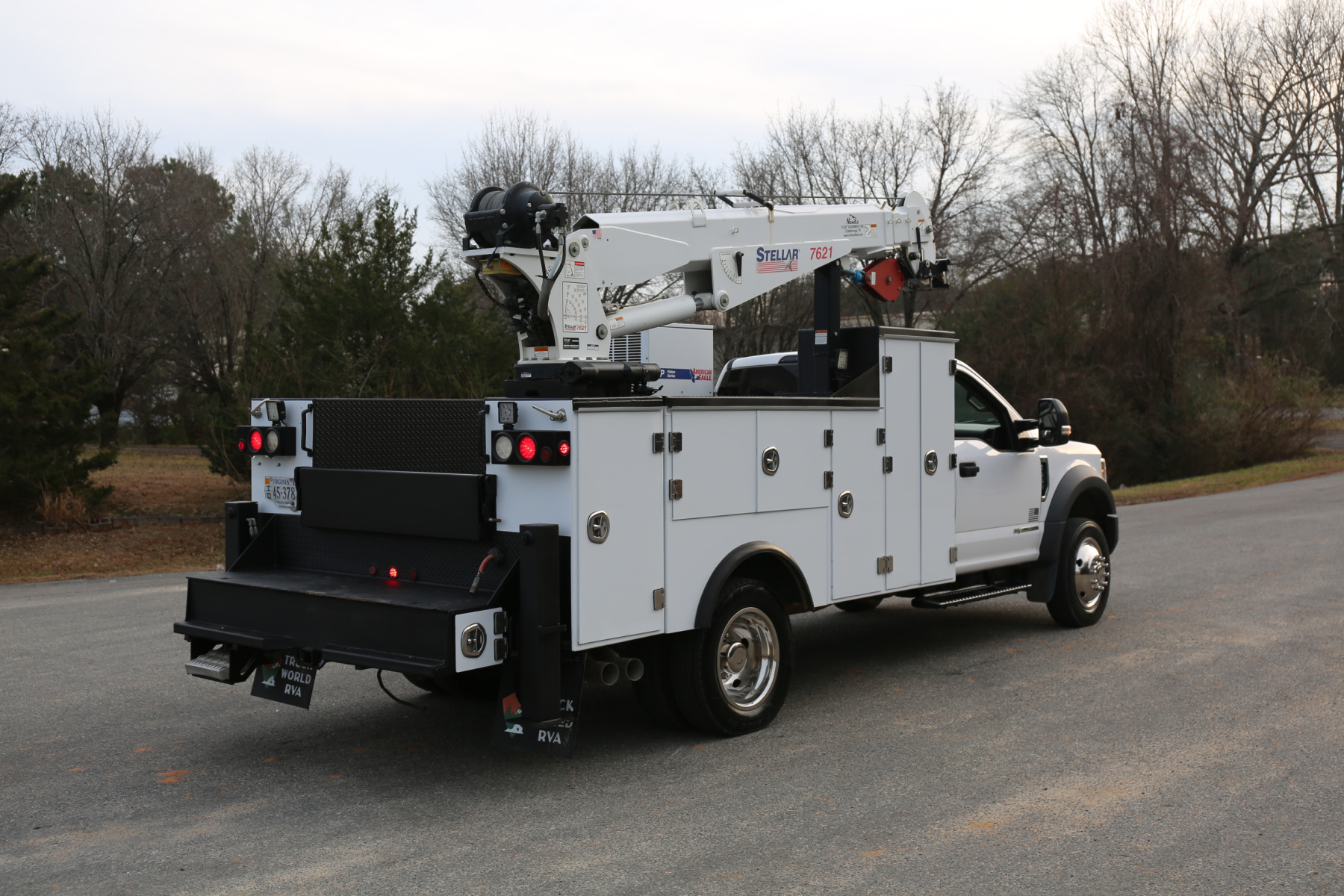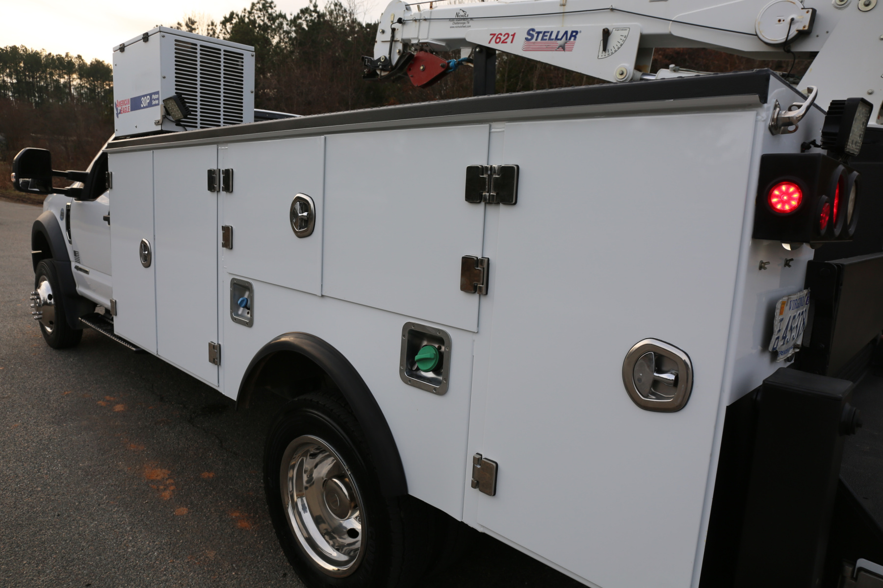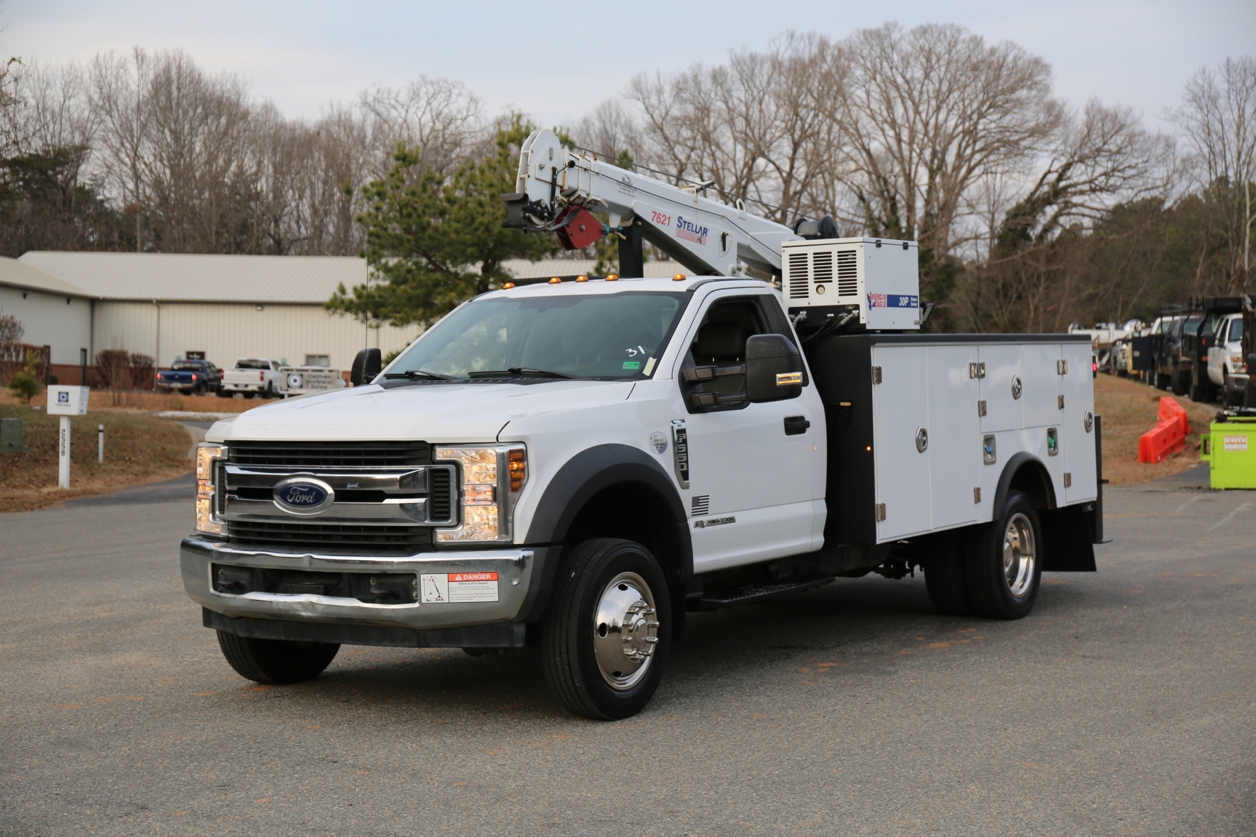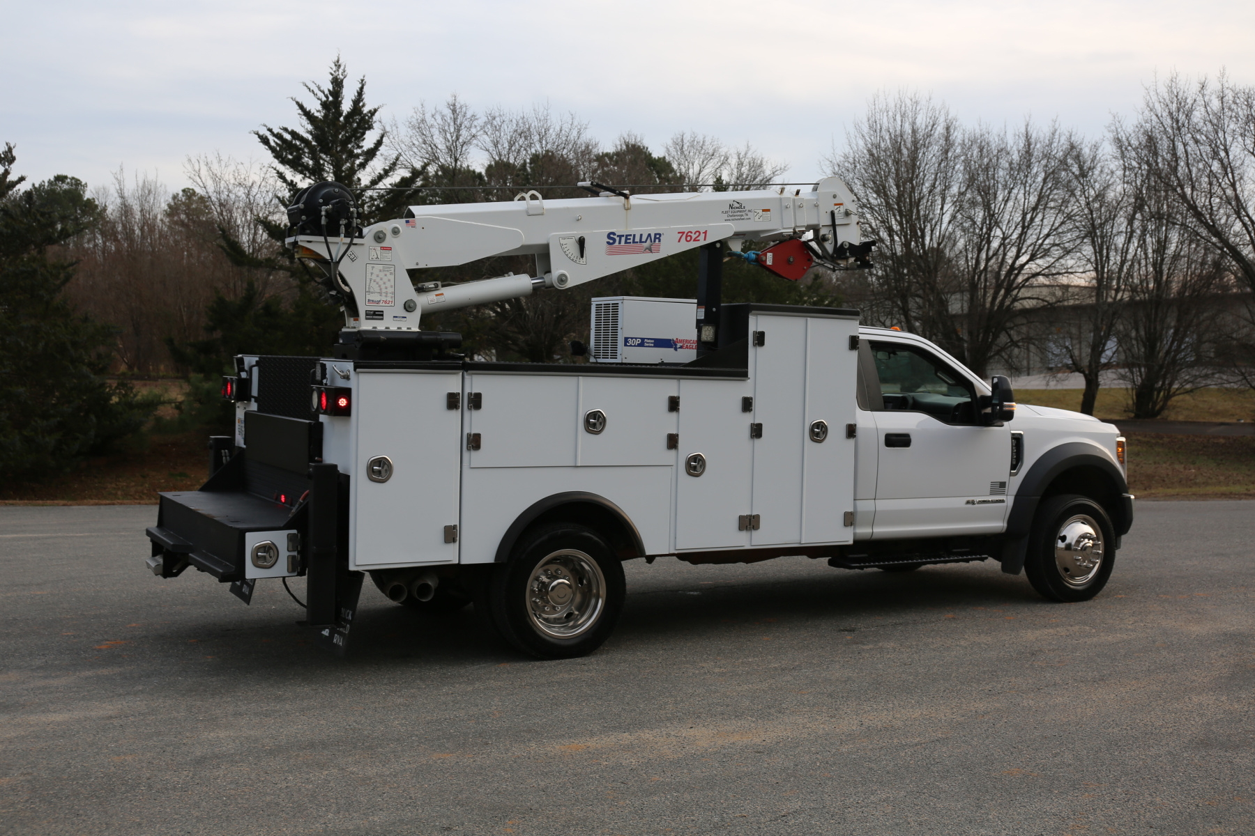 Equipped with an 11′ Stellar TMAX service body, a Stellar 7621 crane run off a factory wireless remote, an American Eagle 30P hydraulic compressor, hydraulic outriggers, one set of American Eagle drawers, and one set of bolt bins. All of the equipment works as it should.